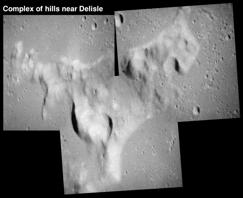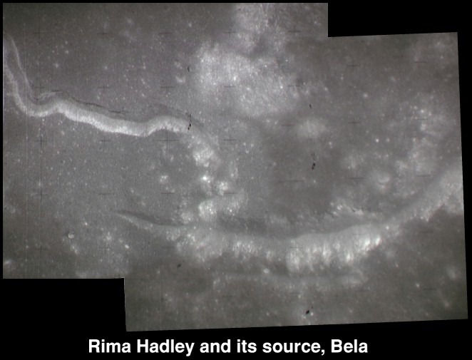 Conon Crater at the bottom of frame. The arcuate depression, Bela is at the centre of frame with crater Hadley C seen impinging on Hadley Rille. The Fresnel Rilles are at the top of the image.