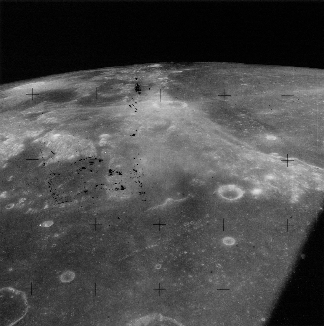 The dark floor and west rim of Tsiolkovsky Crater, and furrowed ground beyond. Composite of frames AS15-97-13161 to 13168.