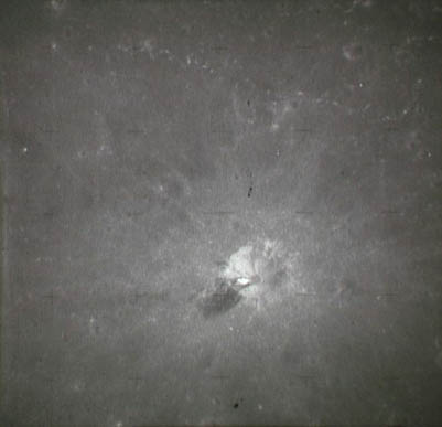 Half of a stereo pair taken just west of the landing site. Crater Conon is at the bottom of the frame, Rima Hadley and Hadley C crater are near the centre and north of the Fresnel Rilles, the fading rays from the large crater Autolycus are visible on the surface of Mare Imbrium. The crater itself is just off to the left of the image.AS15-9814P.jpg (504k)