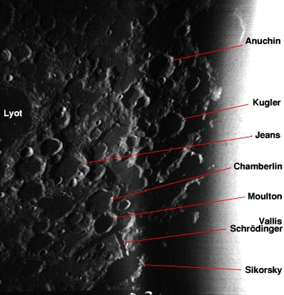 Labelled view of Tranquillity Base ("Statio Tranquillitatis"), the Apollo 11 landing site, and surrounding landmark craters, on the southern shore of the Sea of Tranquillity. Composite of frames AS15-97-13284 to 13287.tsiolkovsky-eastrim.jpg (86k)