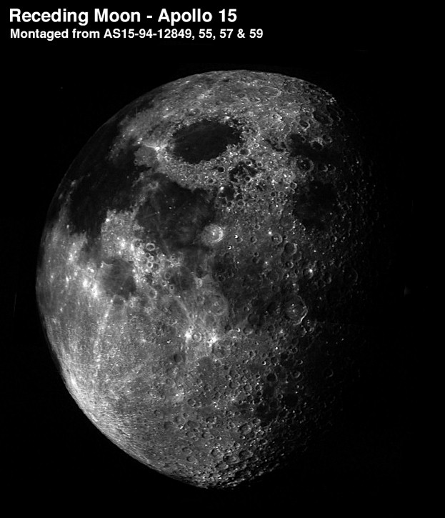 View of the receding half Moon during transearth coast. Humboldt Crater is in the centre and the large dark area at the top is Smyth's Sea.AS15-0393M.jpg (229k)