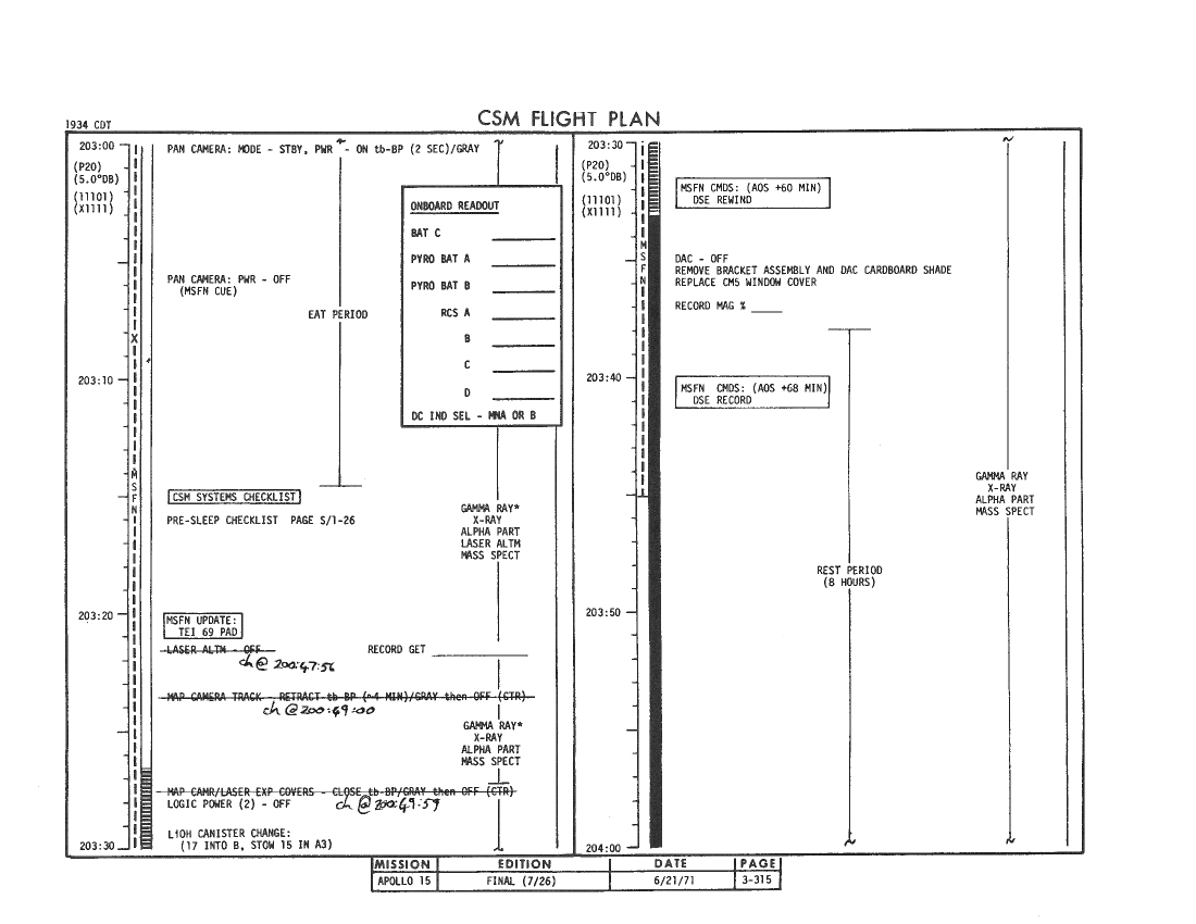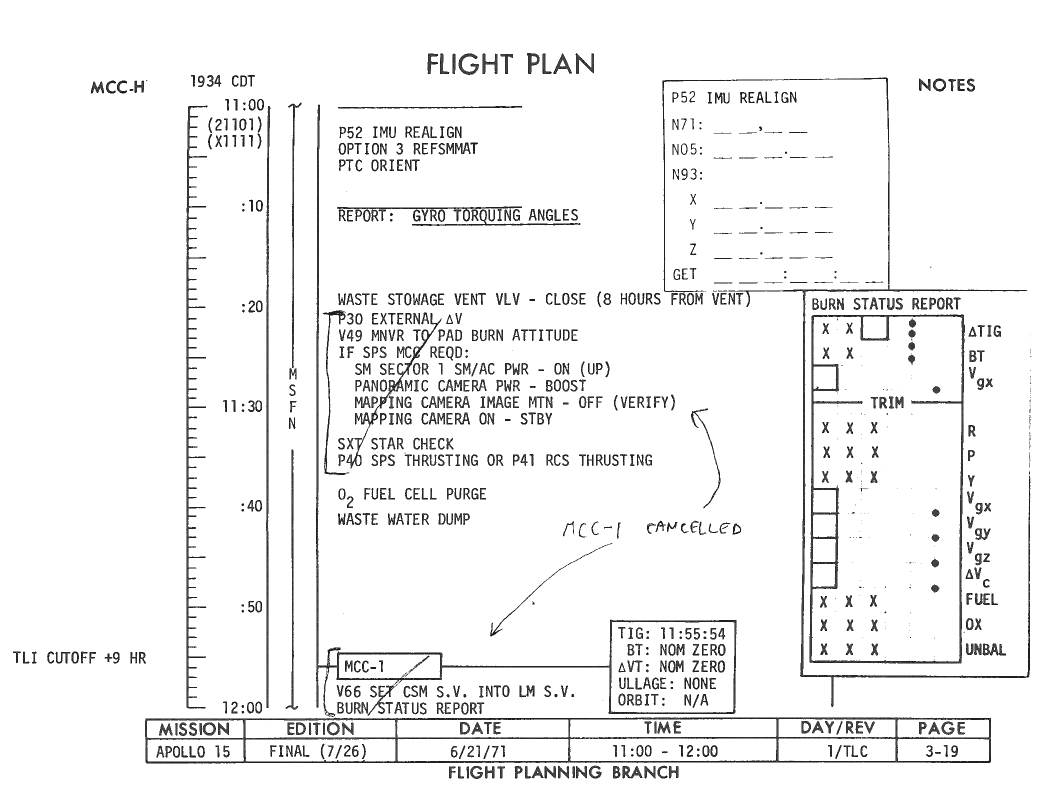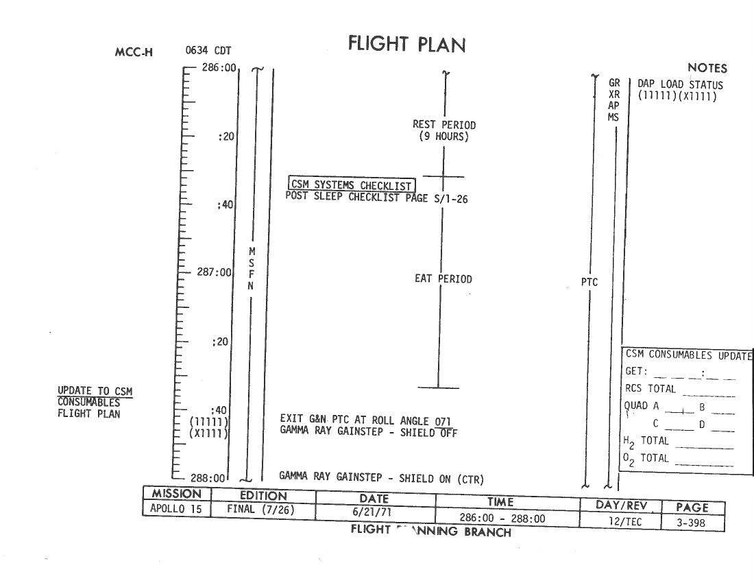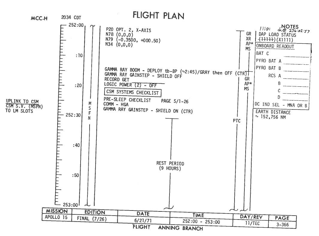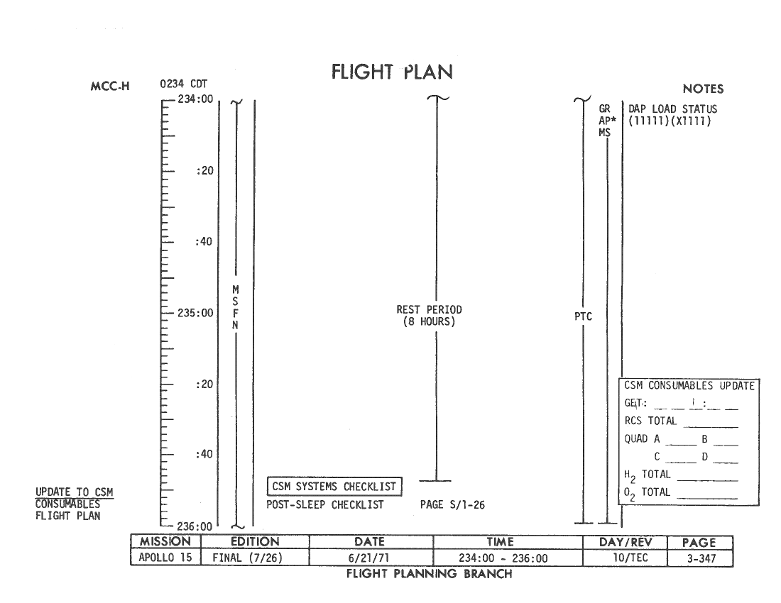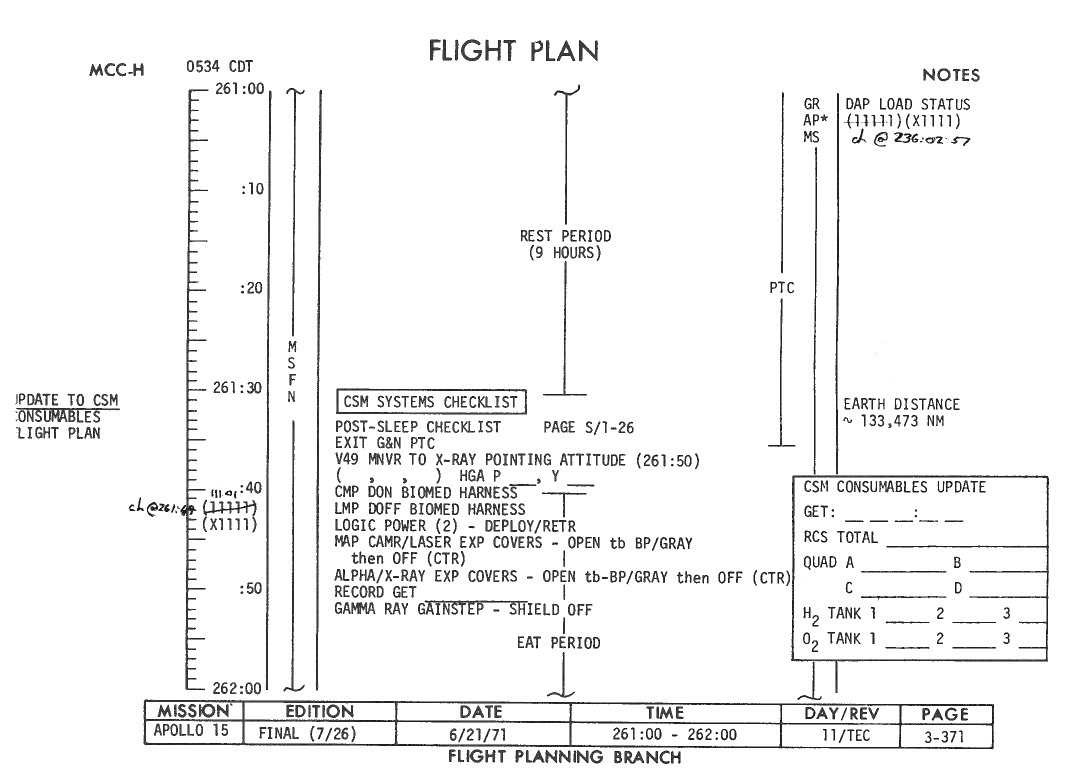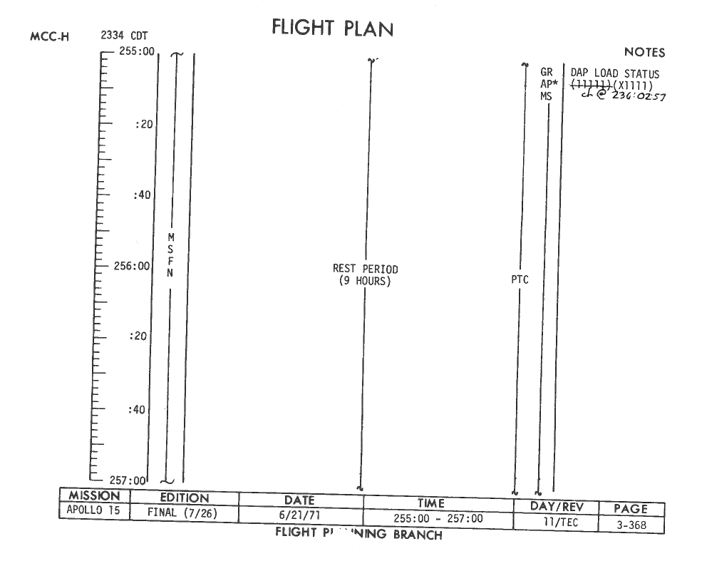 All hand-written additions in this copy of the Flight Plan were made by David Woods during the compilation of this Journal and largely represent the updates read to the crew during the flight.