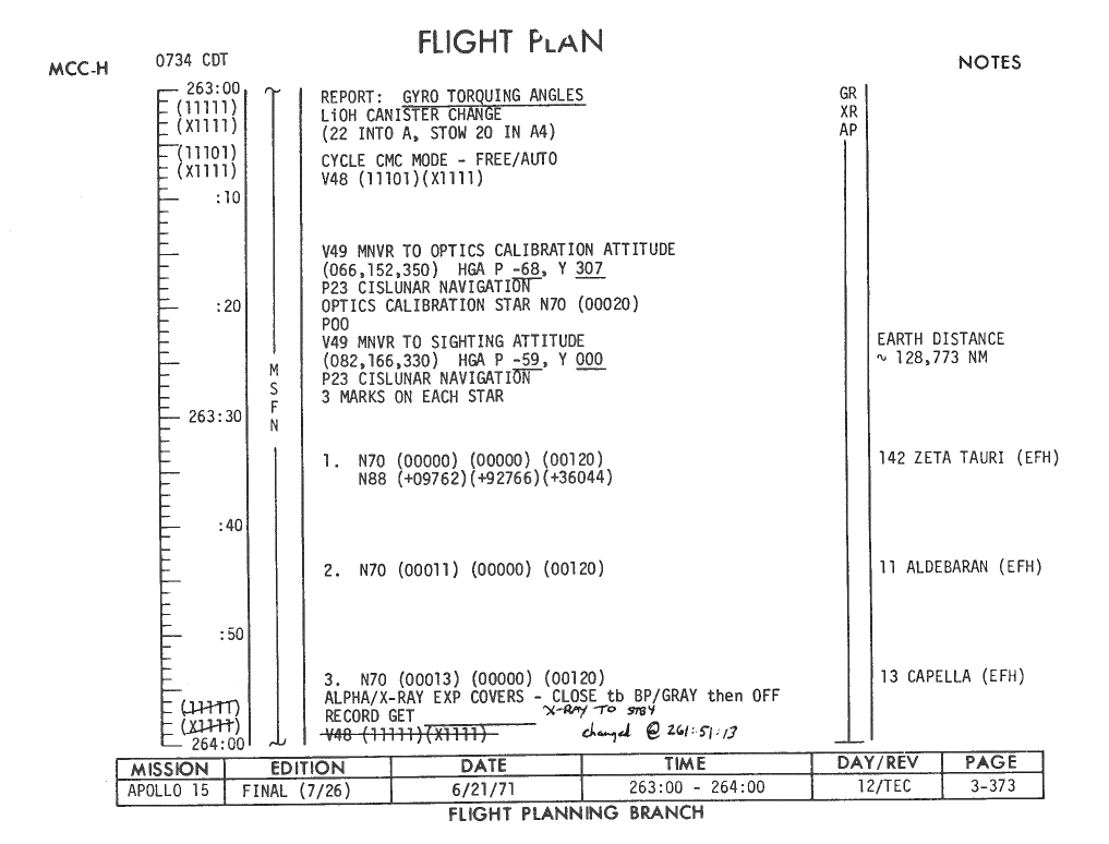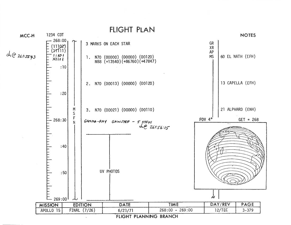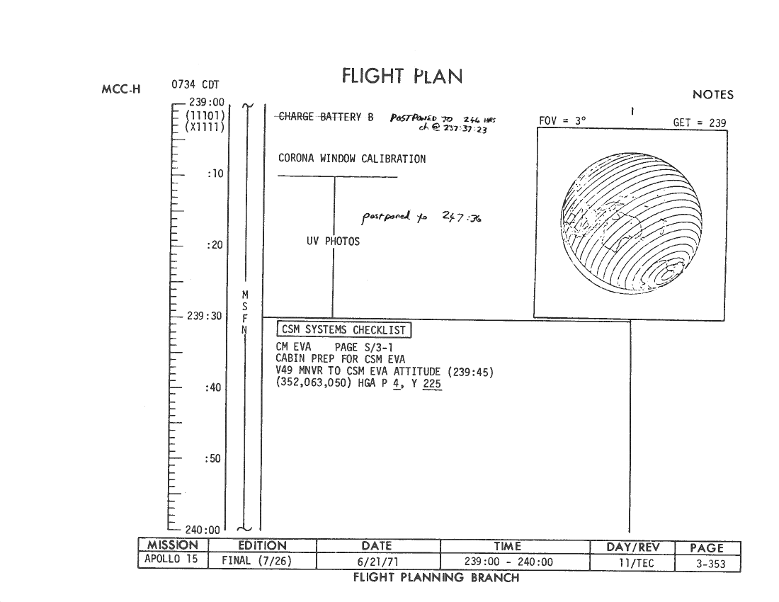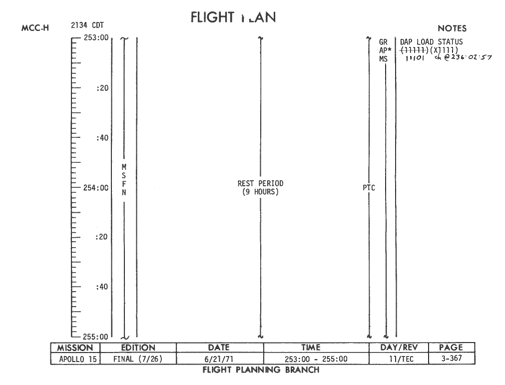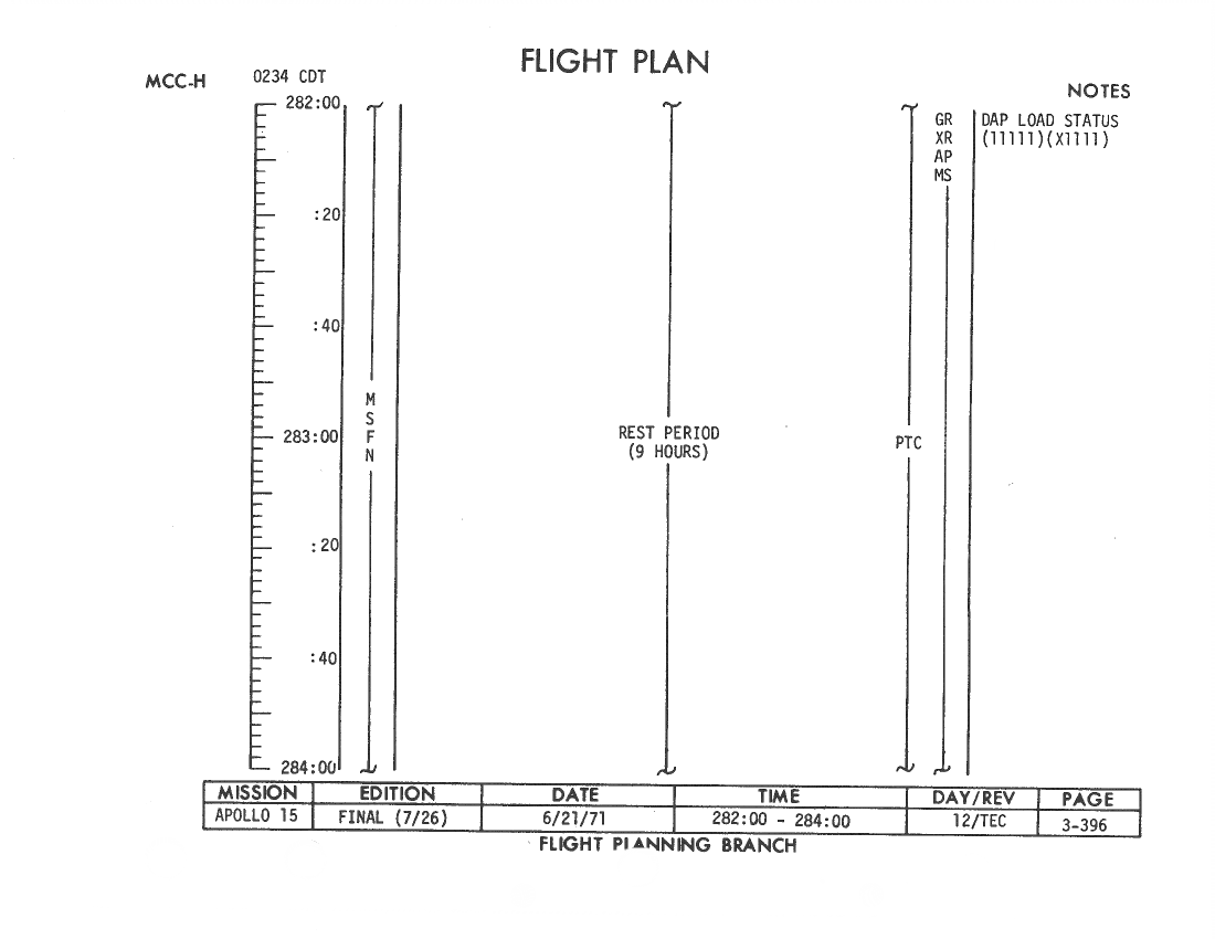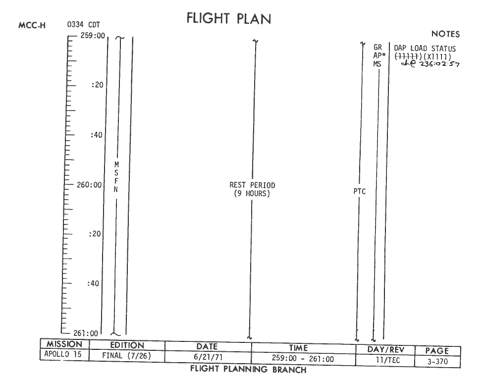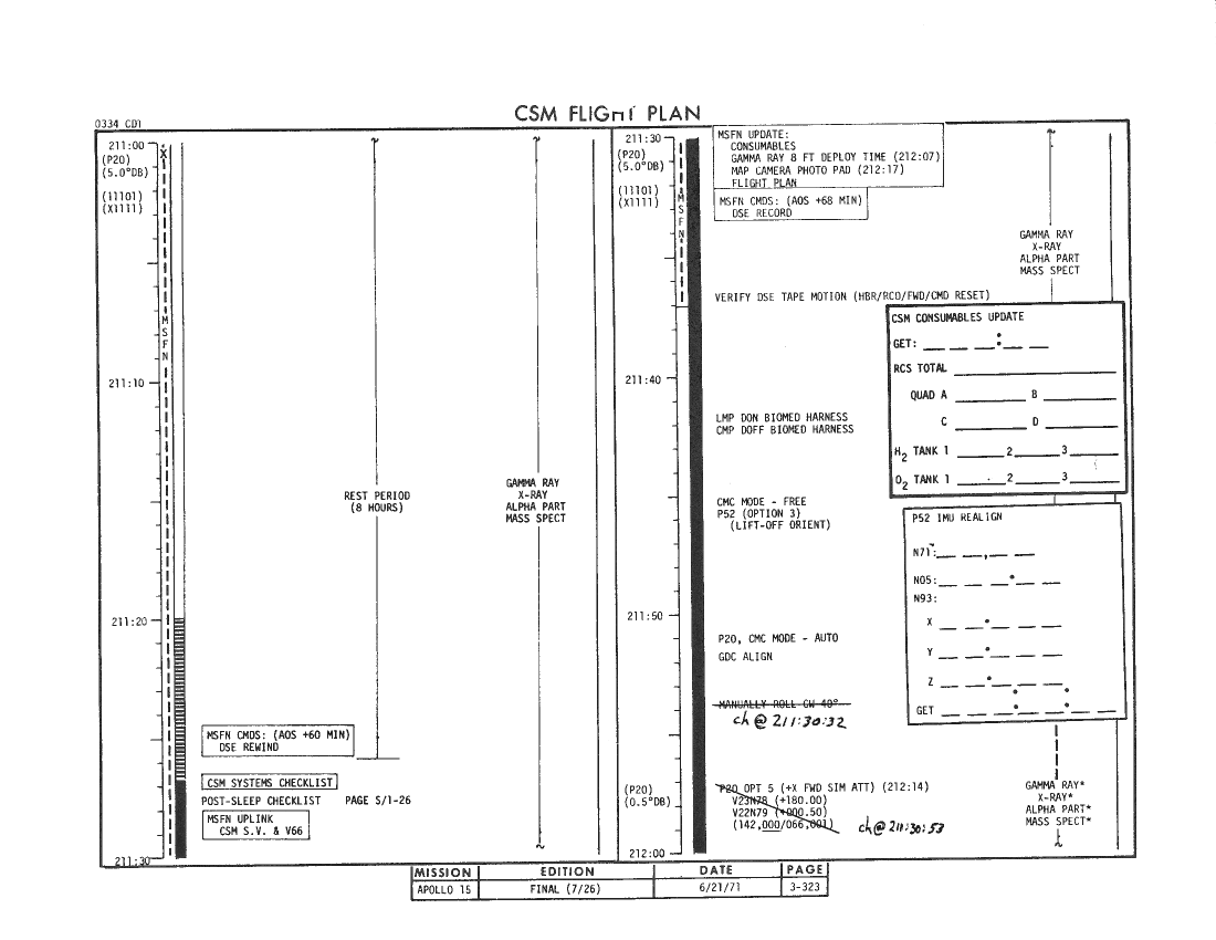 All hand-written additions in this copy of the Flight Plan were made by David Woods during the compilation of this Journal and largely represent the updates read to the crew during the flight.