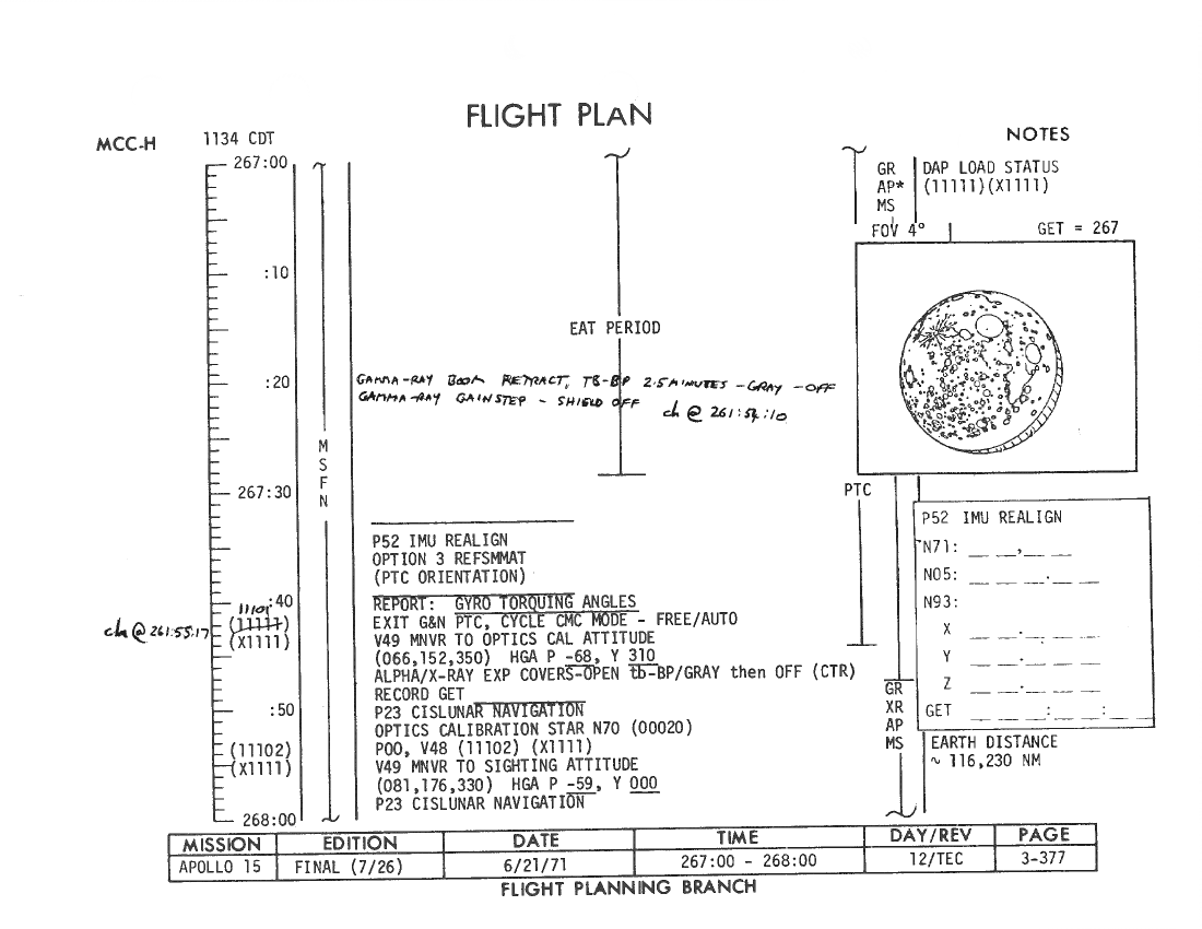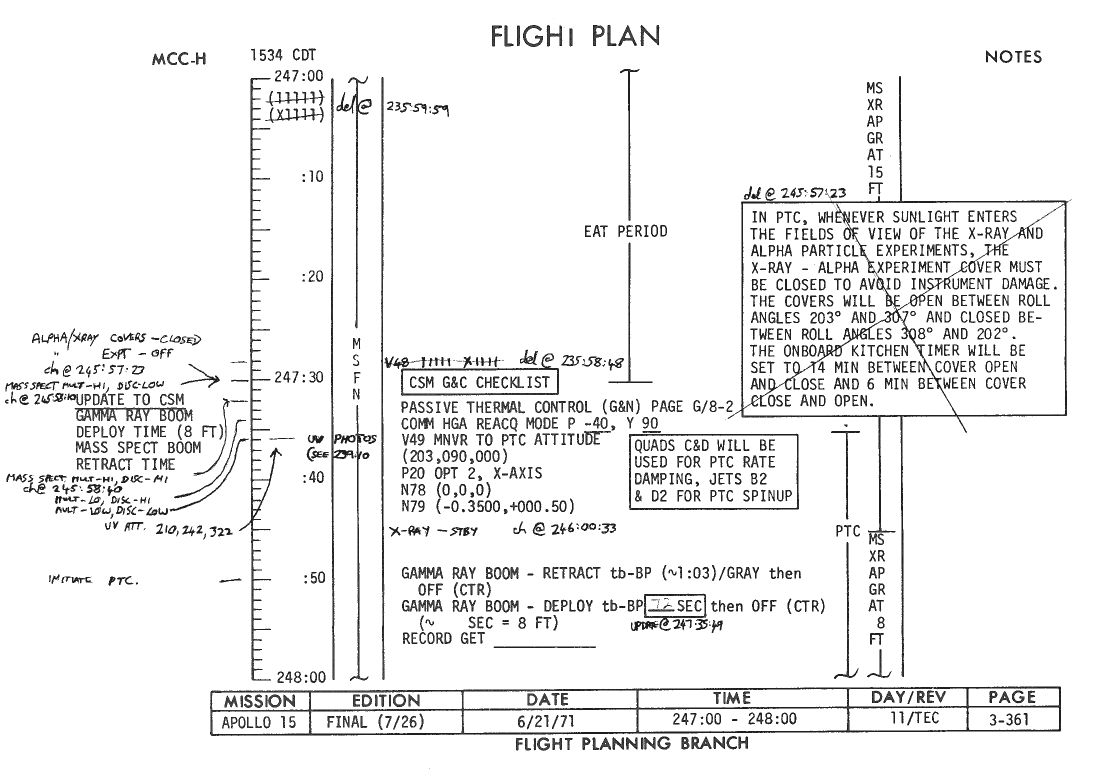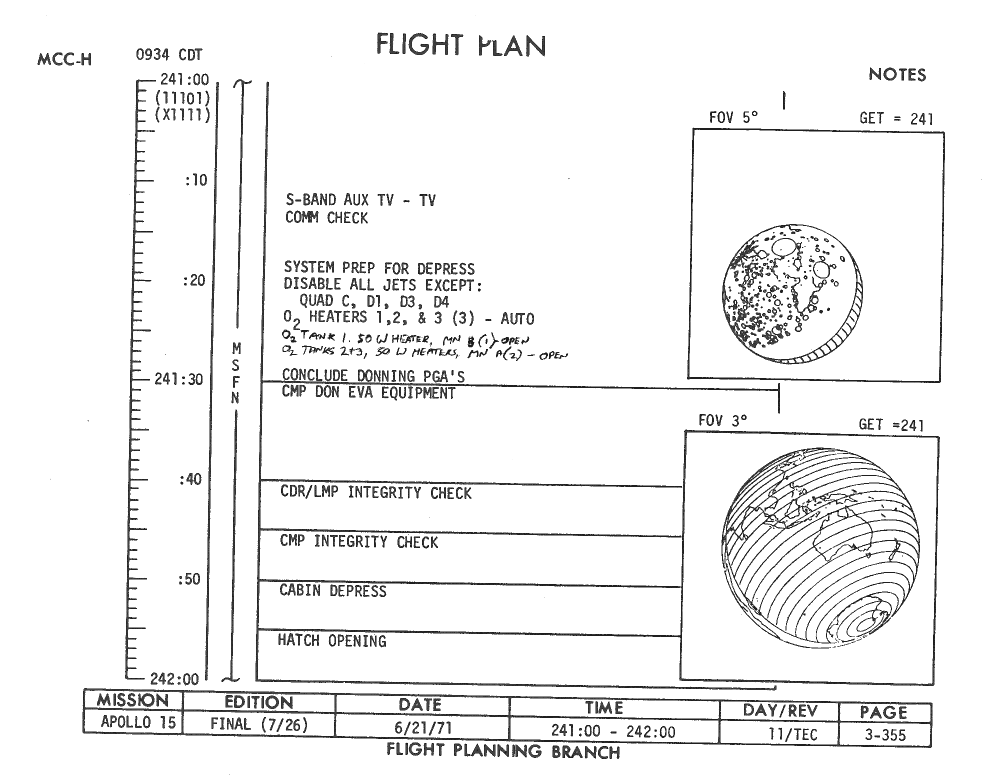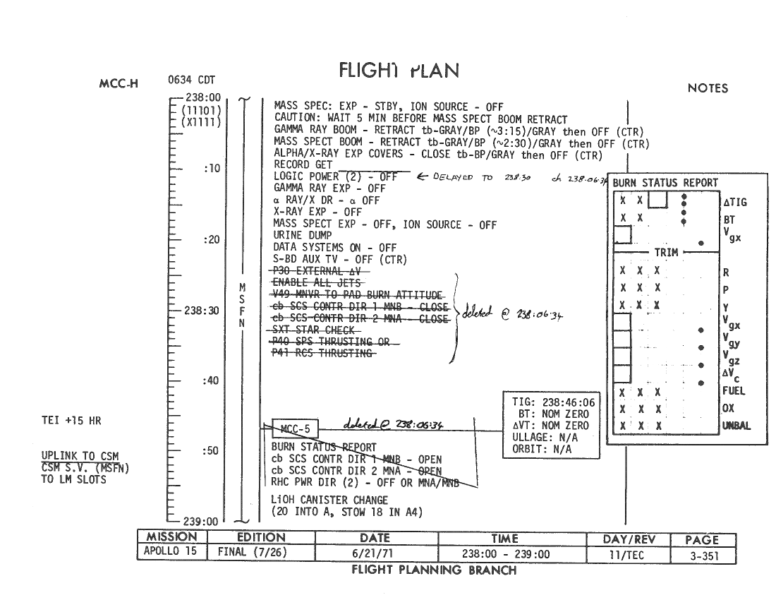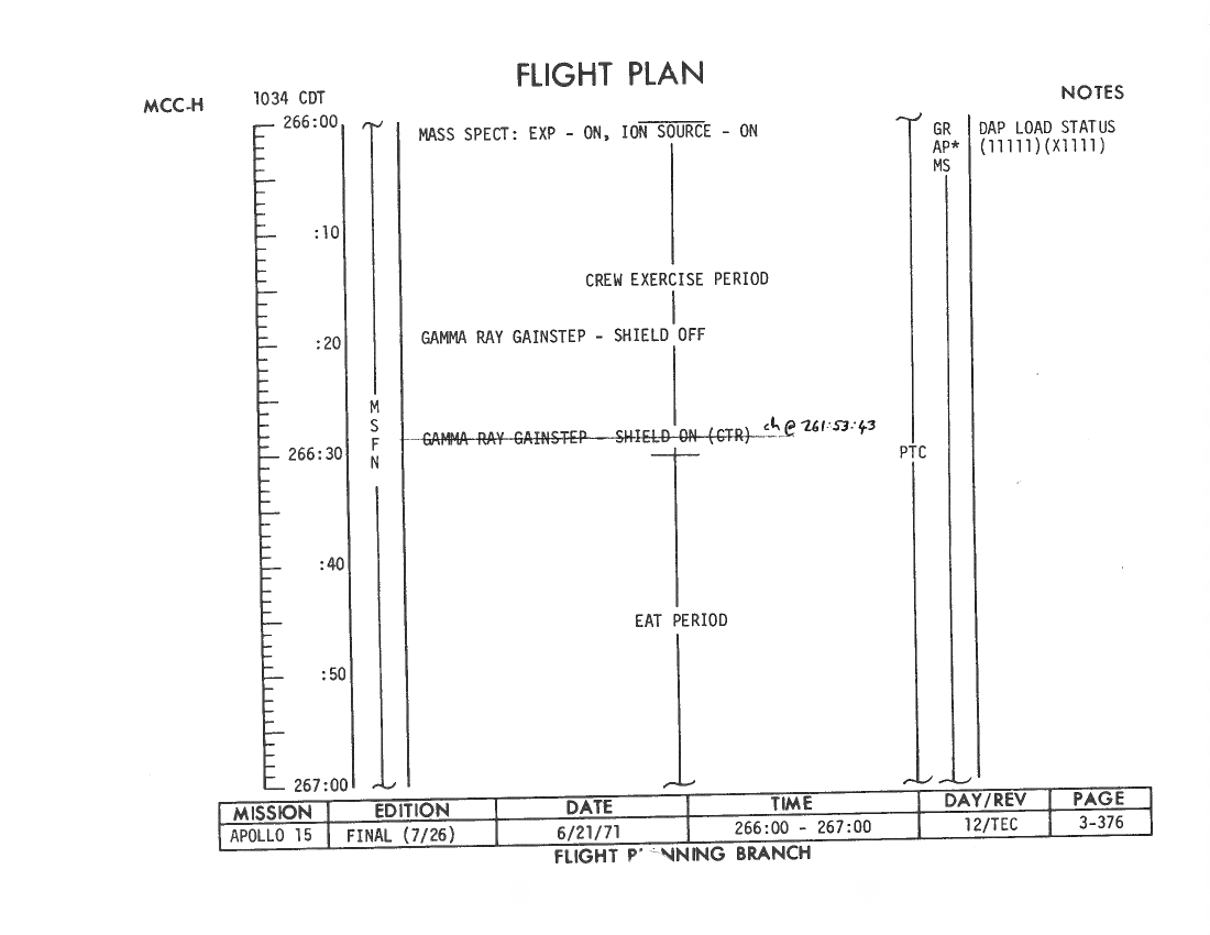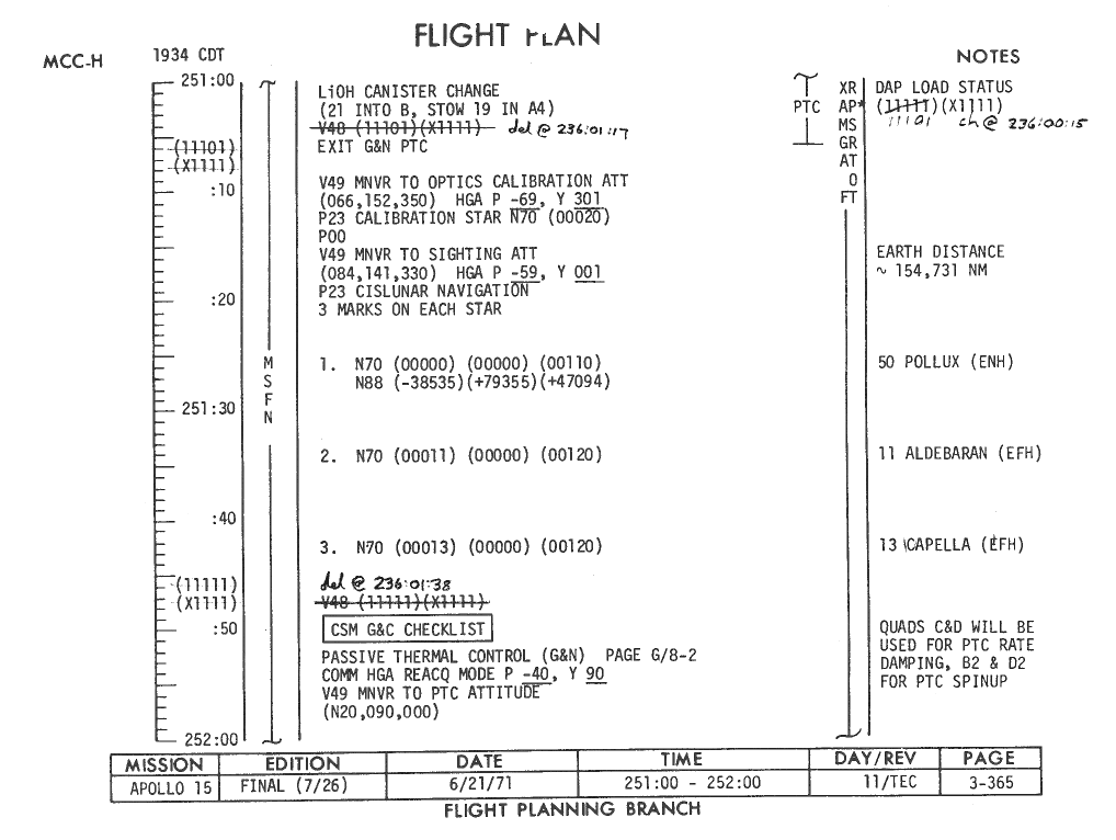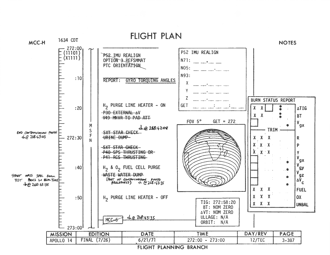 All hand-written additions in this copy of the Flight Plan were made by David Woods during the compilation of this Journal and largely represent the updates read to the crew during the flight.
