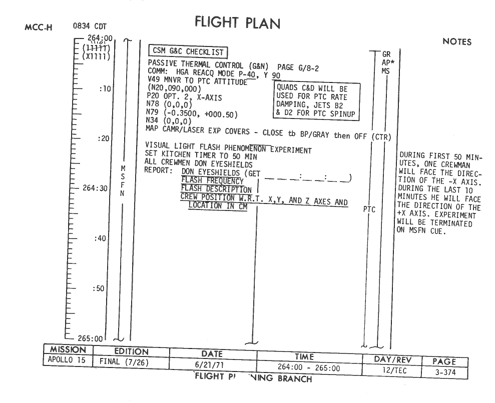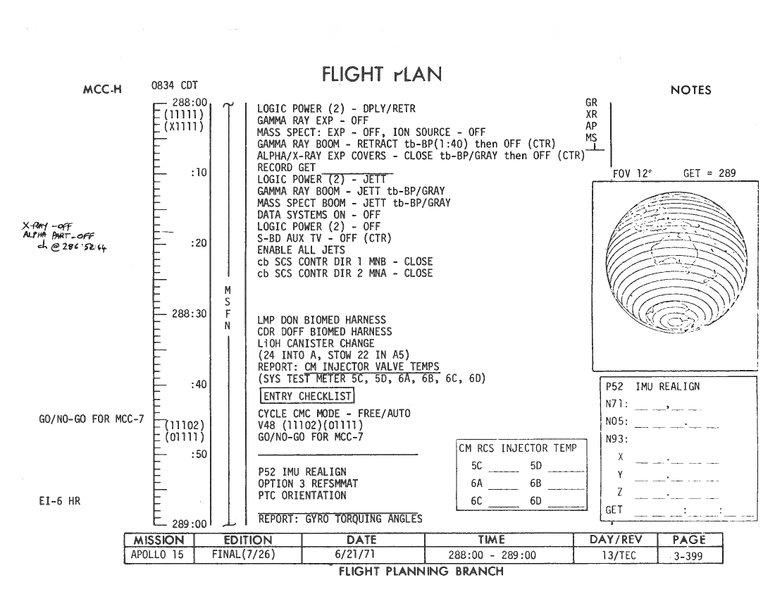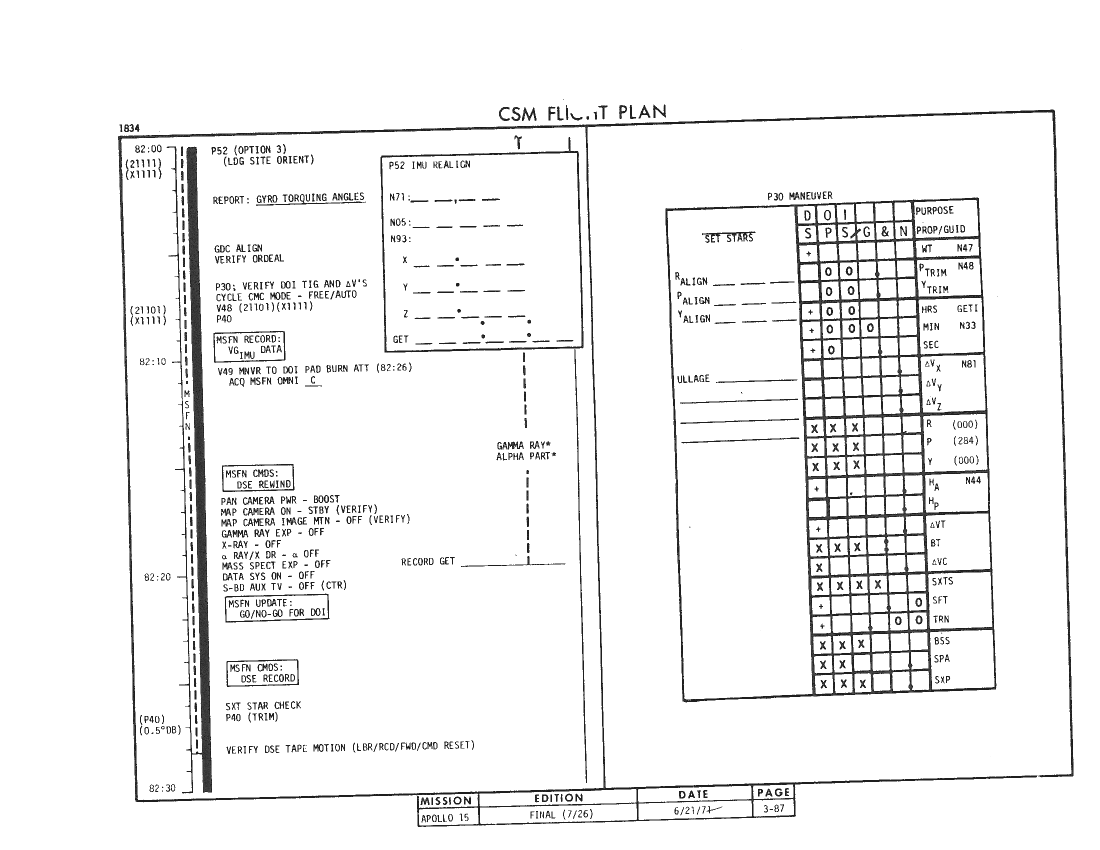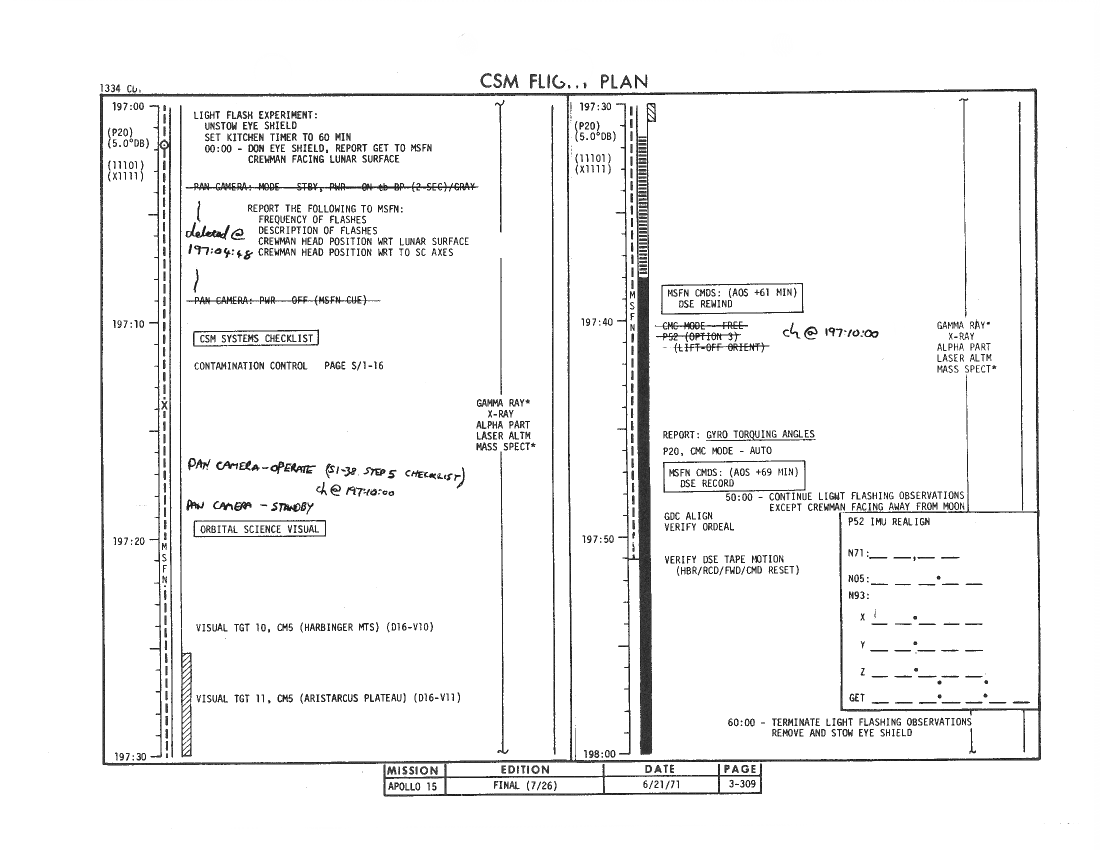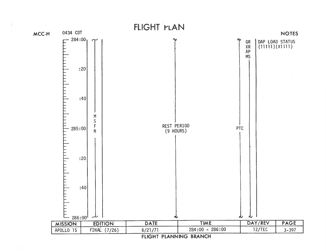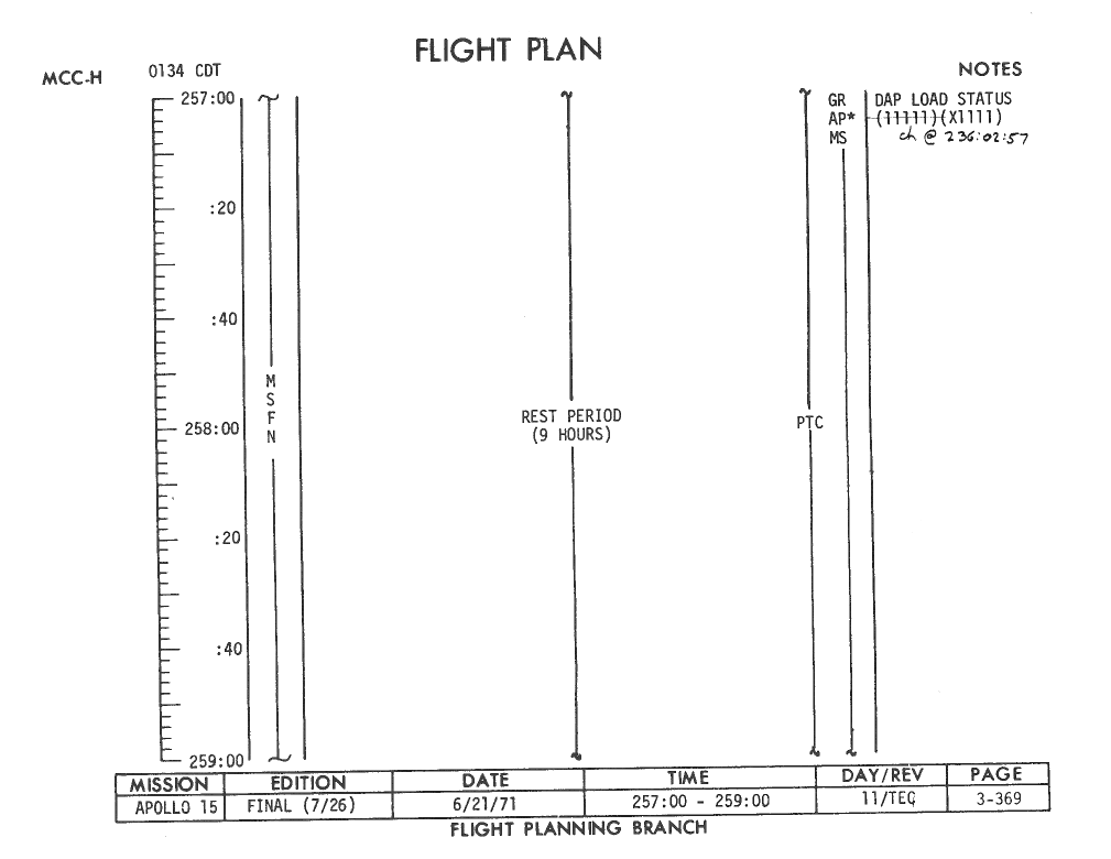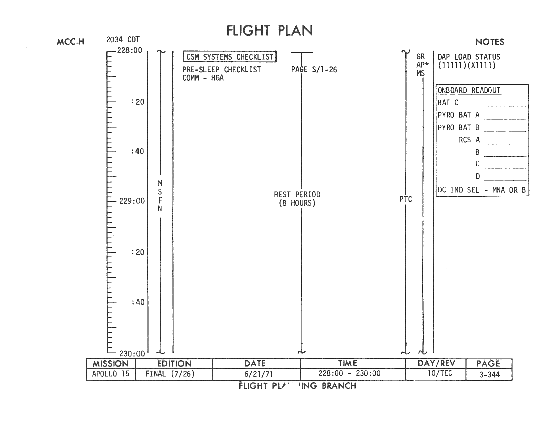 All hand-written additions in this copy of the Flight Plan were made by David Woods during the compilation of this Journal and largely represent the updates read to the crew during the flight.