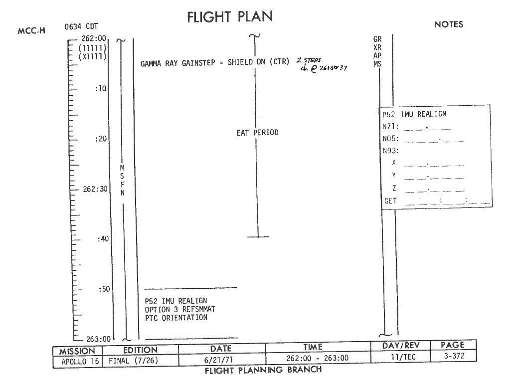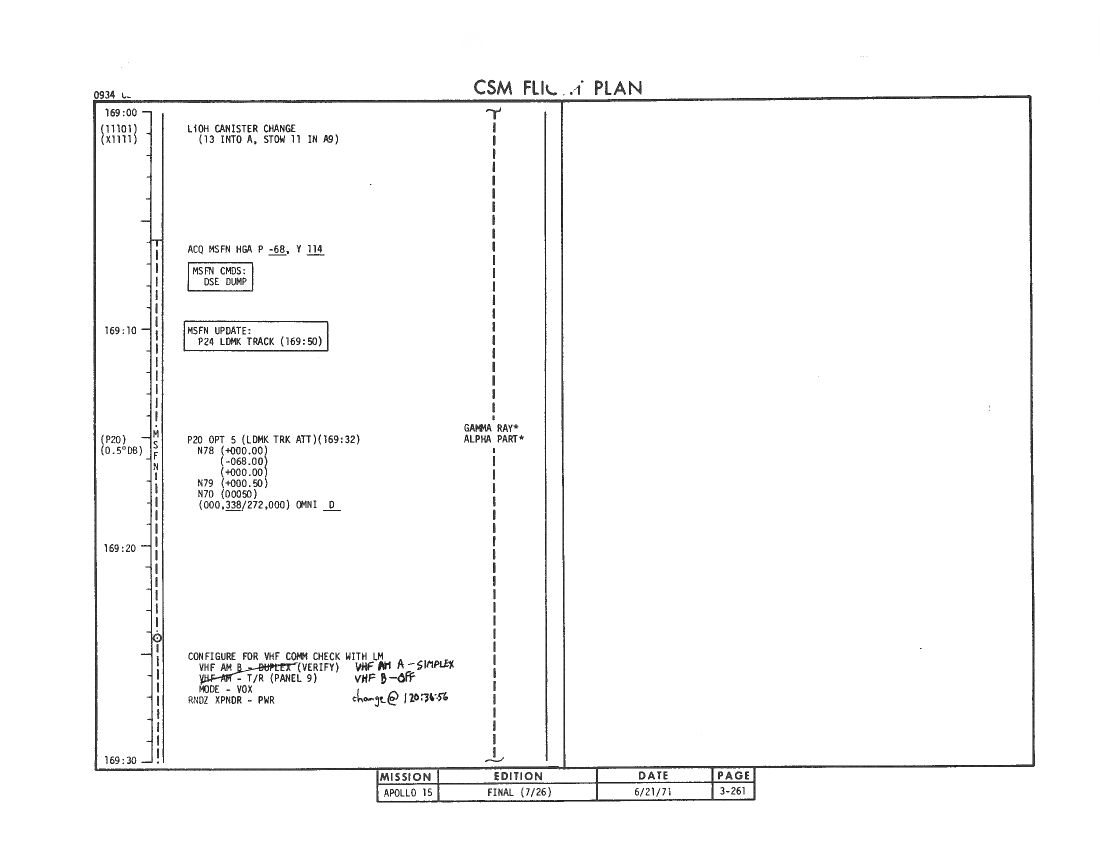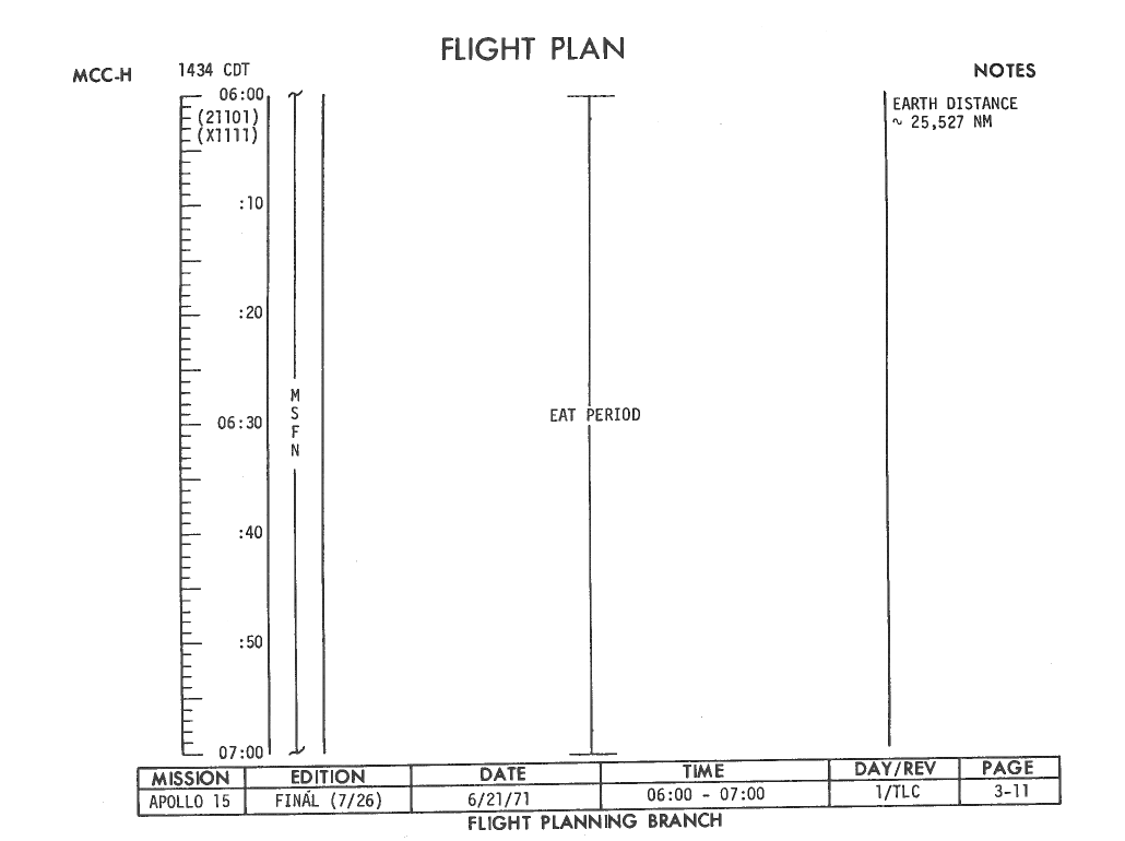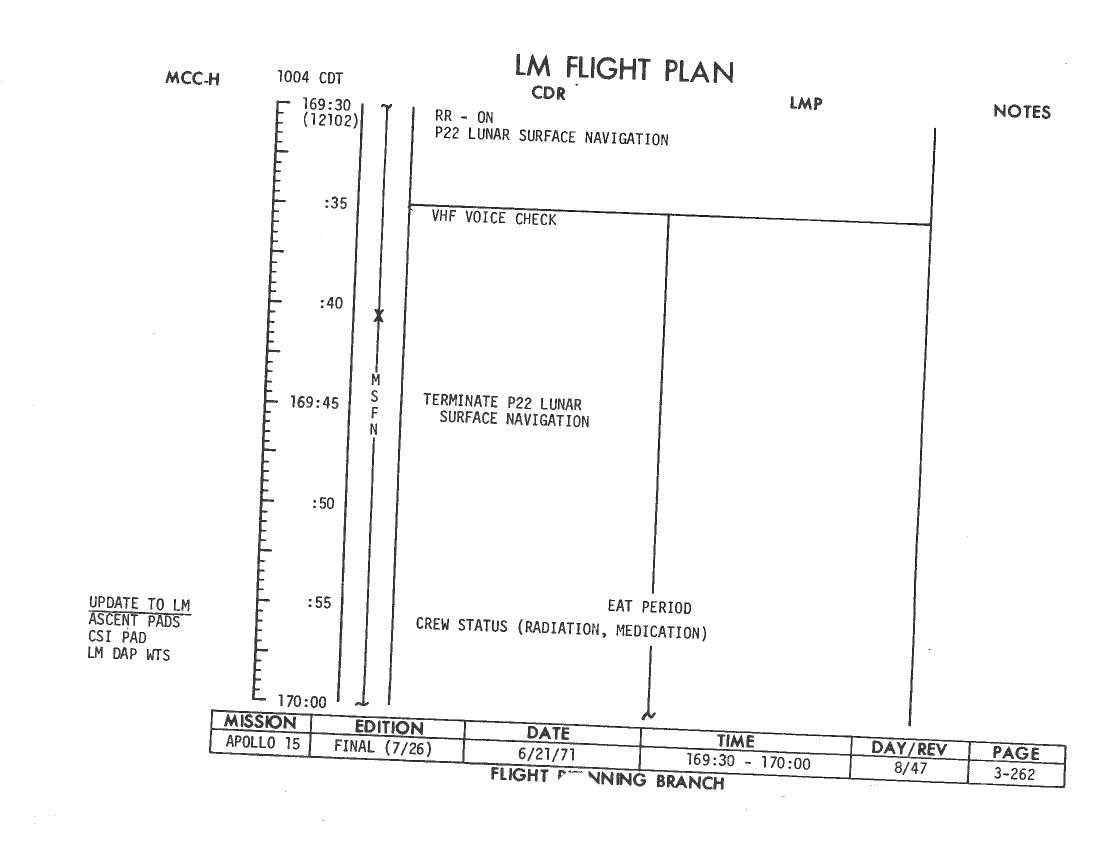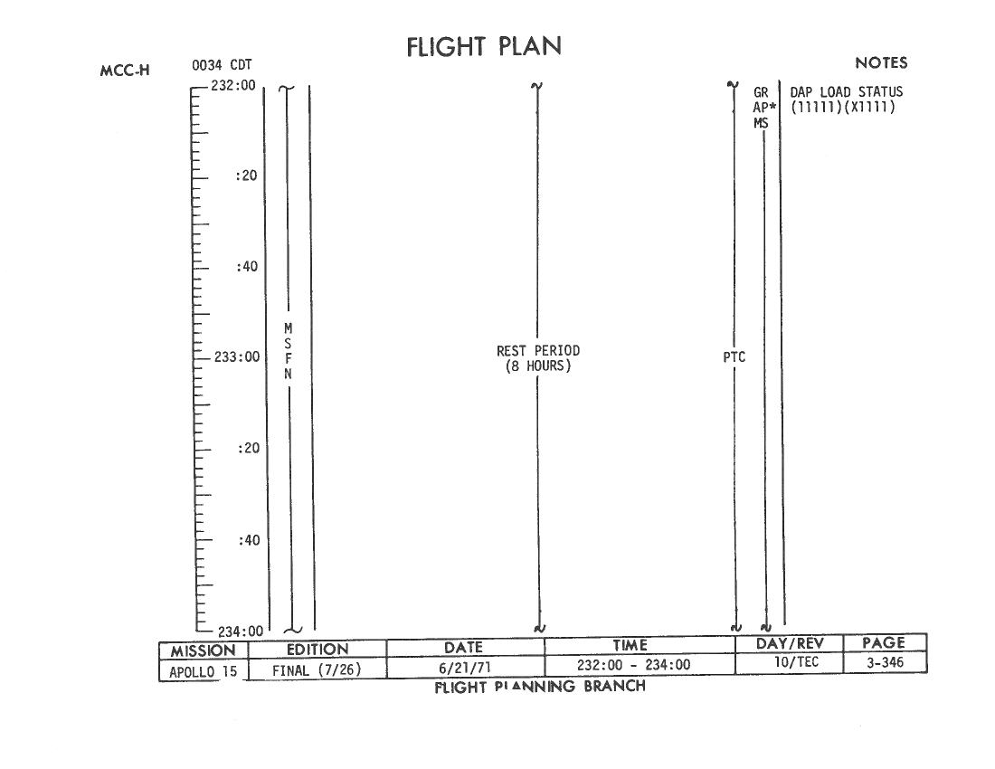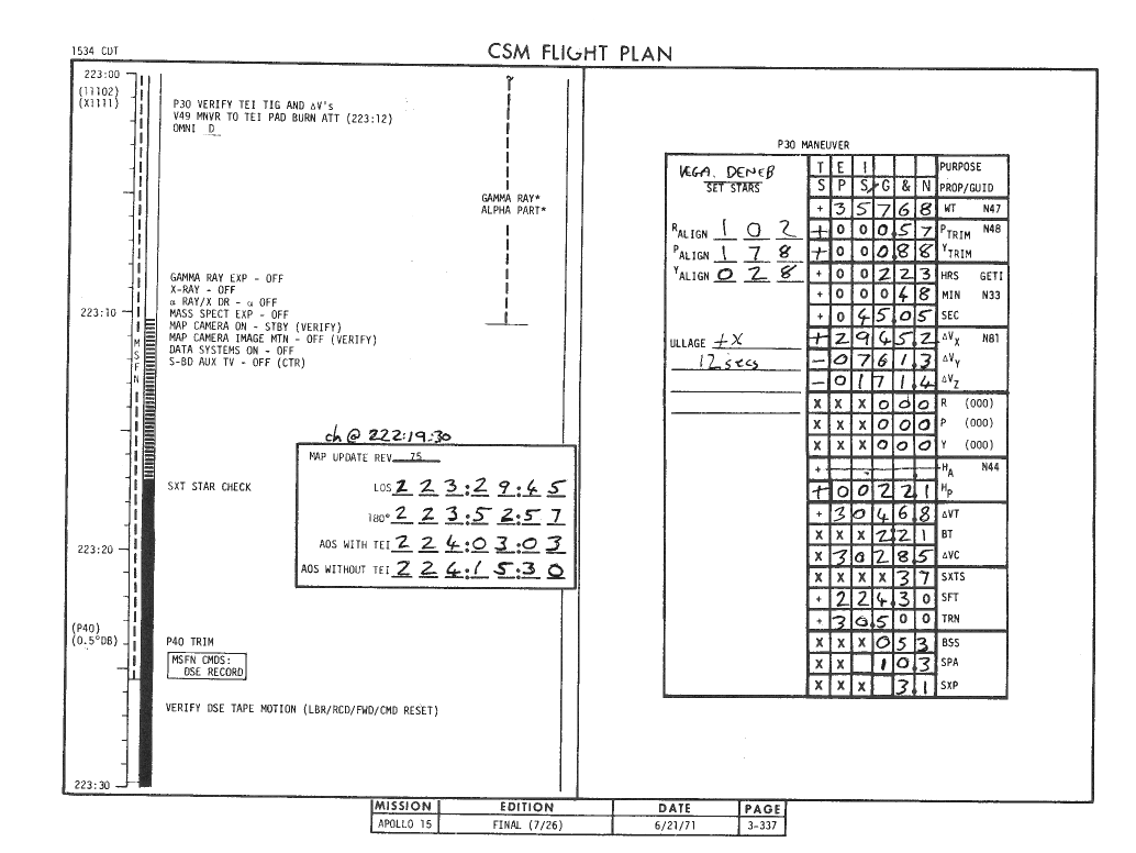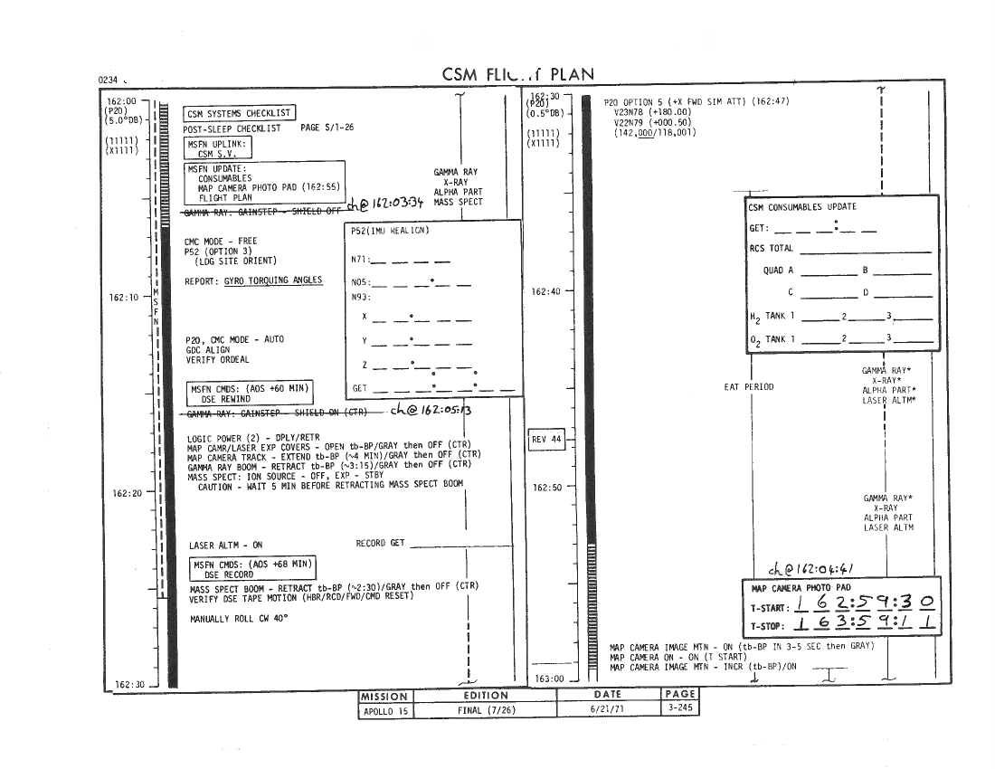 All hand-written additions in this copy of the Flight Plan were made by David Woods during the compilation of this Journal and largely represent the updates read to the crew during the flight.