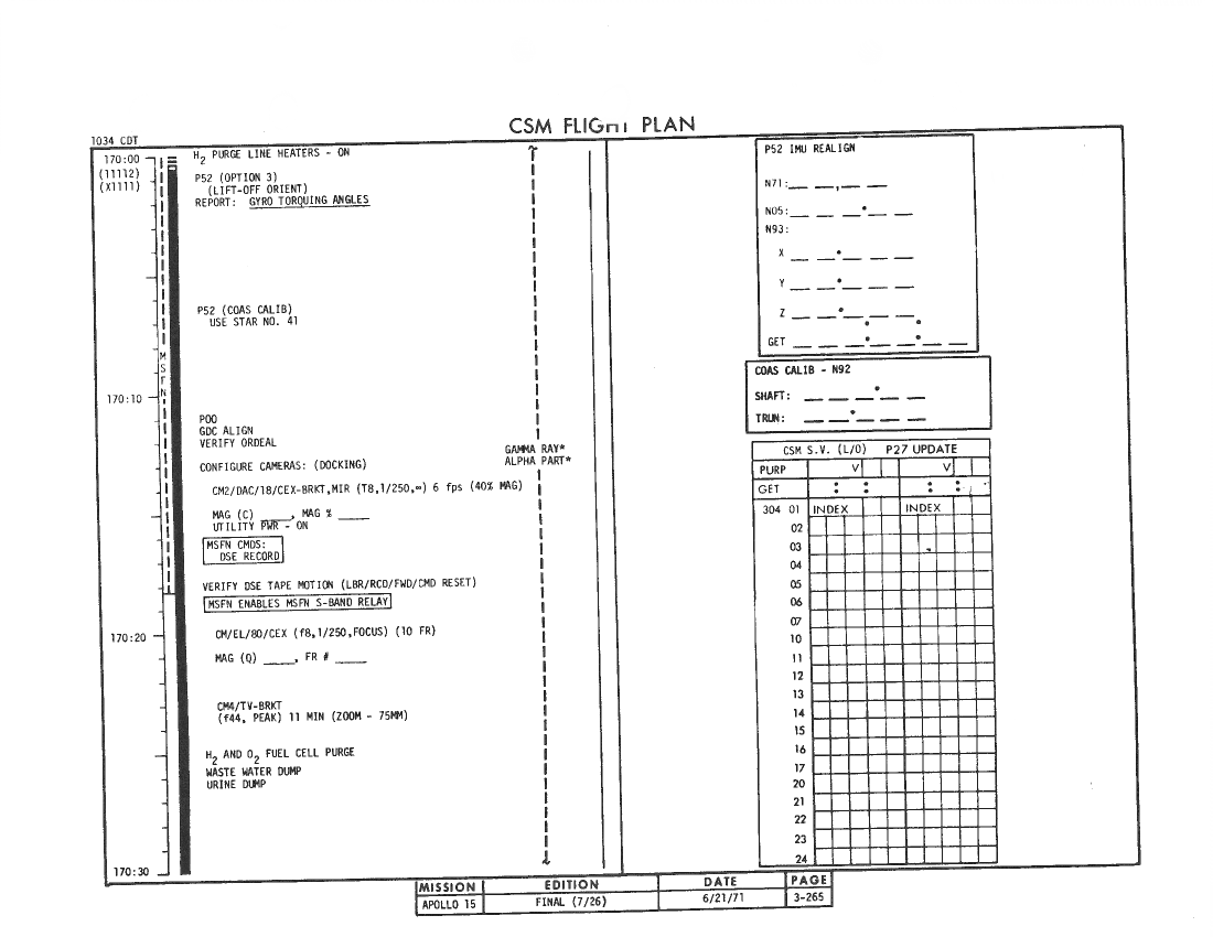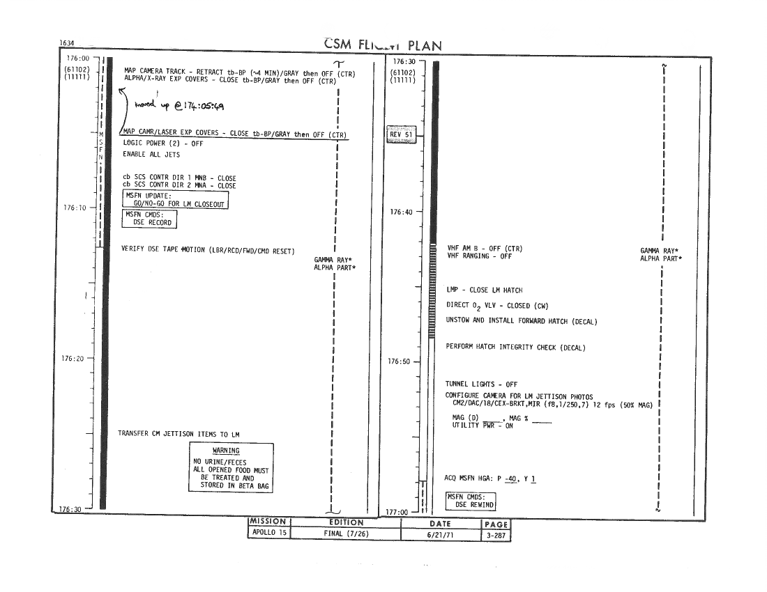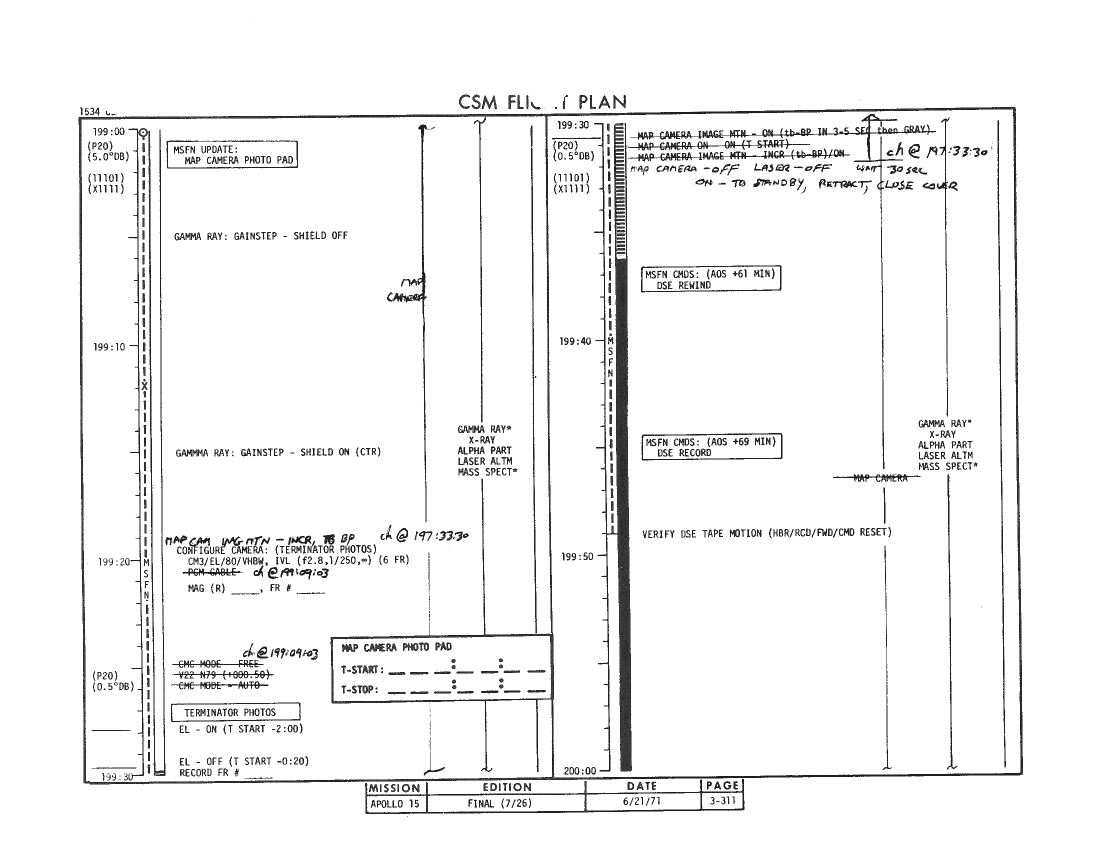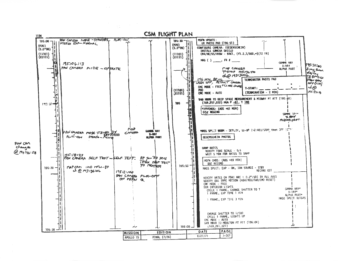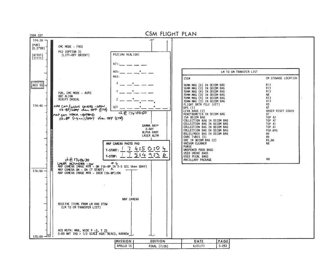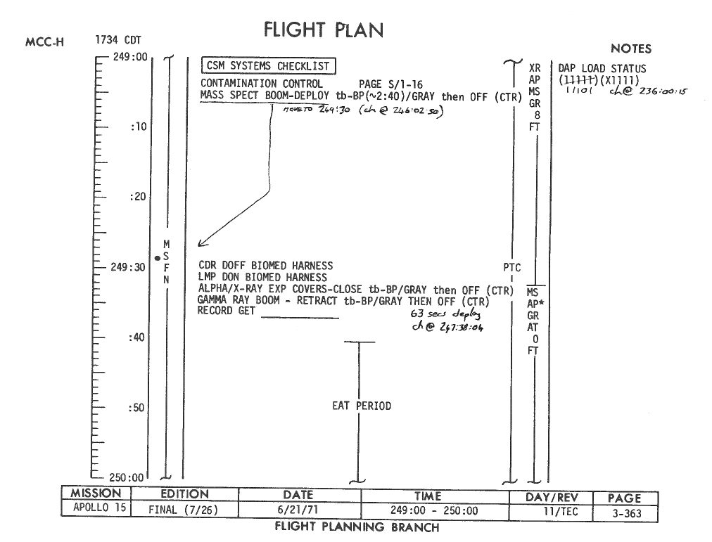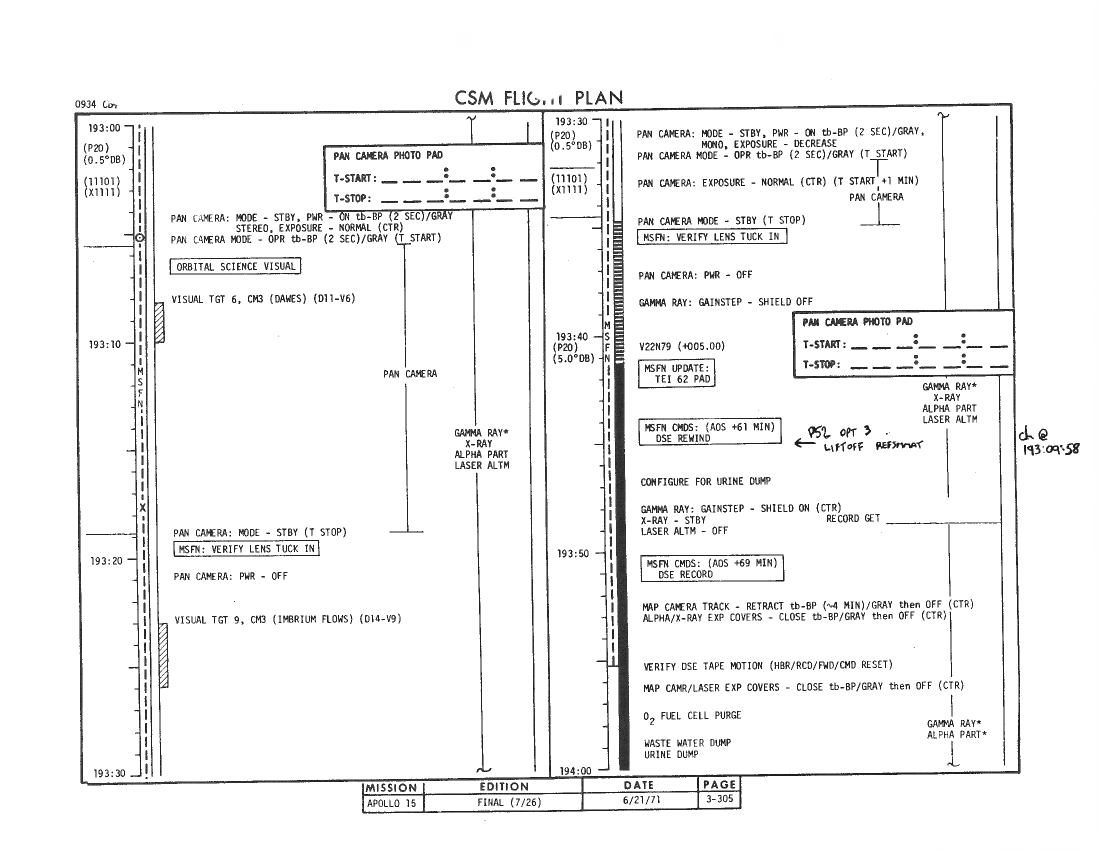 All hand-written additions in this copy of the Flight Plan were made by David Woods during the compilation of this Journal and largely represent the updates read to the crew during the flight.