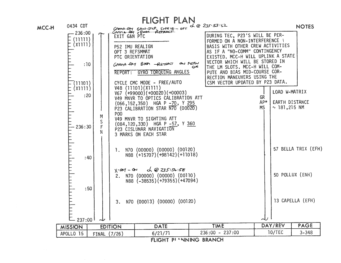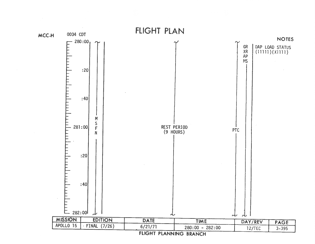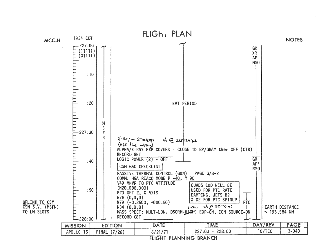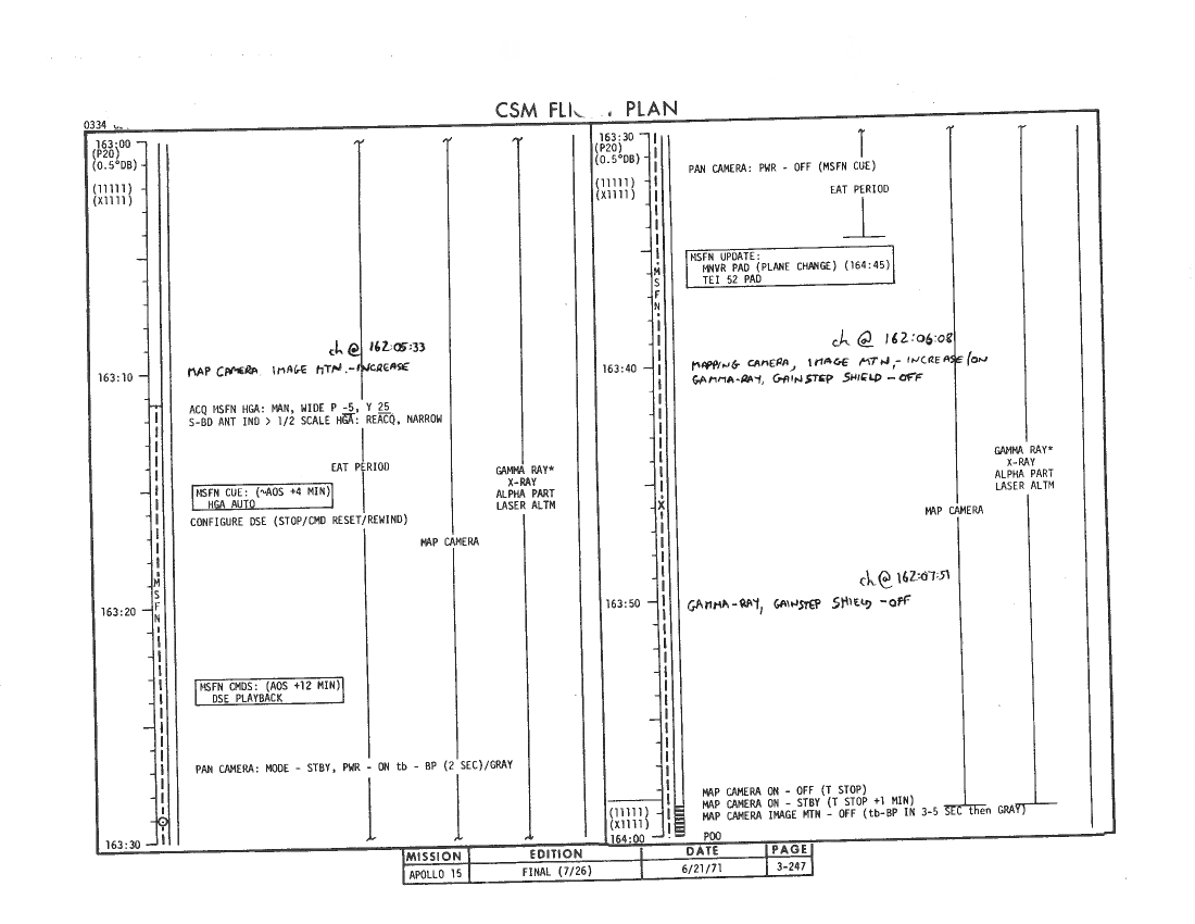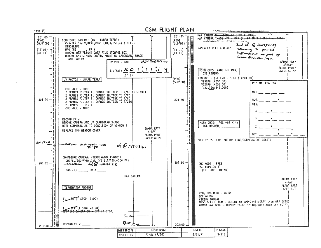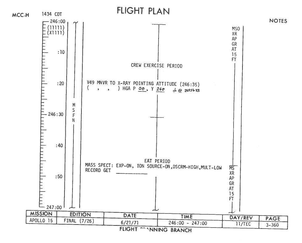 All hand-written additions in this copy of the Flight Plan were made by David Woods during the compilation of this Journal and largely represent the updates read to the crew during the flight.