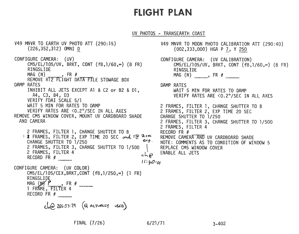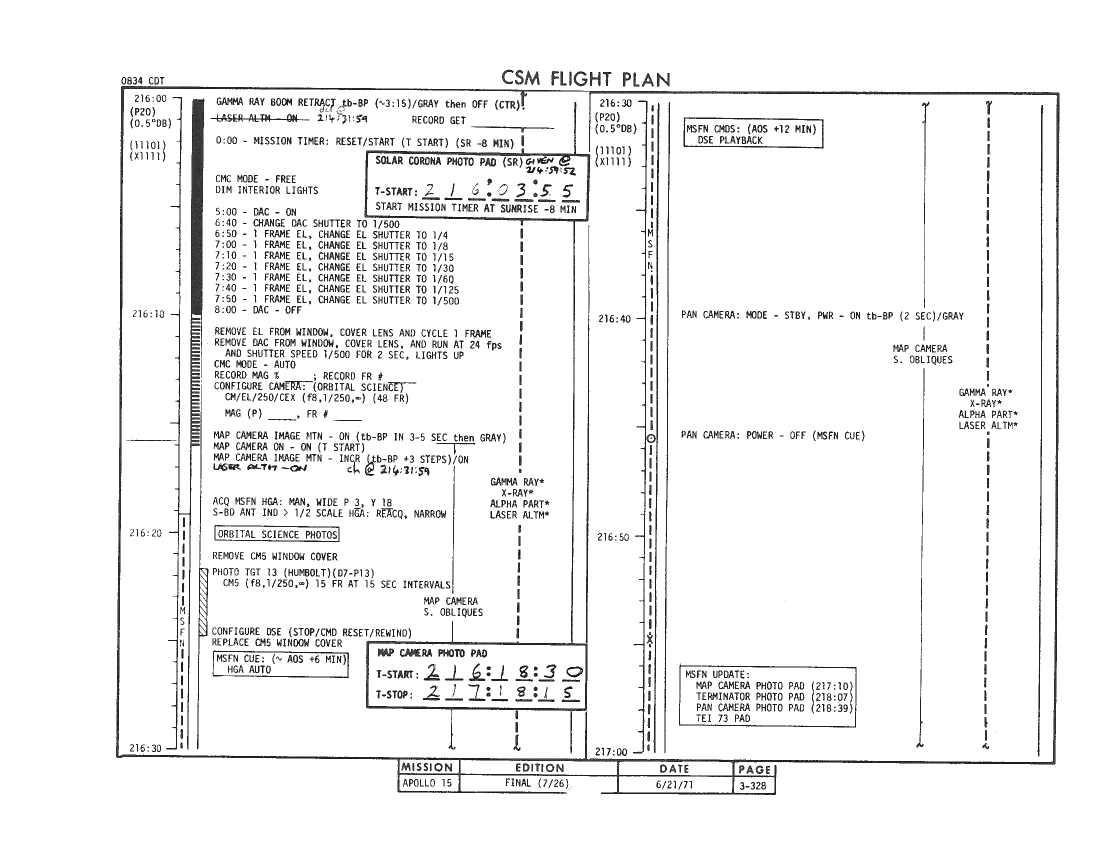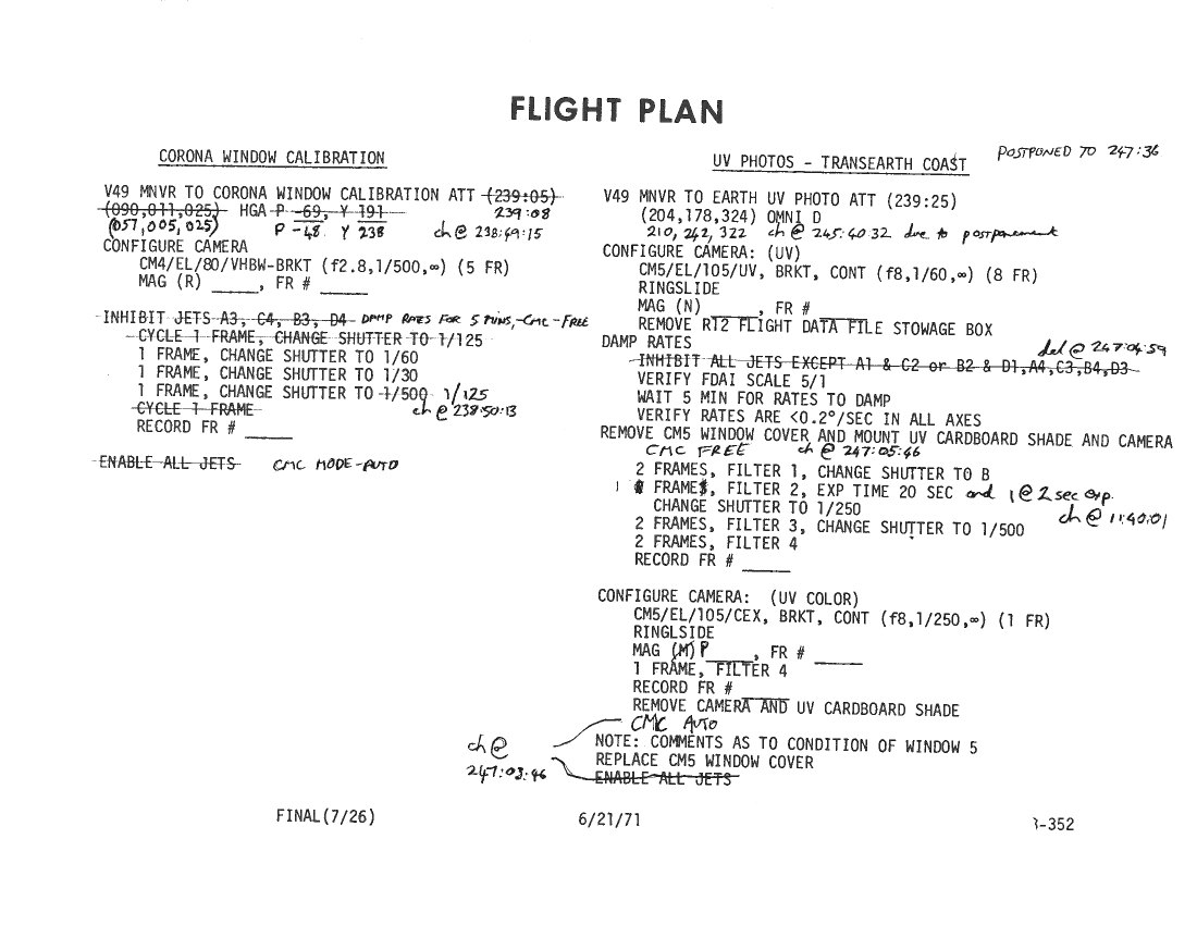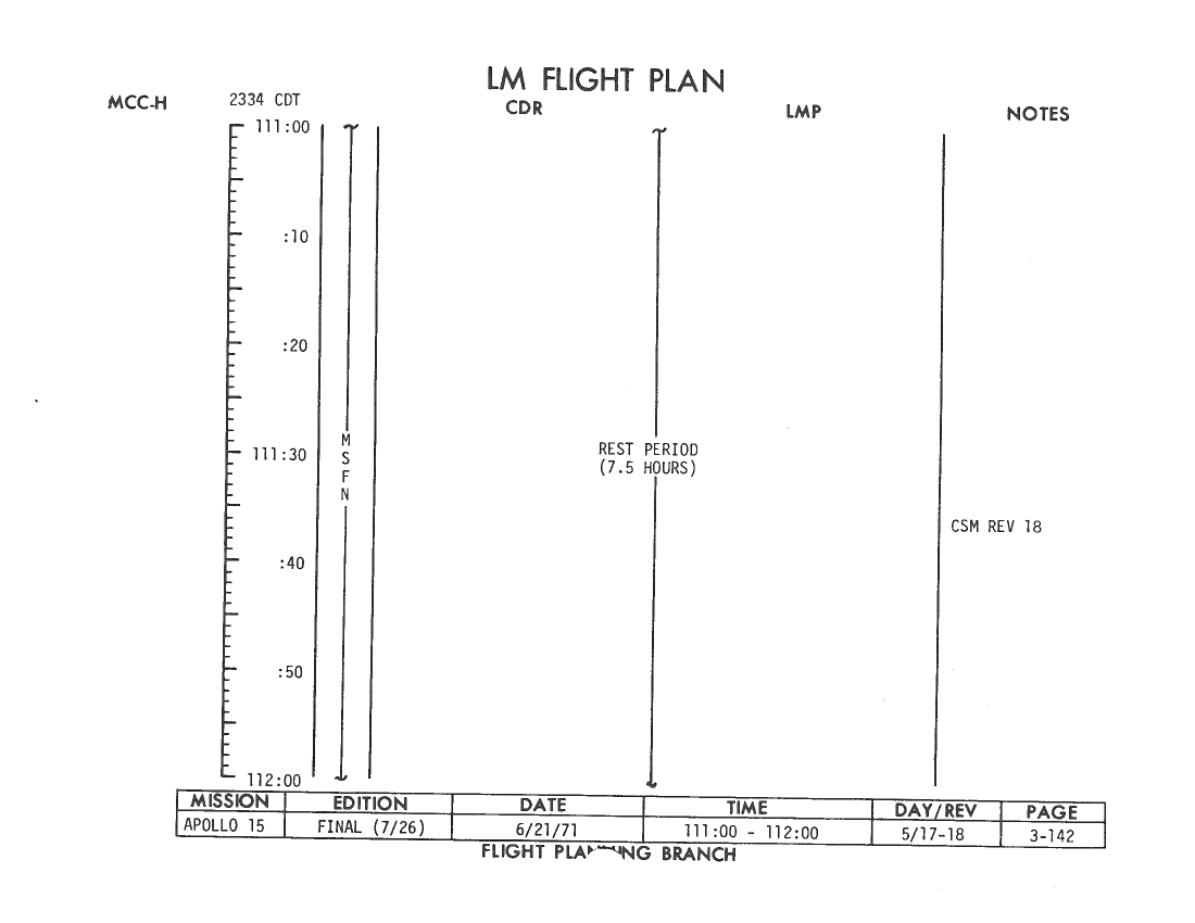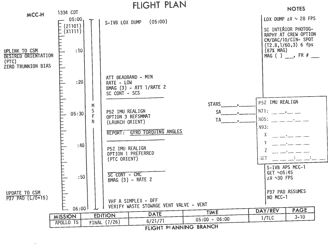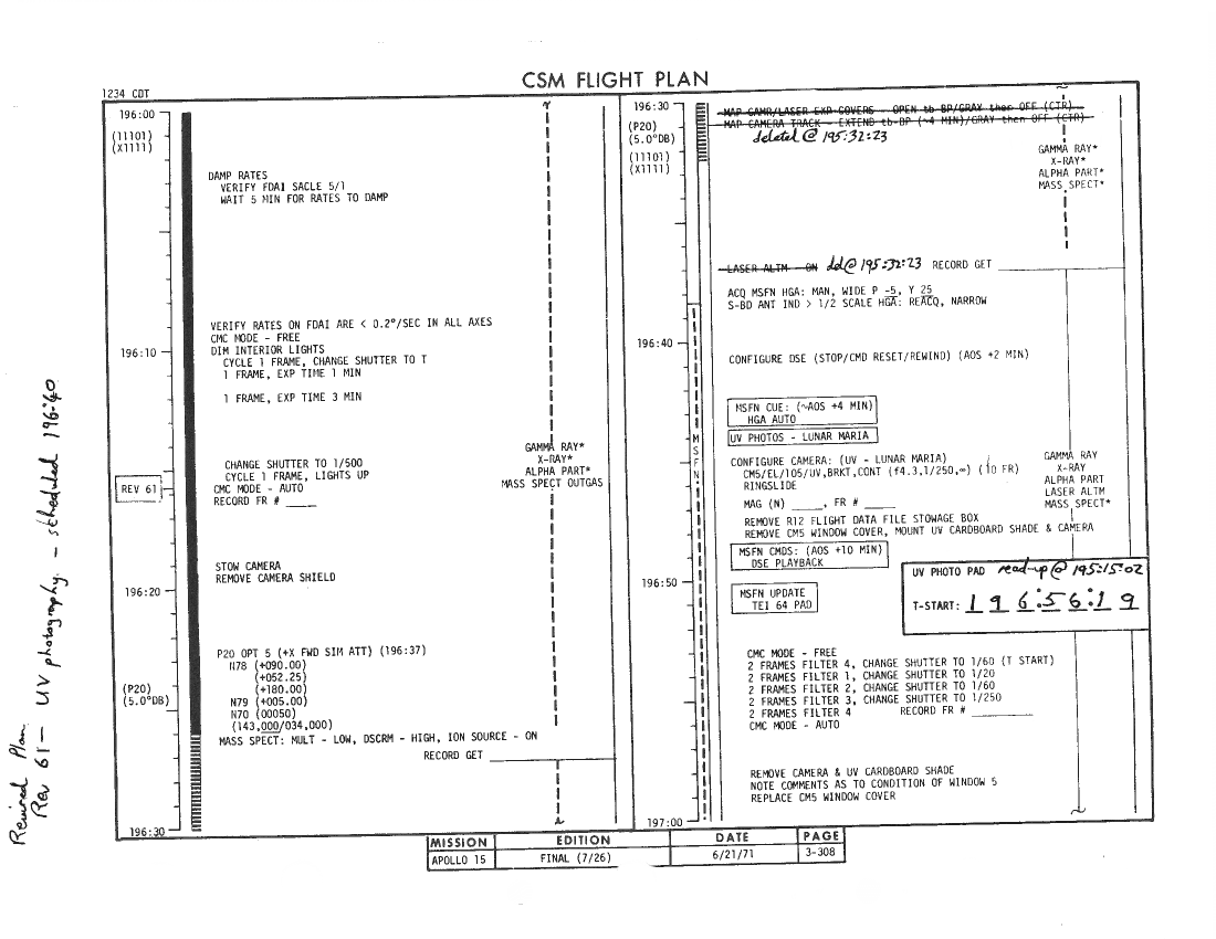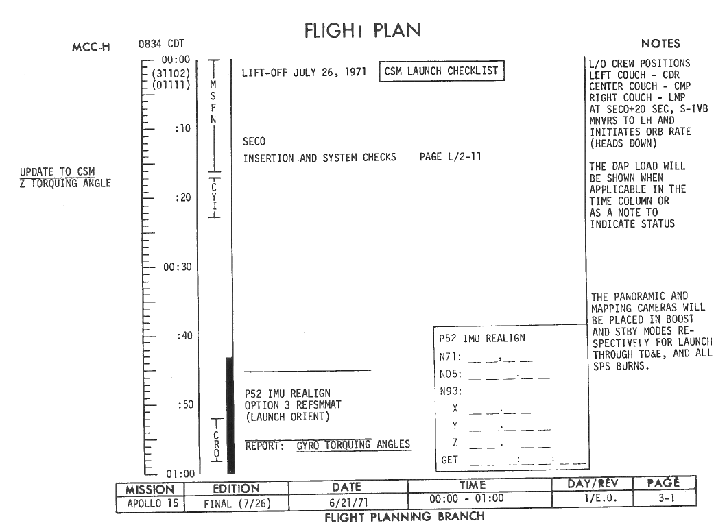 All hand-written additions in this copy of the Flight Plan were made by David Woods during the compilation of this Journal and largely represent the updates read to the crew during the flight.