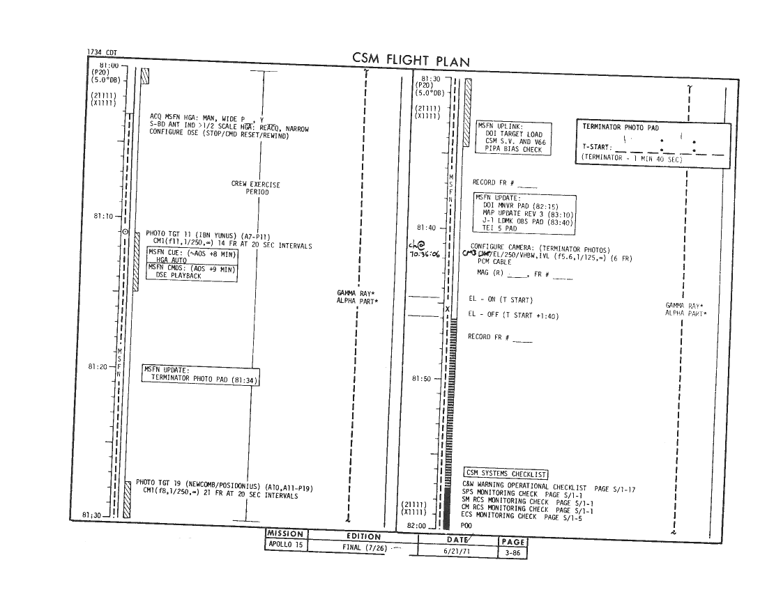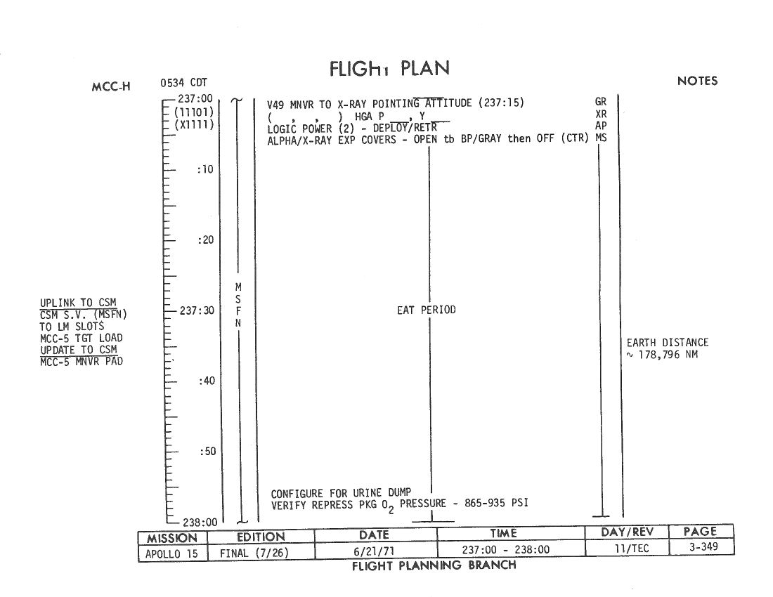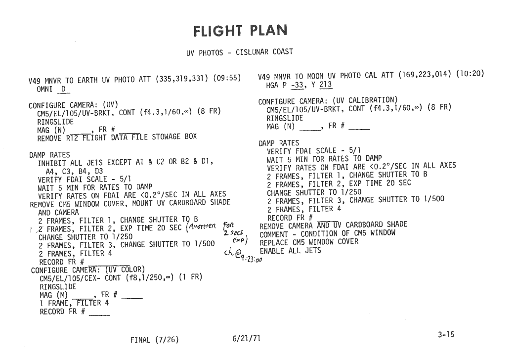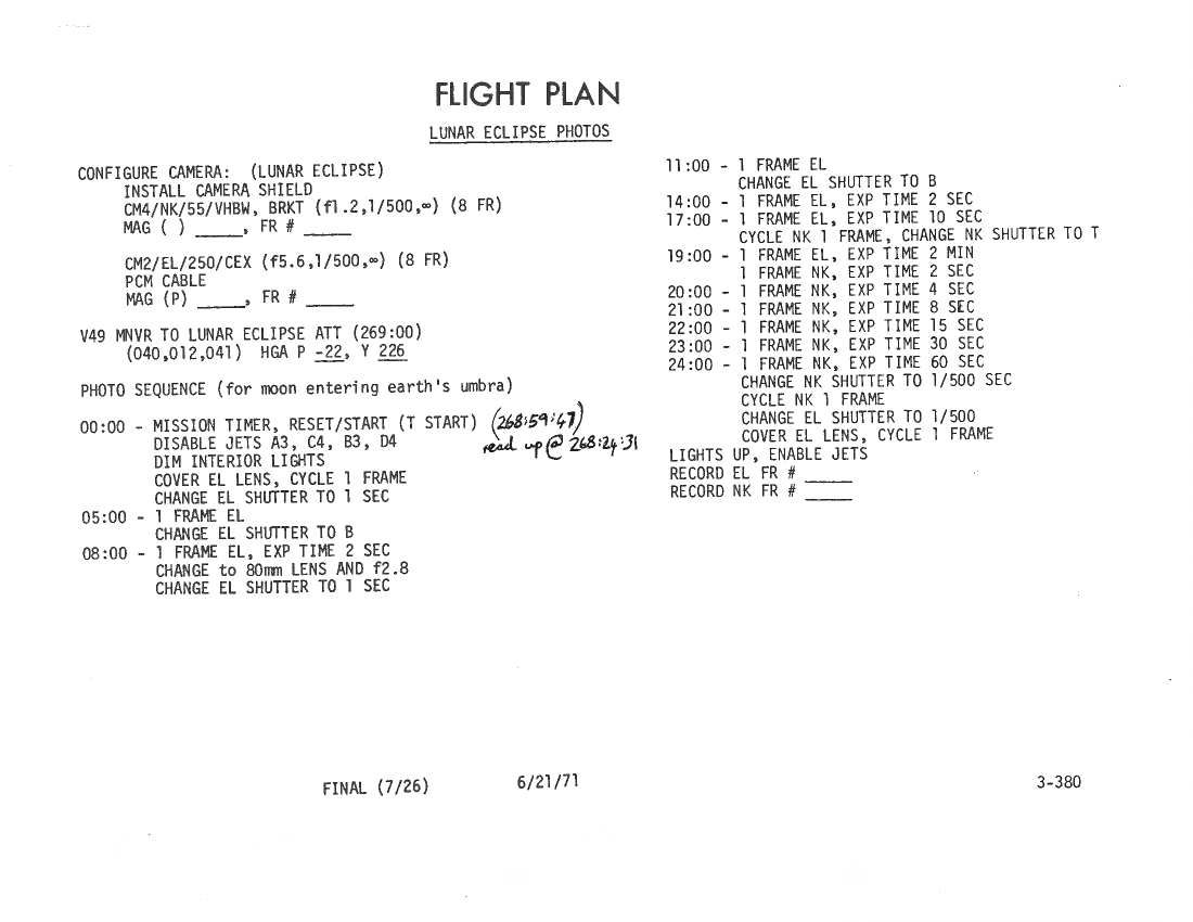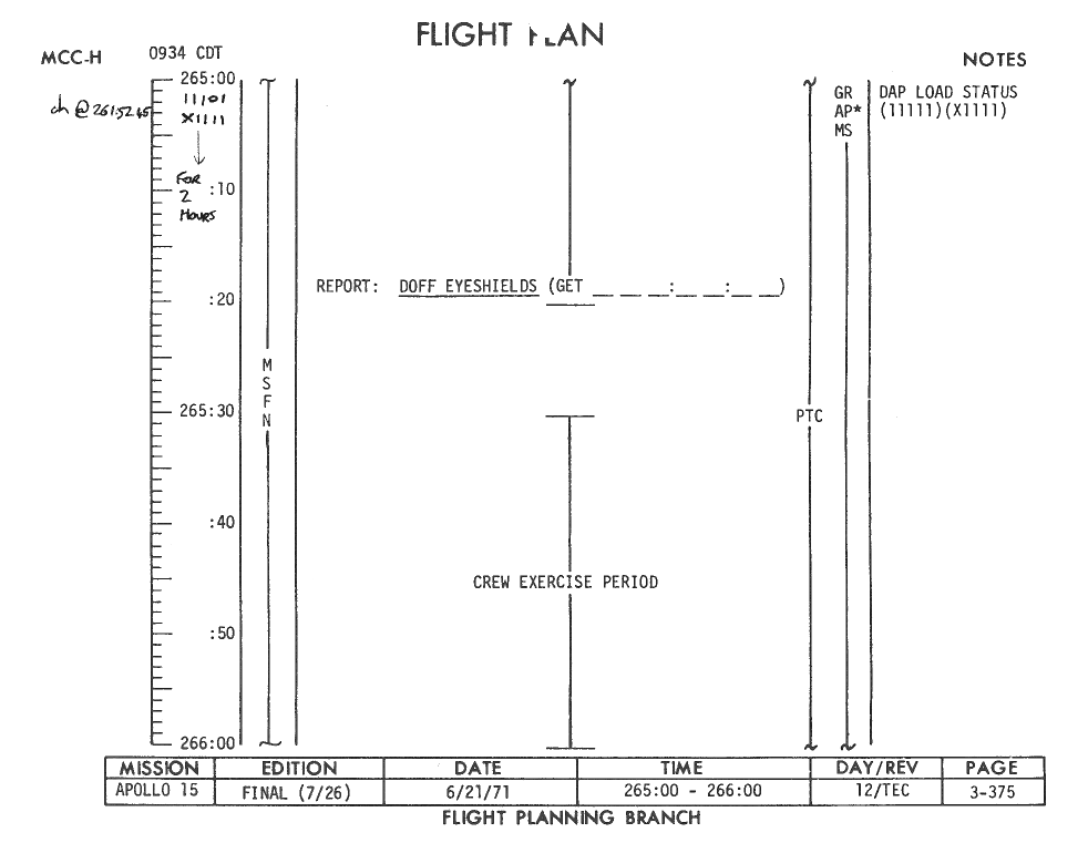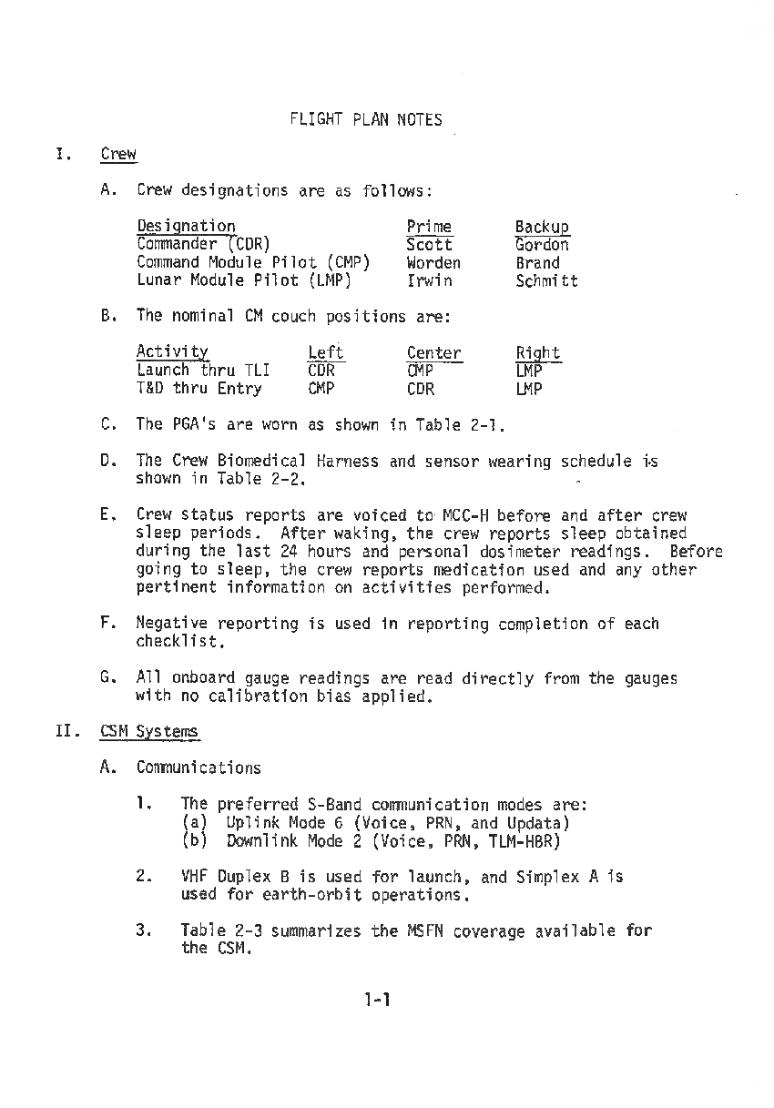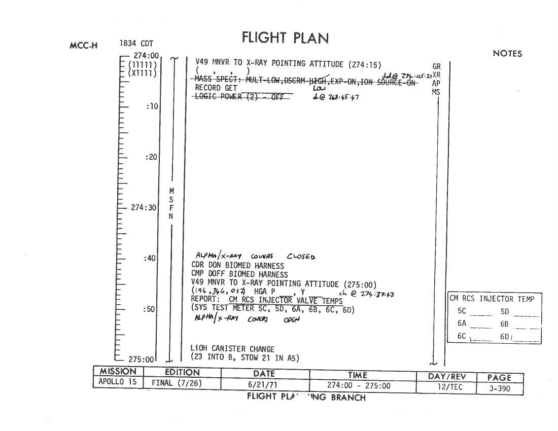 All hand-written additions in this copy of the Flight Plan were made by David Woods during the compilation of this Journal and largely represent the updates read to the crew during the flight.