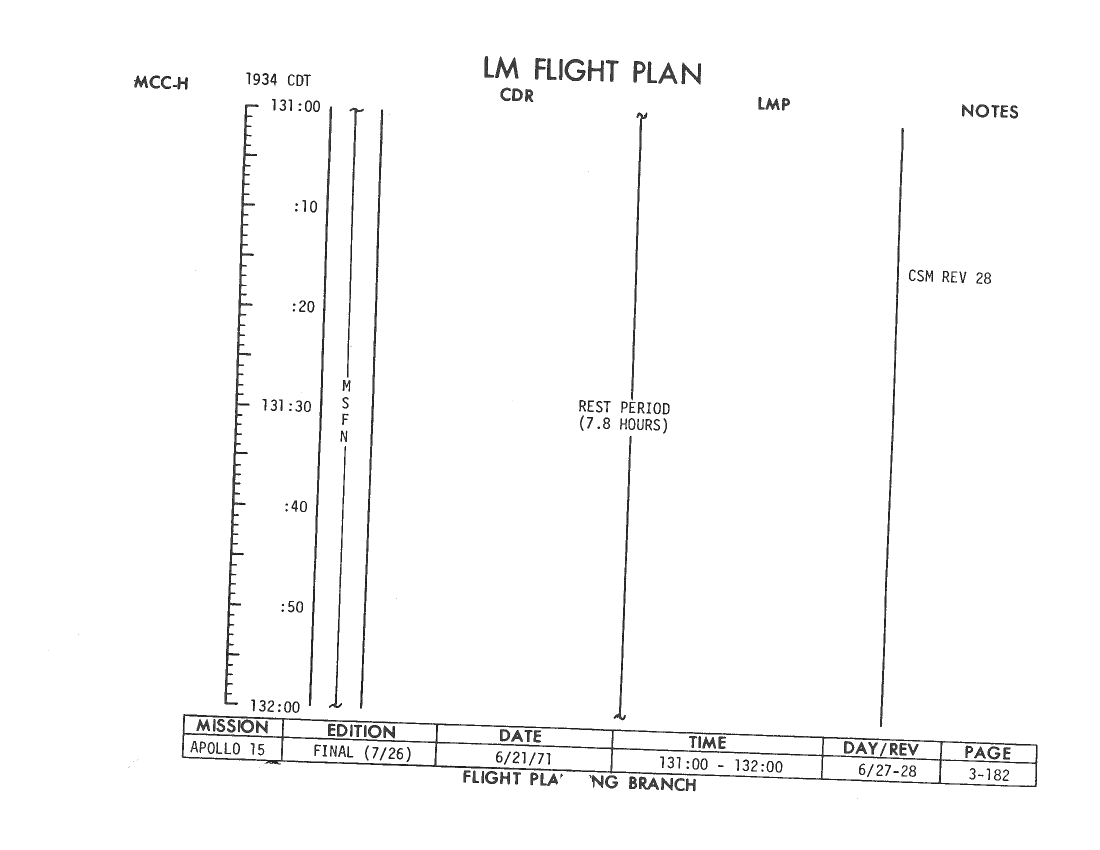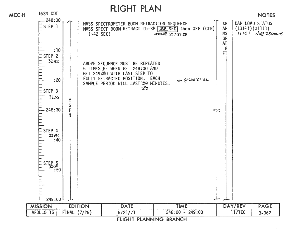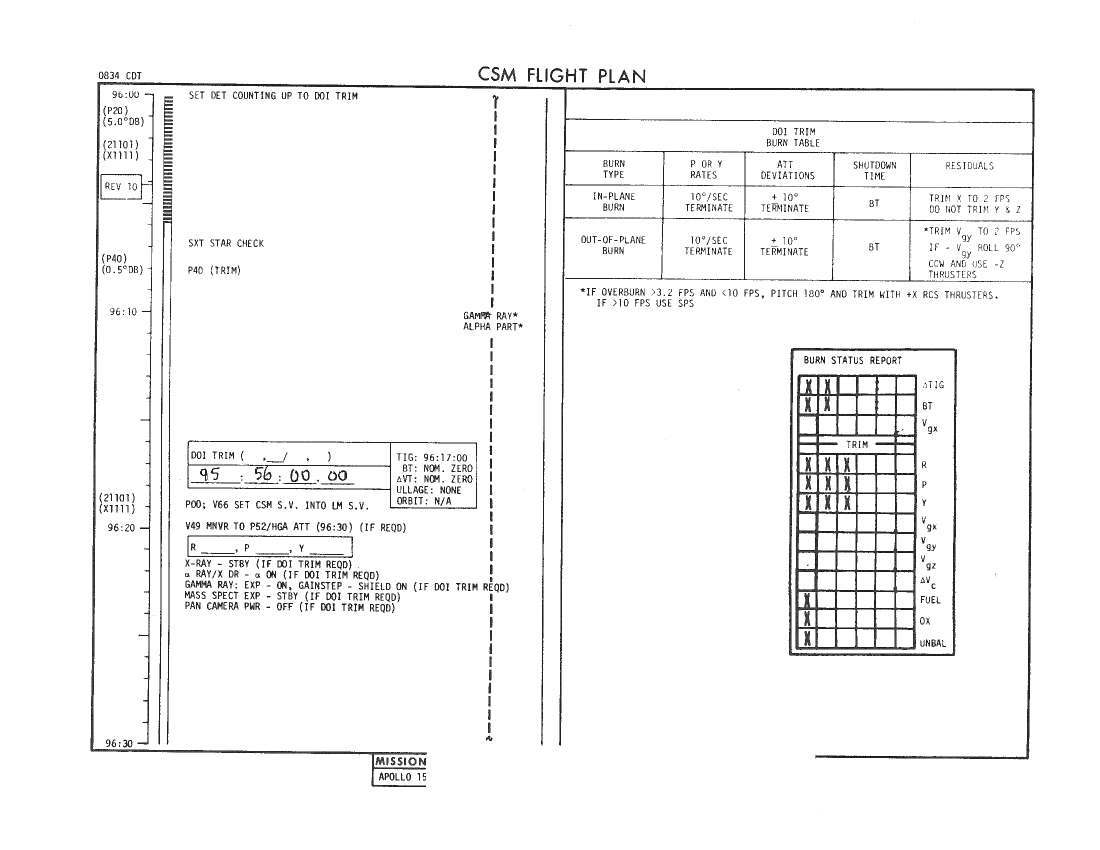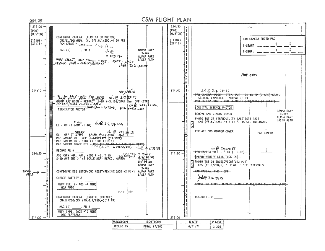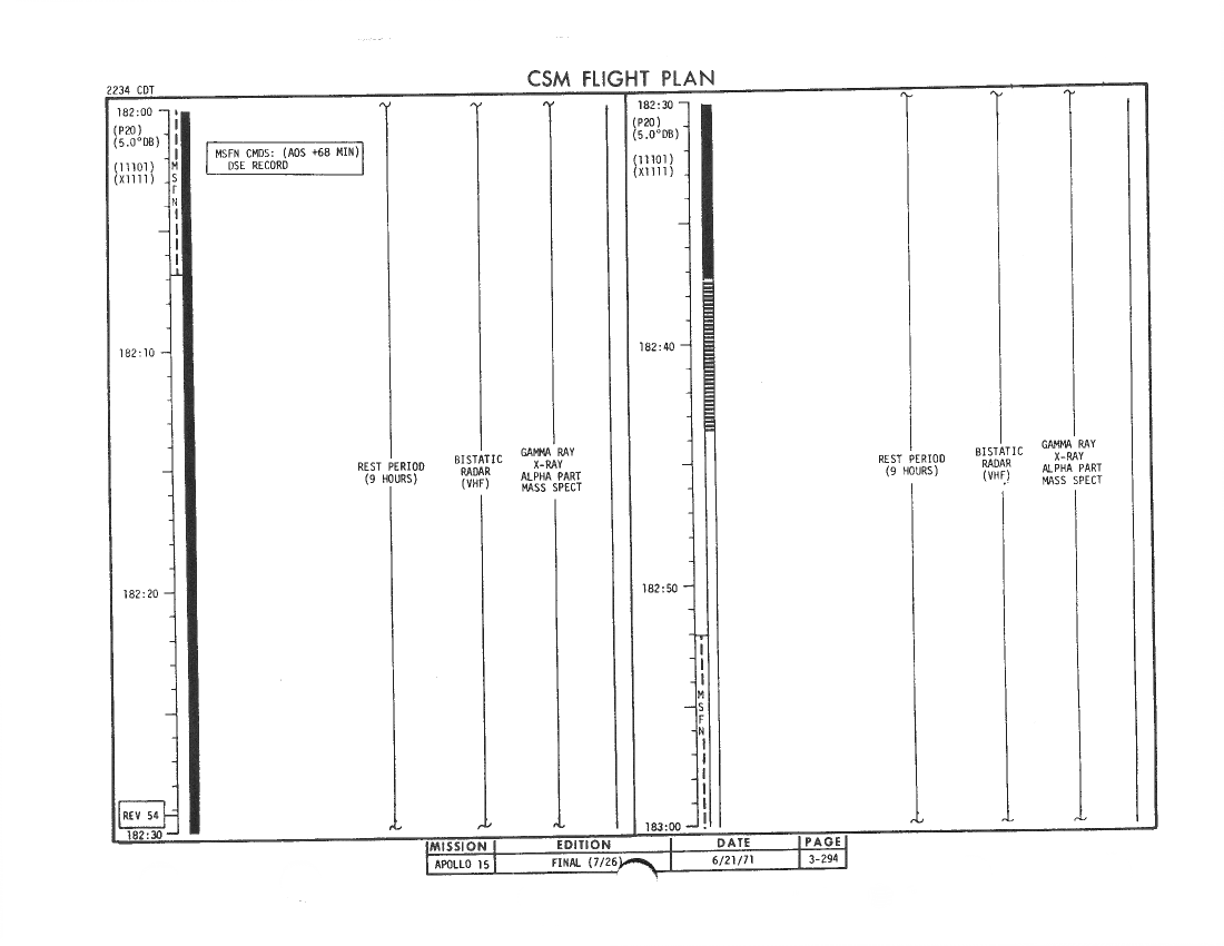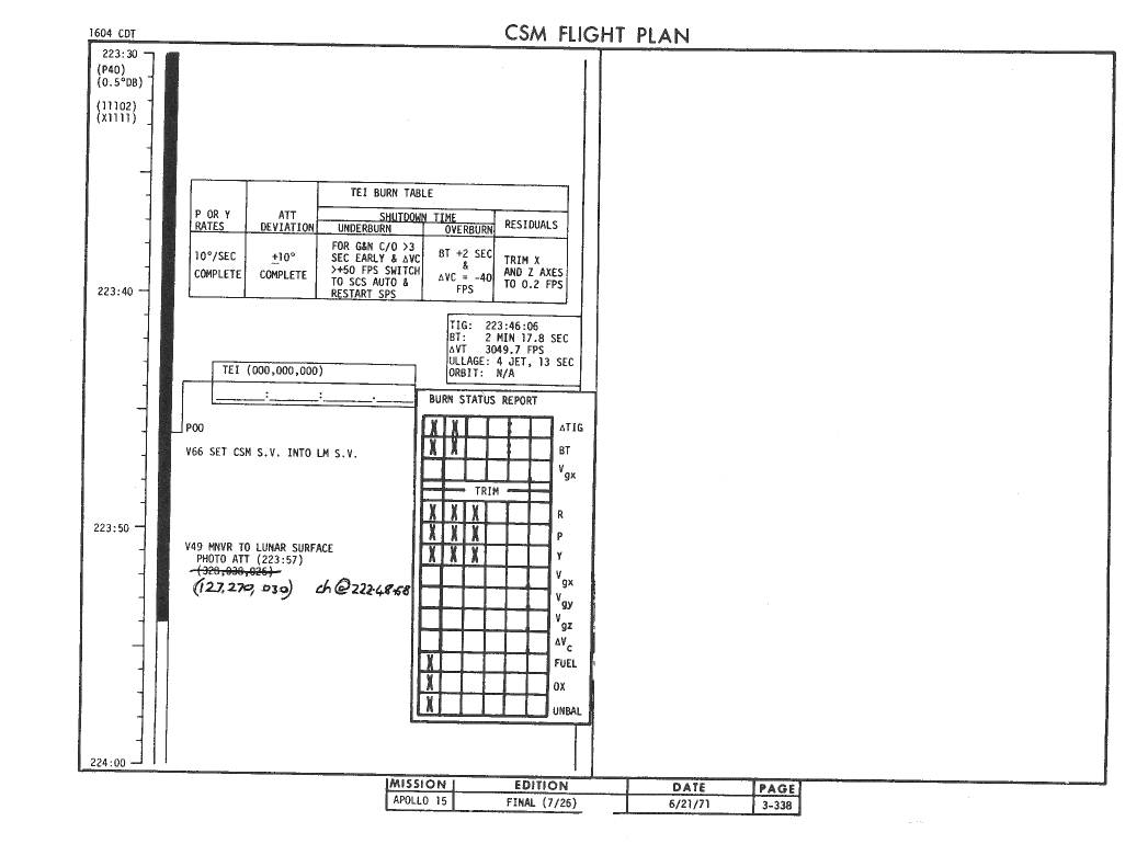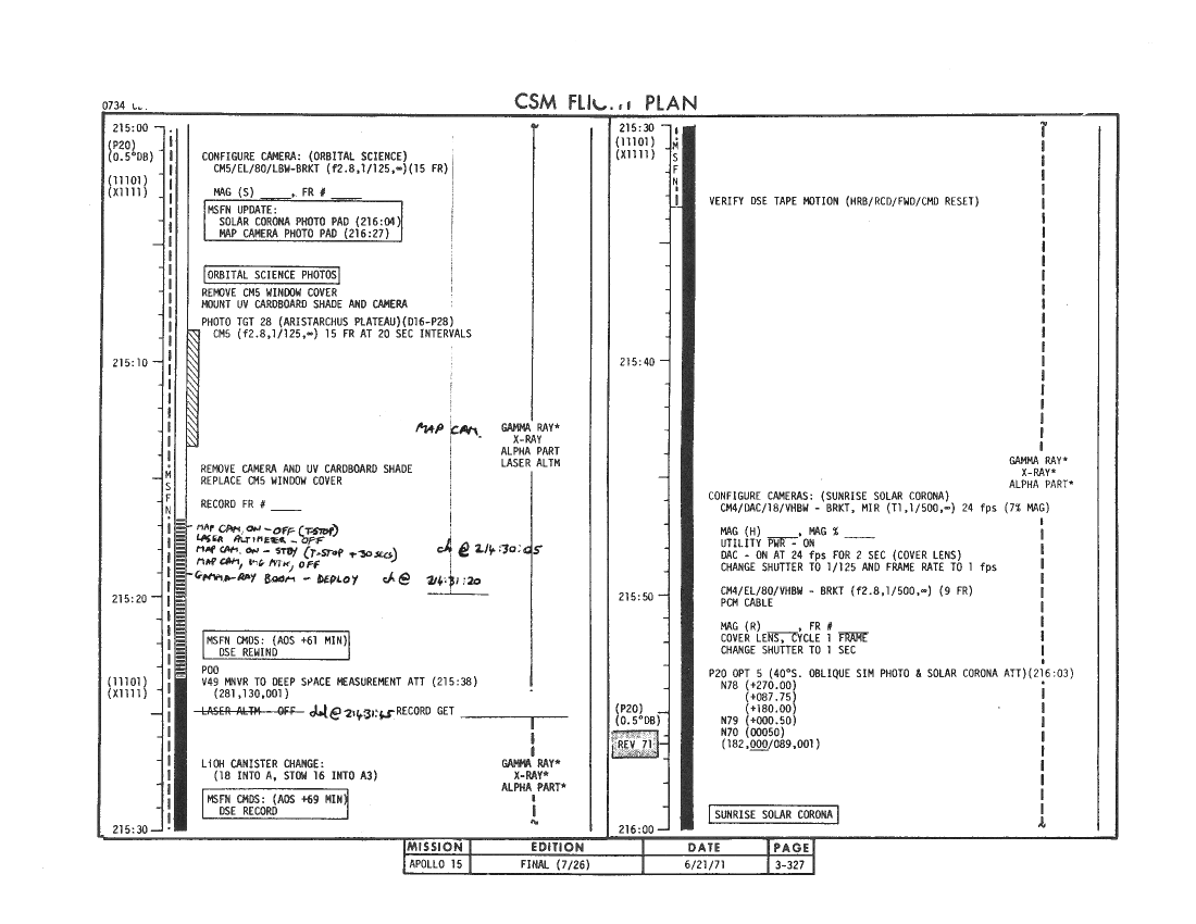 All hand-written additions in this copy of the Flight Plan were made by David Woods during the compilation of this Journal and largely represent the updates read to the crew during the flight.