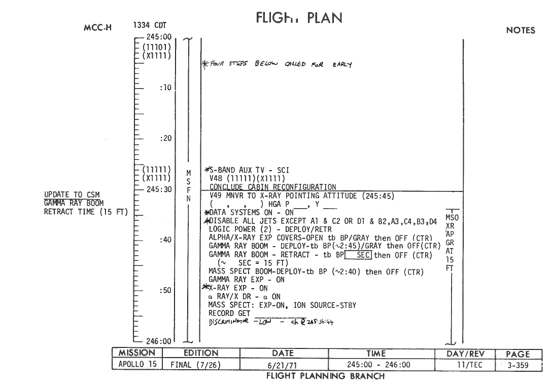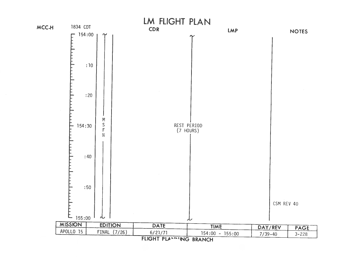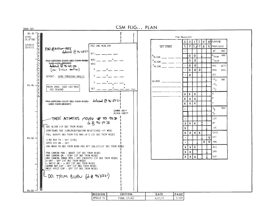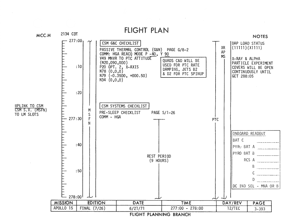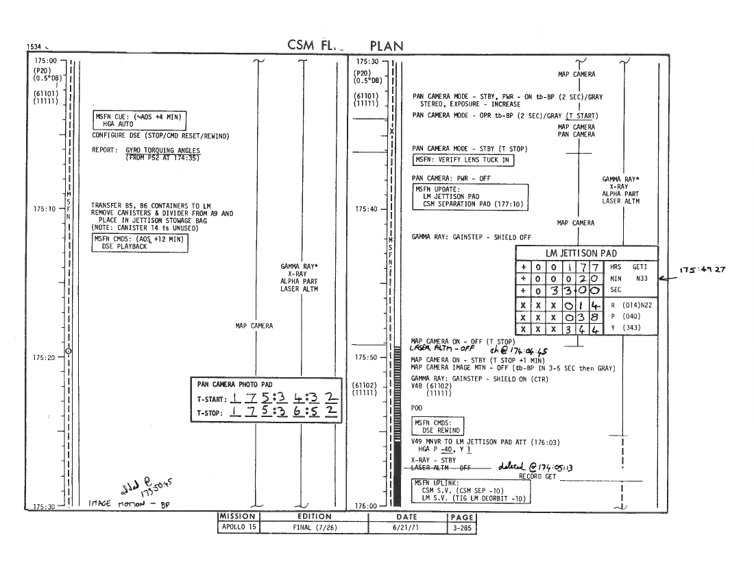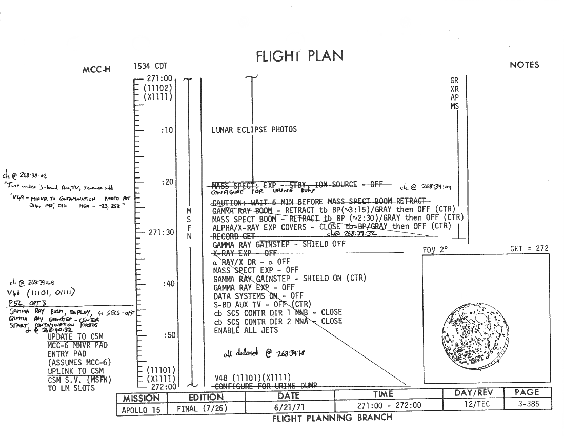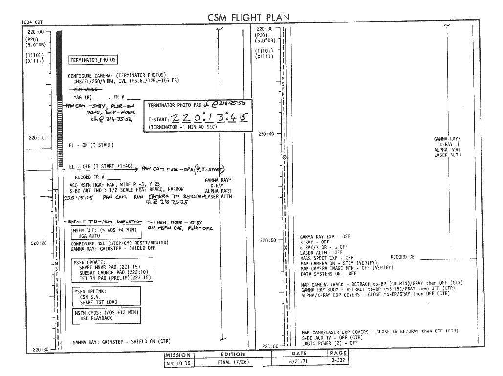 All hand-written additions in this copy of the Flight Plan were made by David Woods during the compilation of this Journal and largely represent the updates read to the crew during the flight.