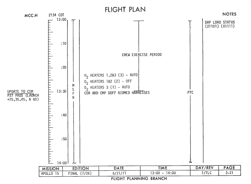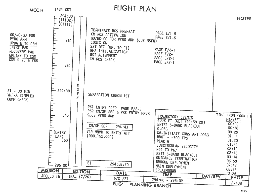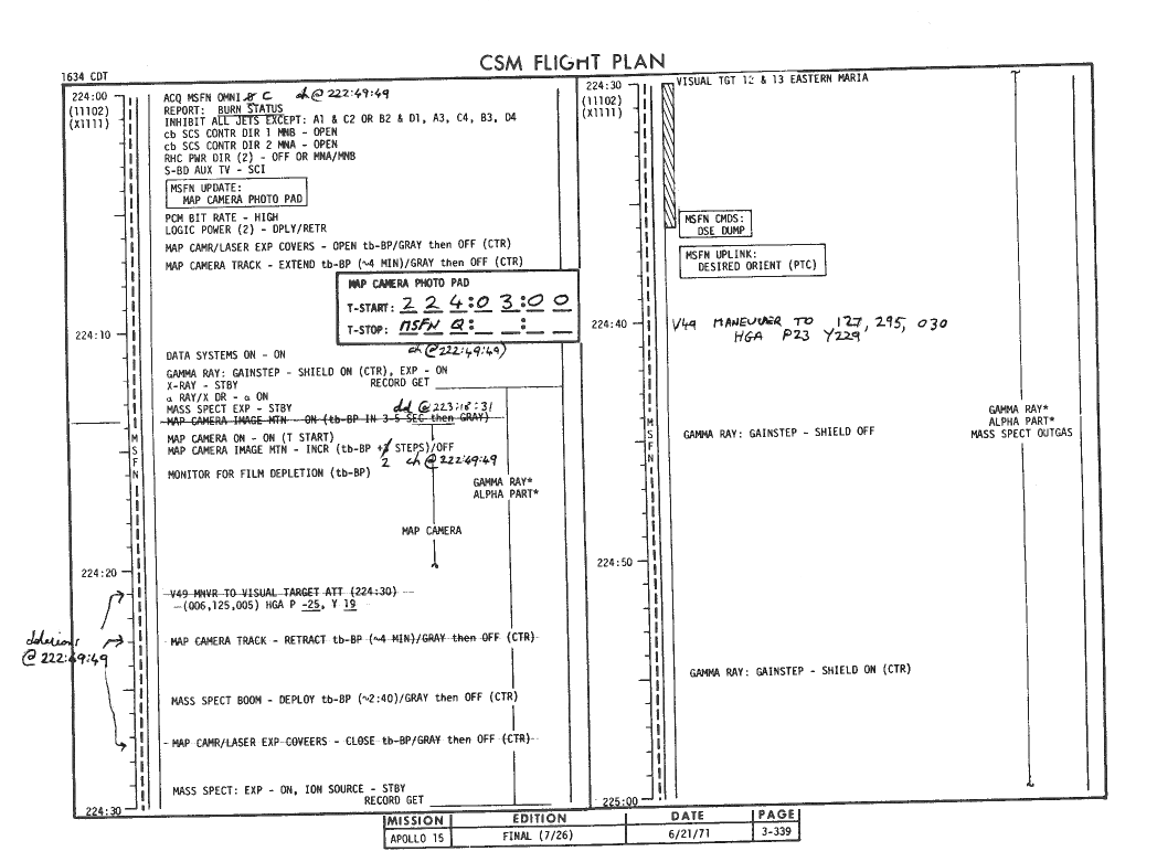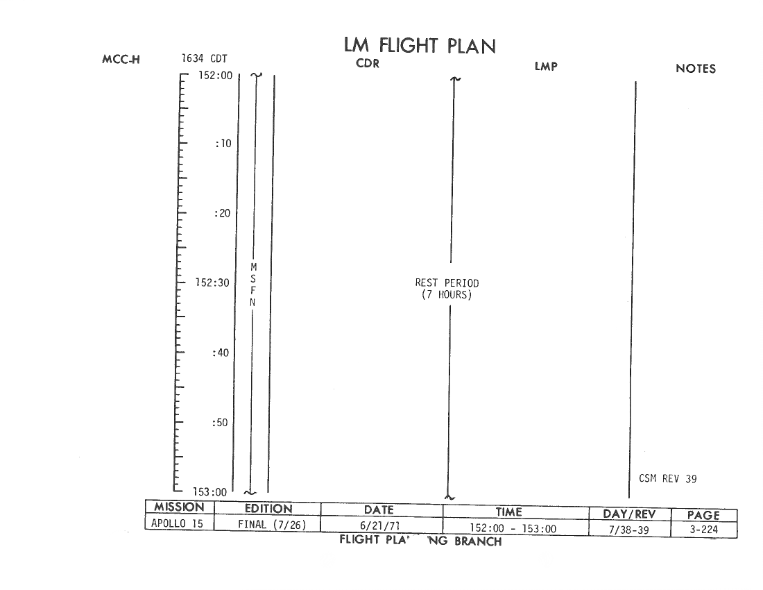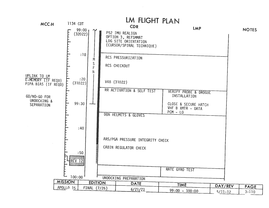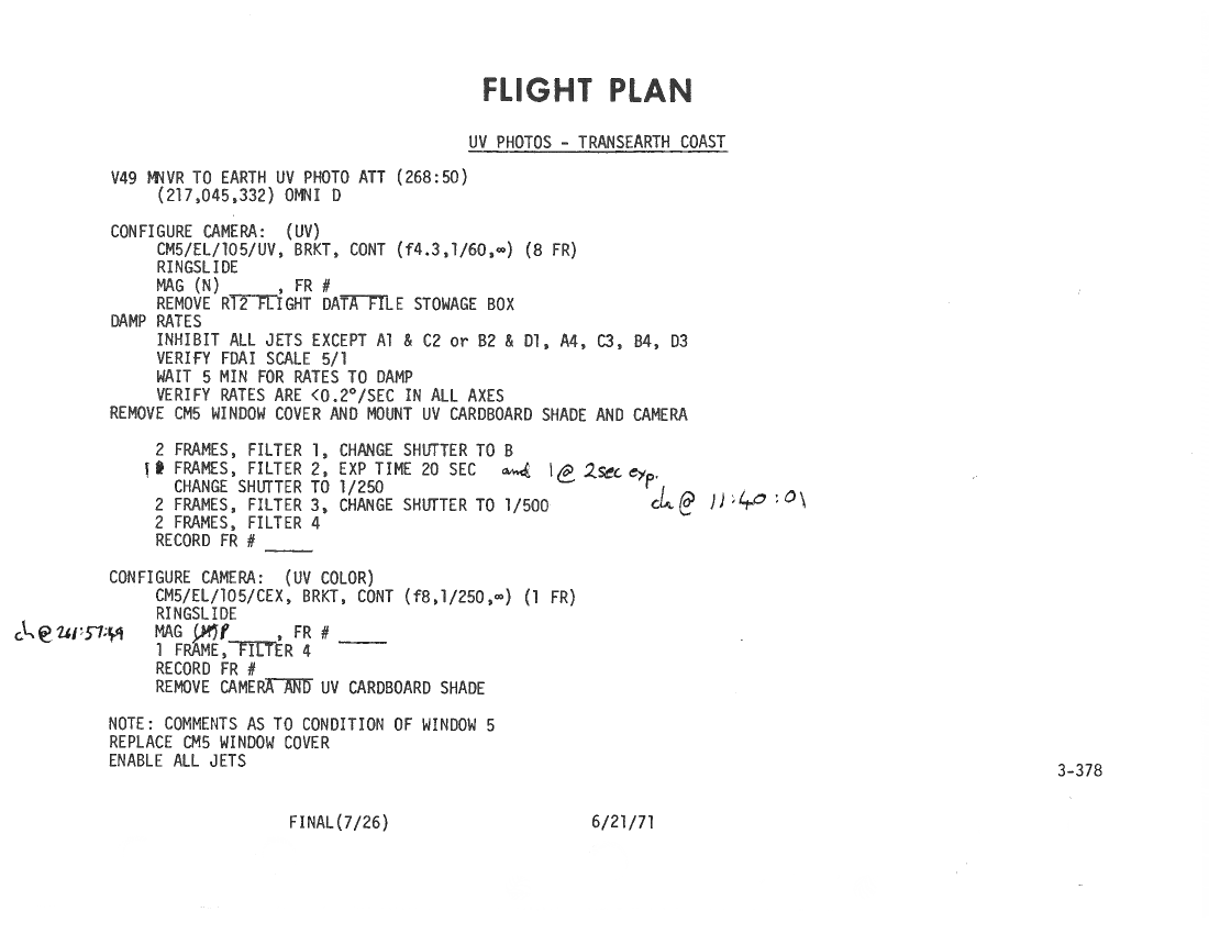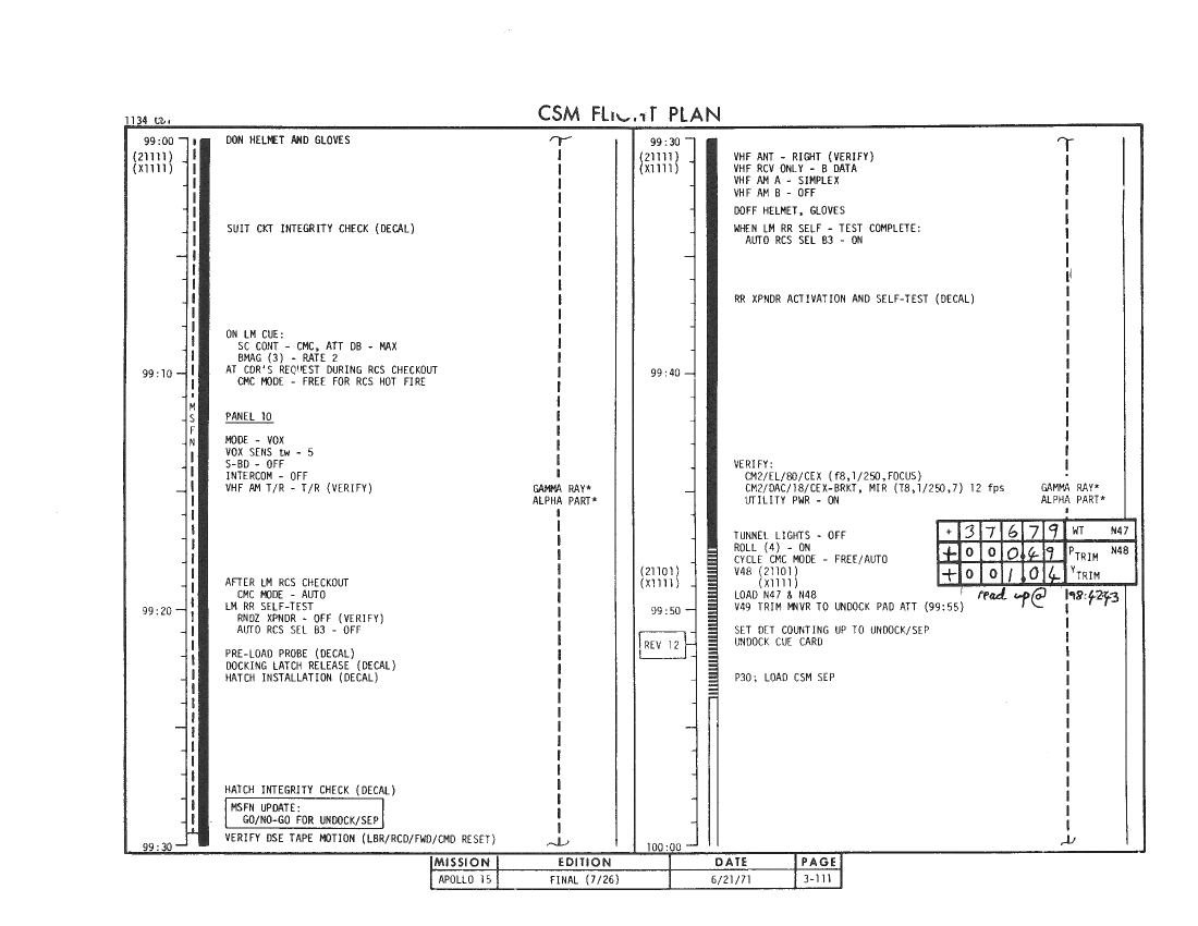All hand-written additions in this copy of the Flight Plan were made by David Woods during the compilation of this Journal and largely represent the updates read to the crew during the flight.