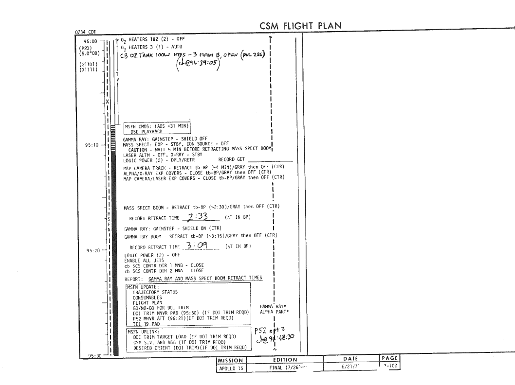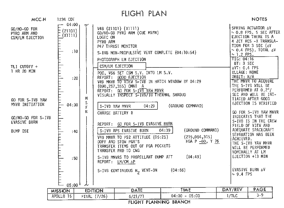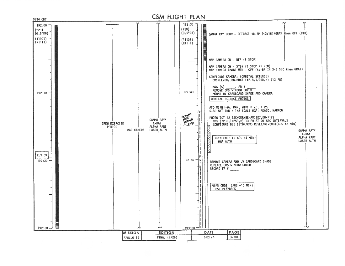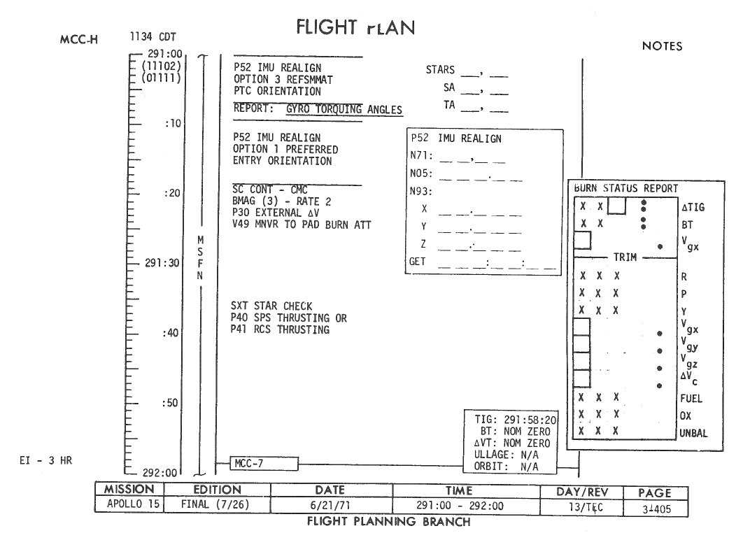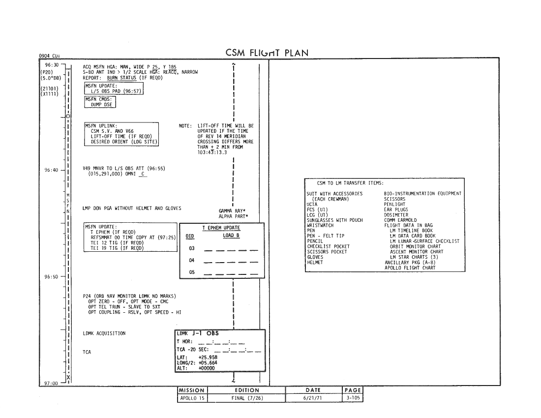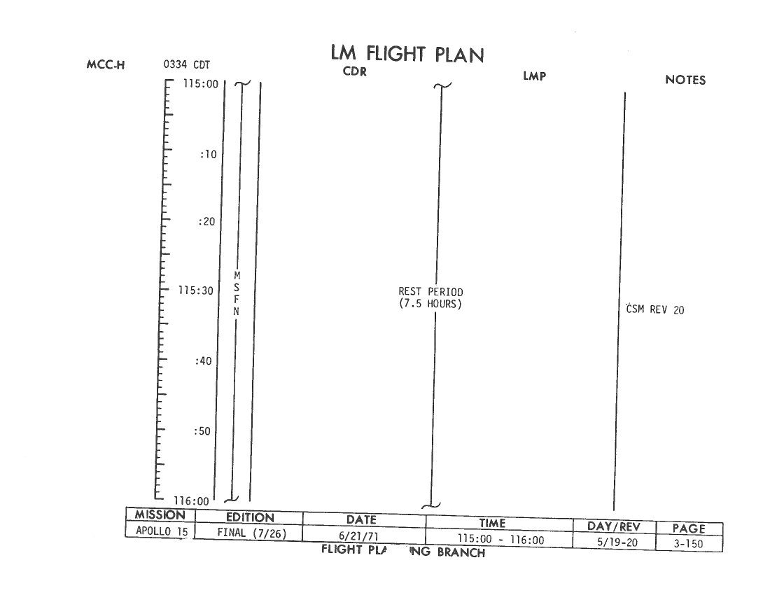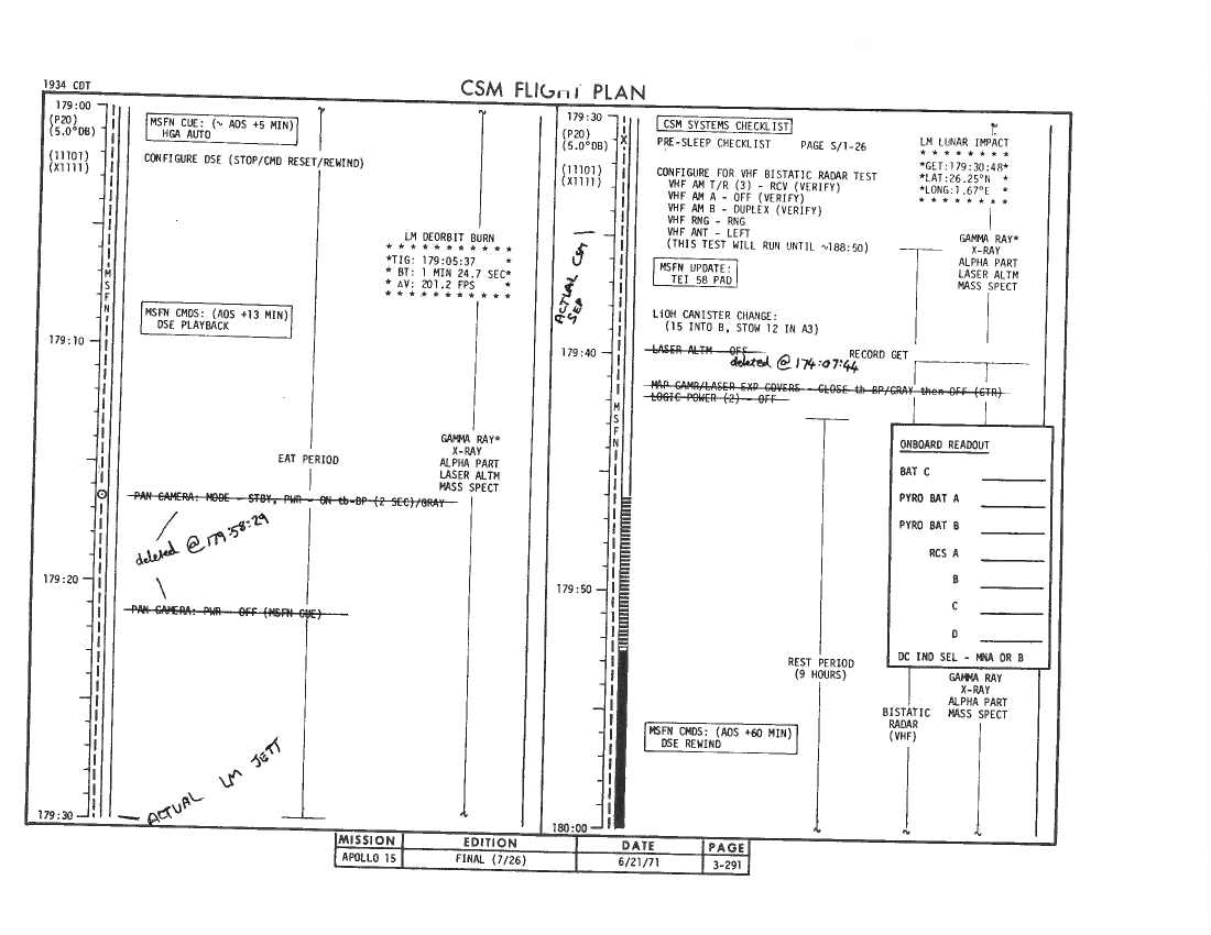 All hand-written additions in this copy of the Flight Plan were made by David Woods during the compilation of this Journal and largely represent the updates read to the crew during the flight.