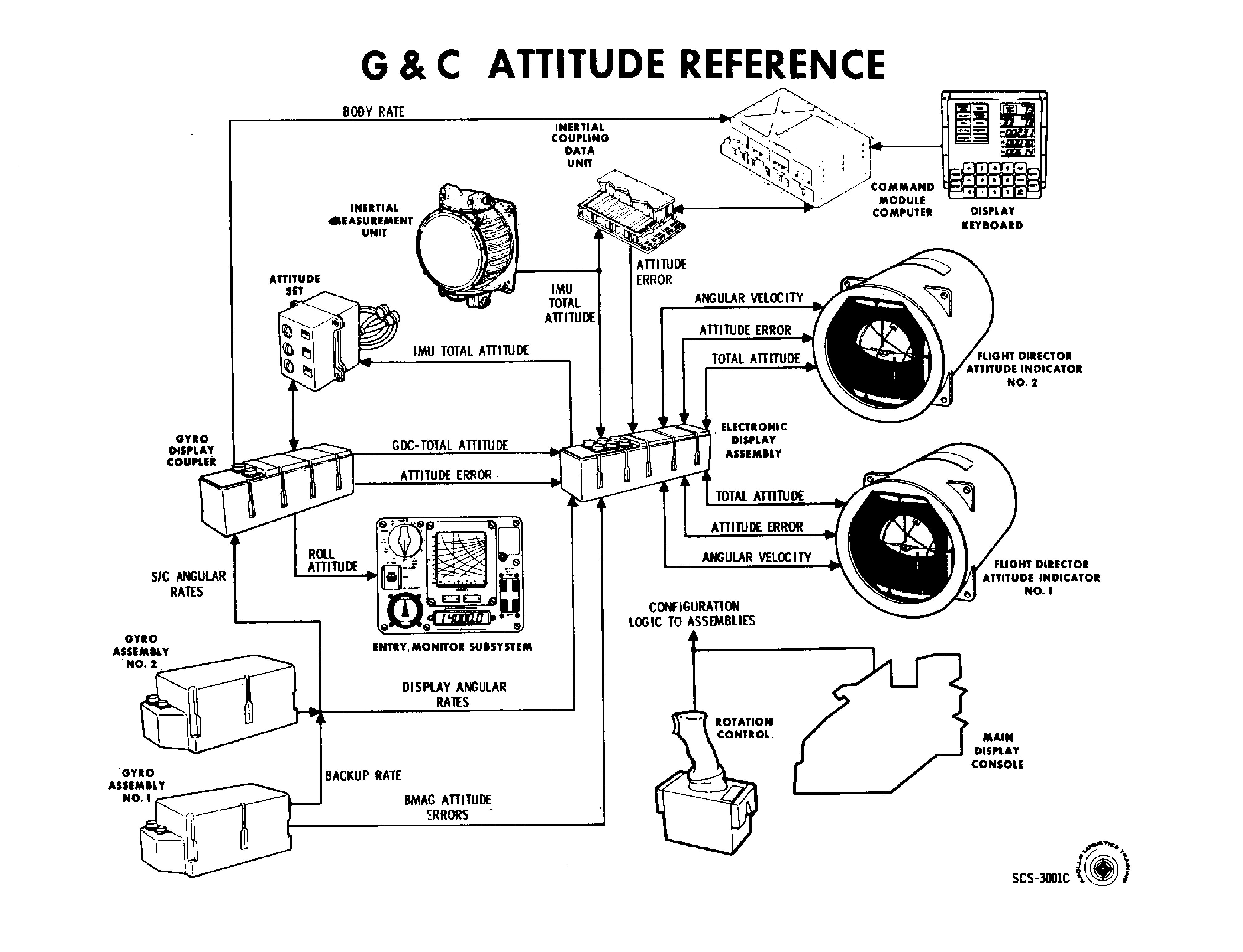 FDAI attitude and attitude error information is supplied from either of two gyro assemblies in the Attitude Reference Sub-System of the spacecraft Stabilisation and Control System (SCS), or from the the inertial platform in the Primary Guidance, Navigation and Control System (PGNCS). Attitude rate signals are provided from the SCS gyros only.