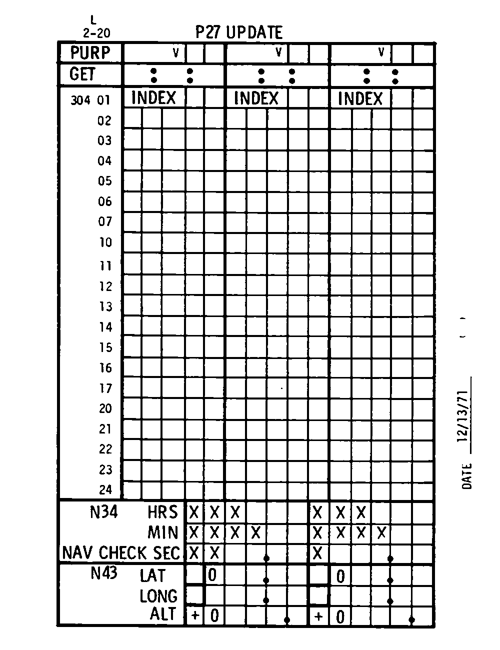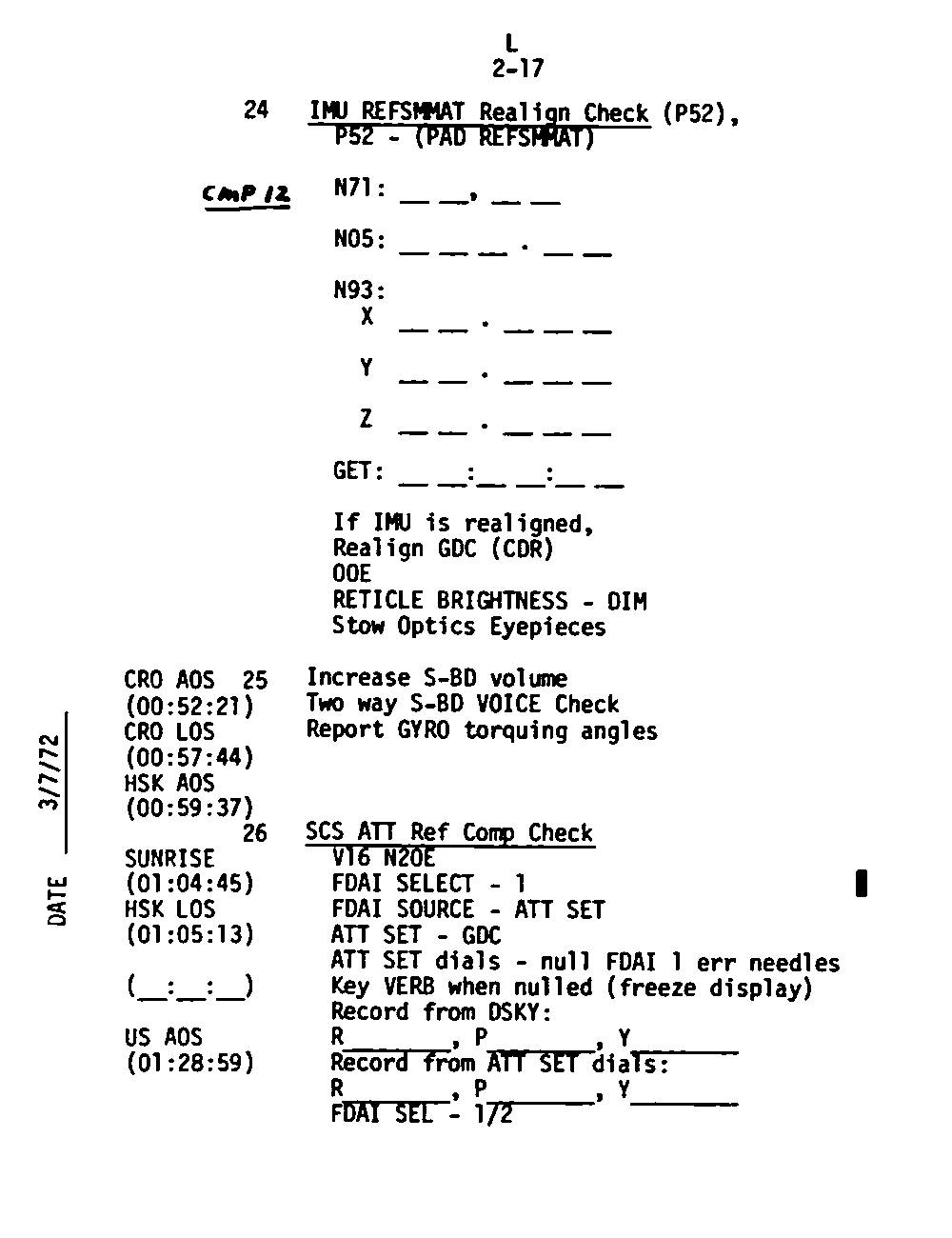 Throughout the mission, one of Ken Mattingly's jobs is to ensure that the inertial guidance platform is kept aligned. He is actually a bit early, since there are quite a few more checklist items before he gets to the stage where he can carry out the first of many such alignments during the flight. He will get to this later, at around 000:29:39.
