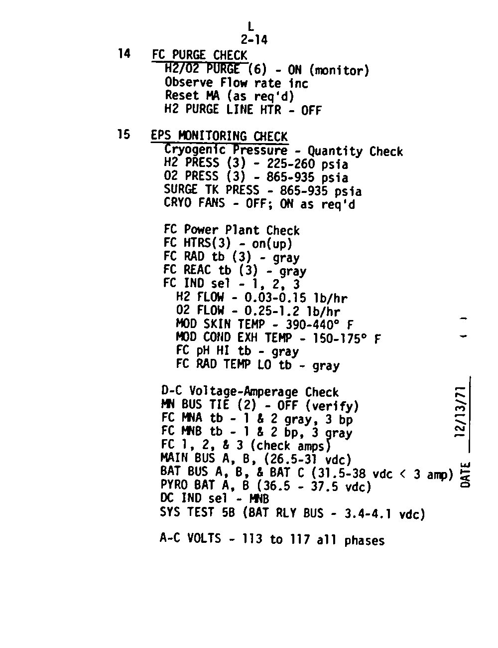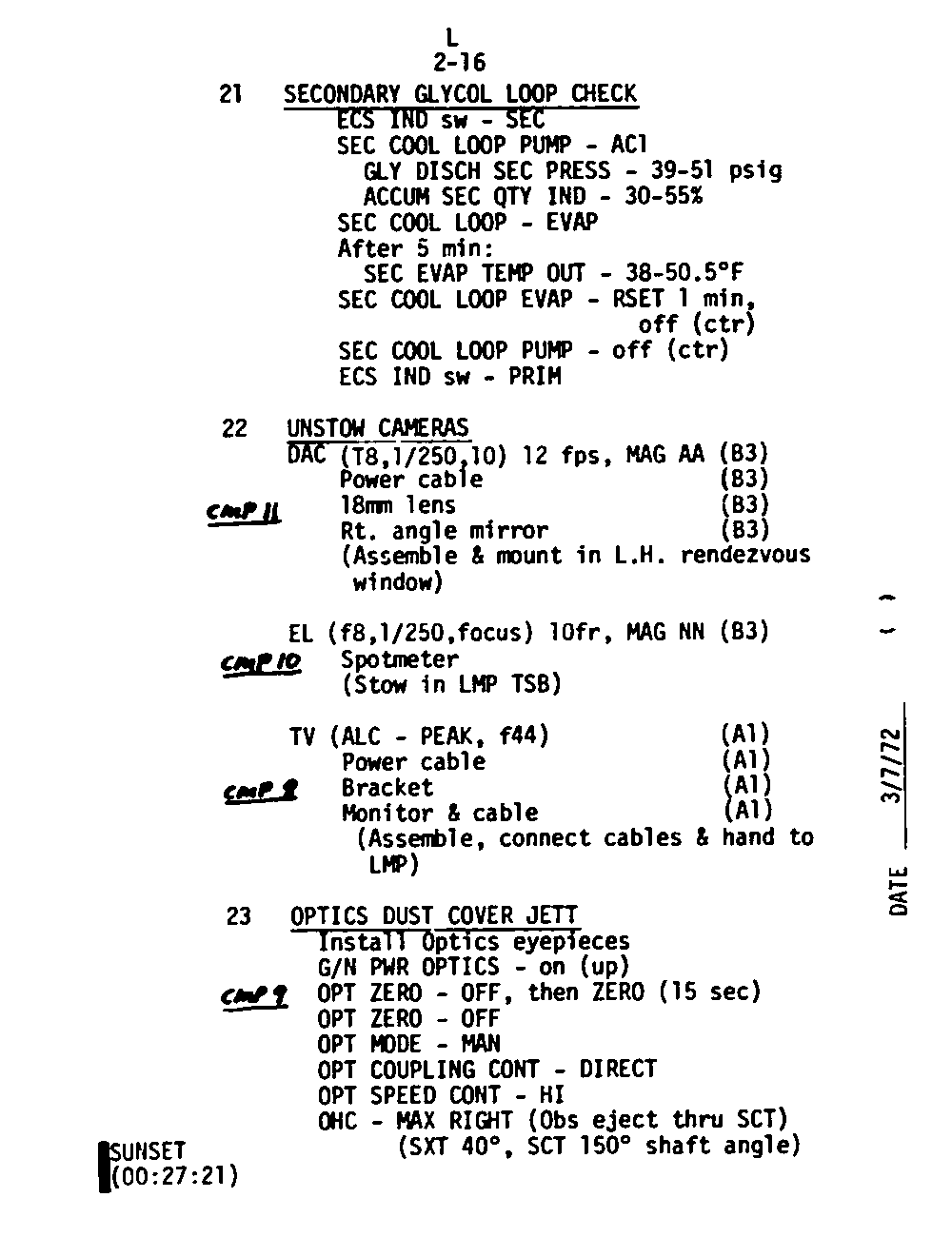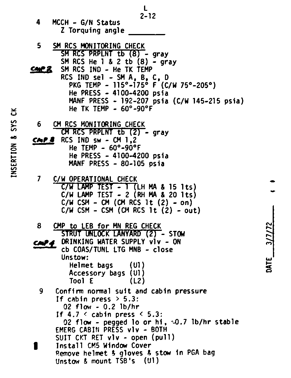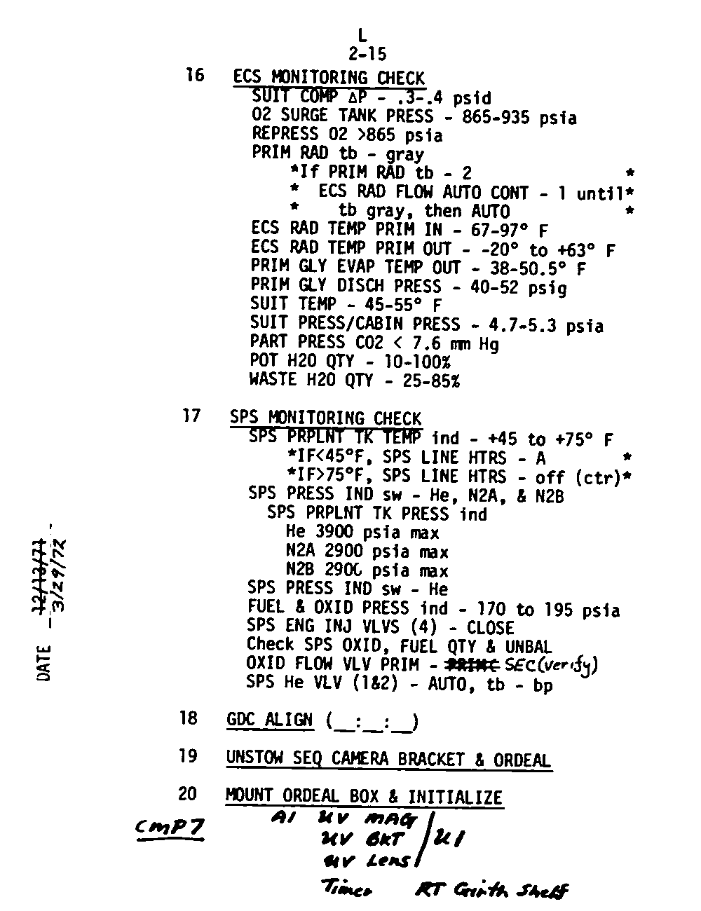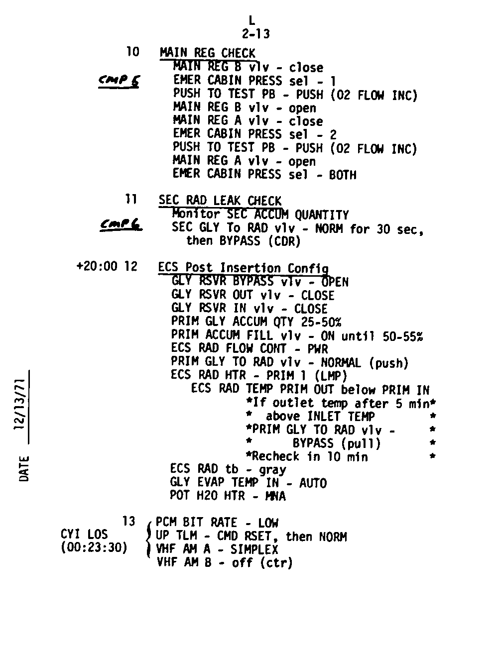 Ken Mattingly has moved onto Serial 9 of the Launch Checklist Page 2-12. This serial consists of a number of checks of the Environmental Control System before the crew can remove their gloves and helmets.