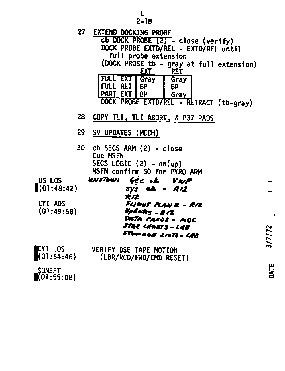 At this stage, John Young, Charlie Duke and Ken Mattingly are working their way through the (Orbit) Insertion and Systems Checks on the CSM Launch Checklist. They are on Page L2-12. The Capsule Communicator (CapCom) in Mission Control is Gordon Fullerton.