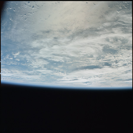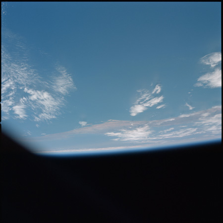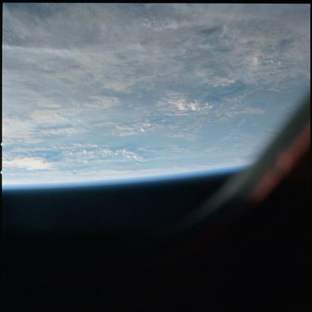 The crew are just coming into darkness over Africa on their first orbit. They are in contact with Mission Control in Houston through the tracking station in the Canary Islands. The parking orbit around Earth does not permit continuous communication with Mission Control. Indeed, the orbit is so low that when the spacecraft does come within range of a station, it is only above the horizon for a few minutes, even if it passes directly overhead. If it passes to one side or the other, the period of contact is further constrained; for this pass over the Canary Islands tracking station, communication lasts only four minutes. (A15FJ amended)