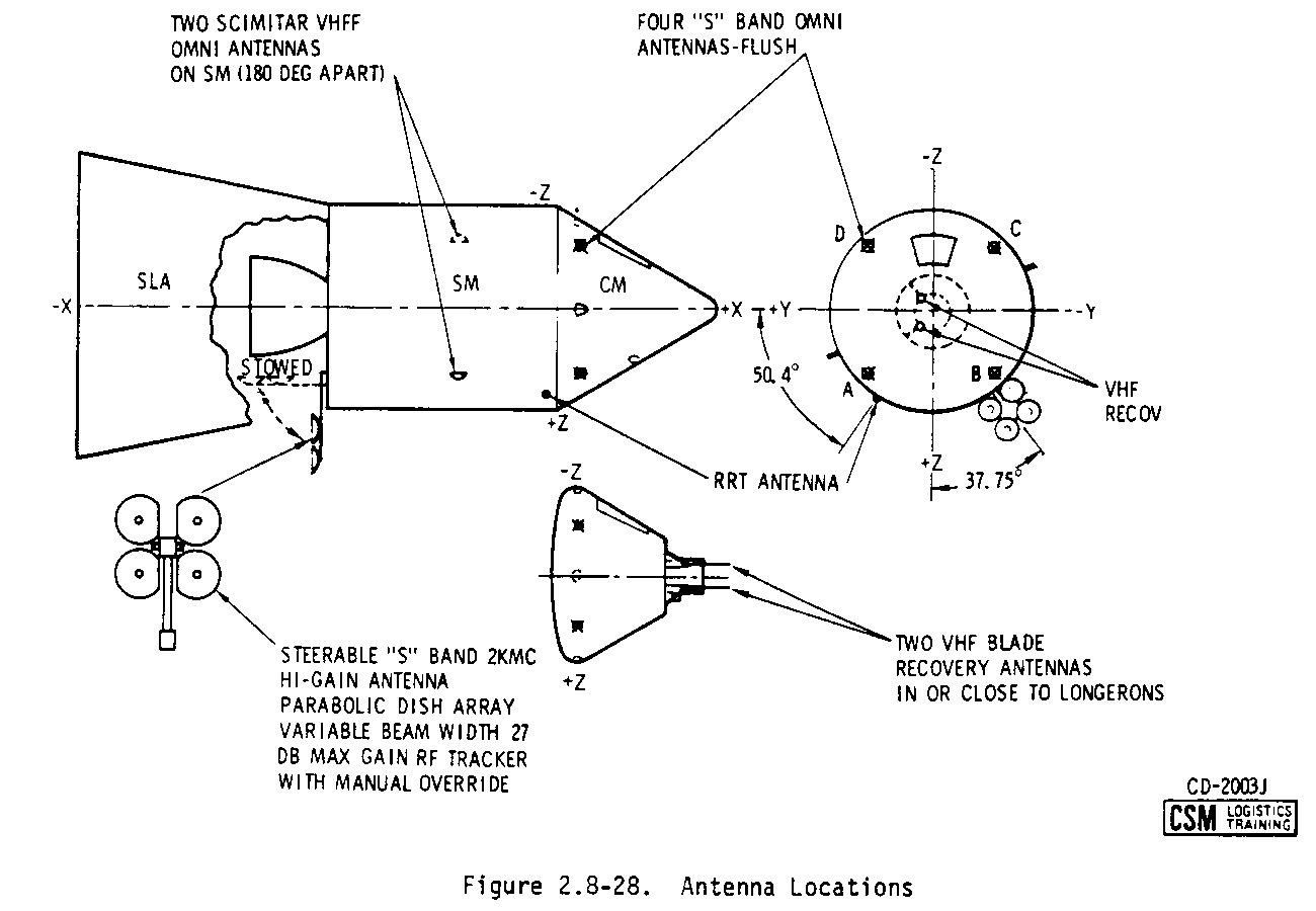 At this stage in the mission, the crew are using four small S-band antennae on the CM to communicate with the Earth. These are flush-mounted, 90 degrees apart. Each antenna broadcasts and receives in a roughly hemispherical pattern, so the crew must select the one facing Earth to ensure reception.