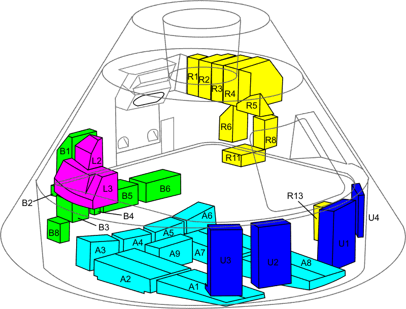 Numerous items of personal and spacecraft equipment are stowed in compartments, lockers and bags throughout the Command Module (CM). Stowage compartments are part of the cabin structure and most of the equipment stowed in them is in cushioned bags. The lockers are pre-packed before the mission and are attached to the aft bulkhead and equipment bays a short time before launch. This allows groundcrew to gain access to the aft bulkhead during the pre-flight preparation of the spacecraft. Both compartment and locker doors have squeeze-type latches that can be operated with one hand. The compartments and lockers are labelled on the doors for identification and to aid location. They are numbered consecutively from fore to aft and are prefixed with a letter to indicate which equipment bay they are in.Lower equipment bay compartments are B1 to B8, the right hand equipment bay ones are R1 to R13 and the left hand equipment bay ones L2 and L3. The aft bulkhead has lockers A1 to A8 while the upperequipment bay as lockers and bags U1 to U4. There are two expandable temporary stowage containers under the left and right-hand forward equipment bays, designated F1 and F2.