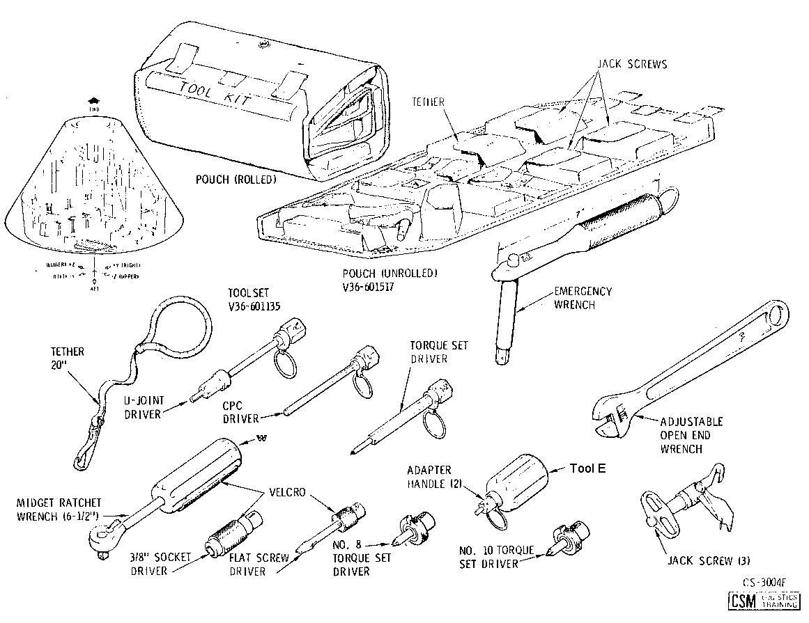 For launch and entry, the tool set pouch is stowed in a stowage locker on the aft bulkhead beneath the centre seat location.In flight, it can be attached to the CM structure by velcro pads.