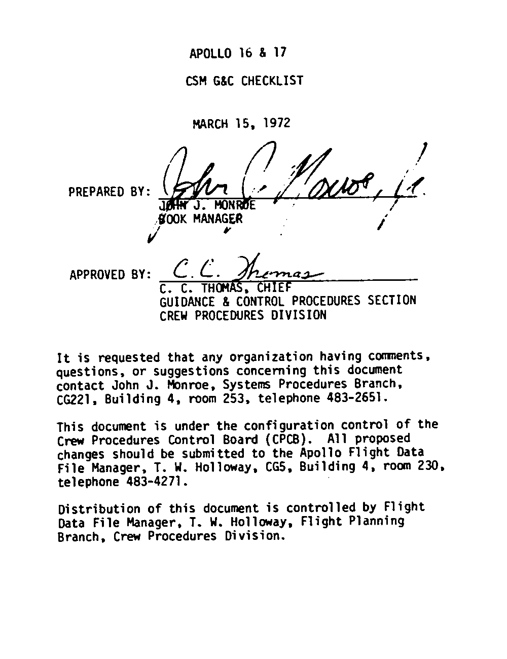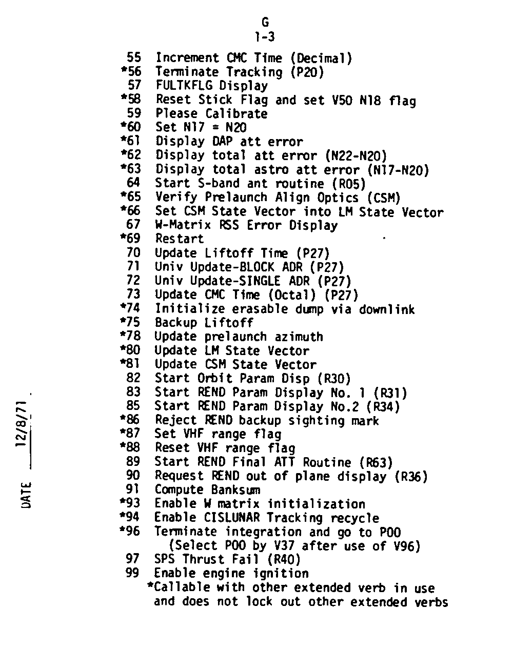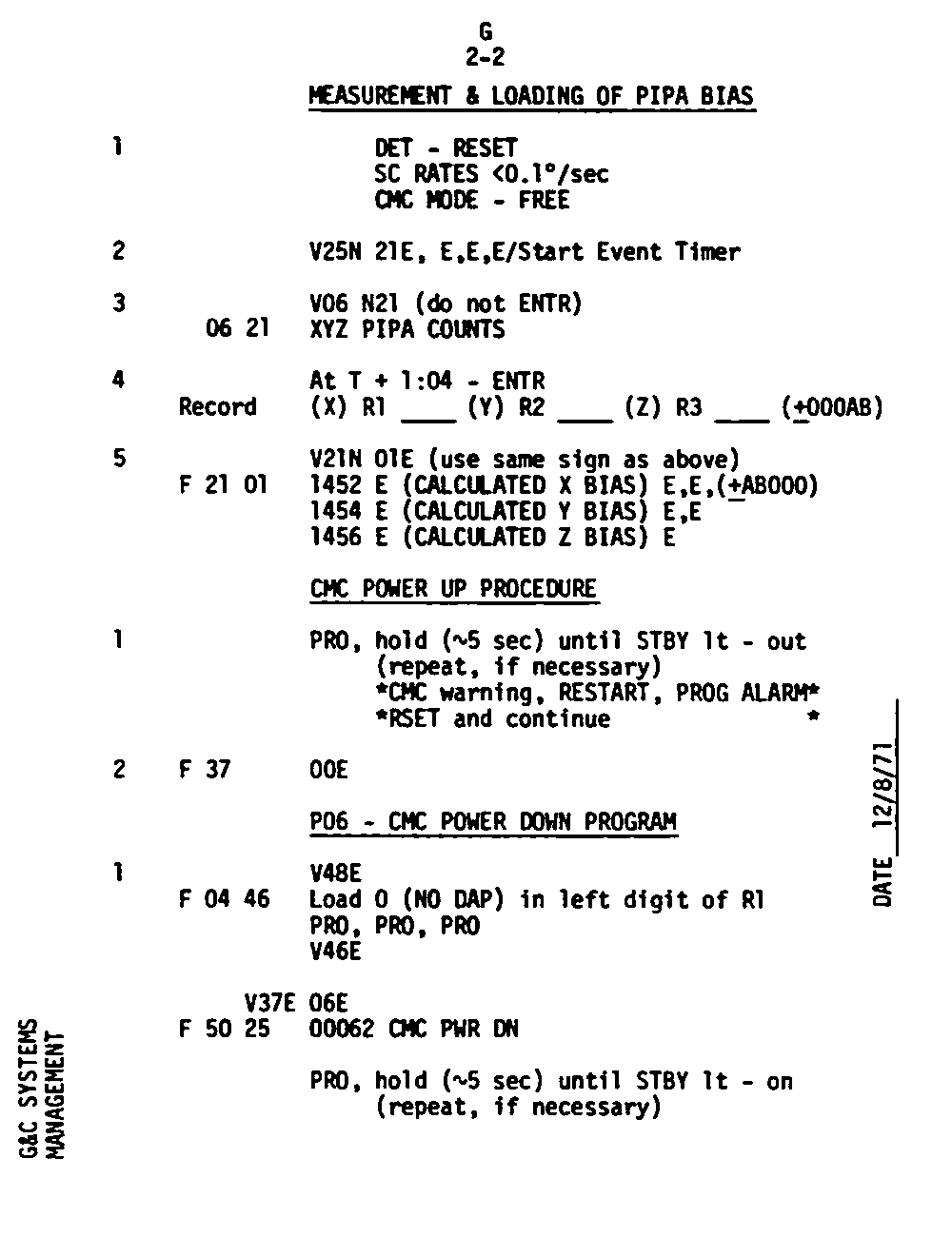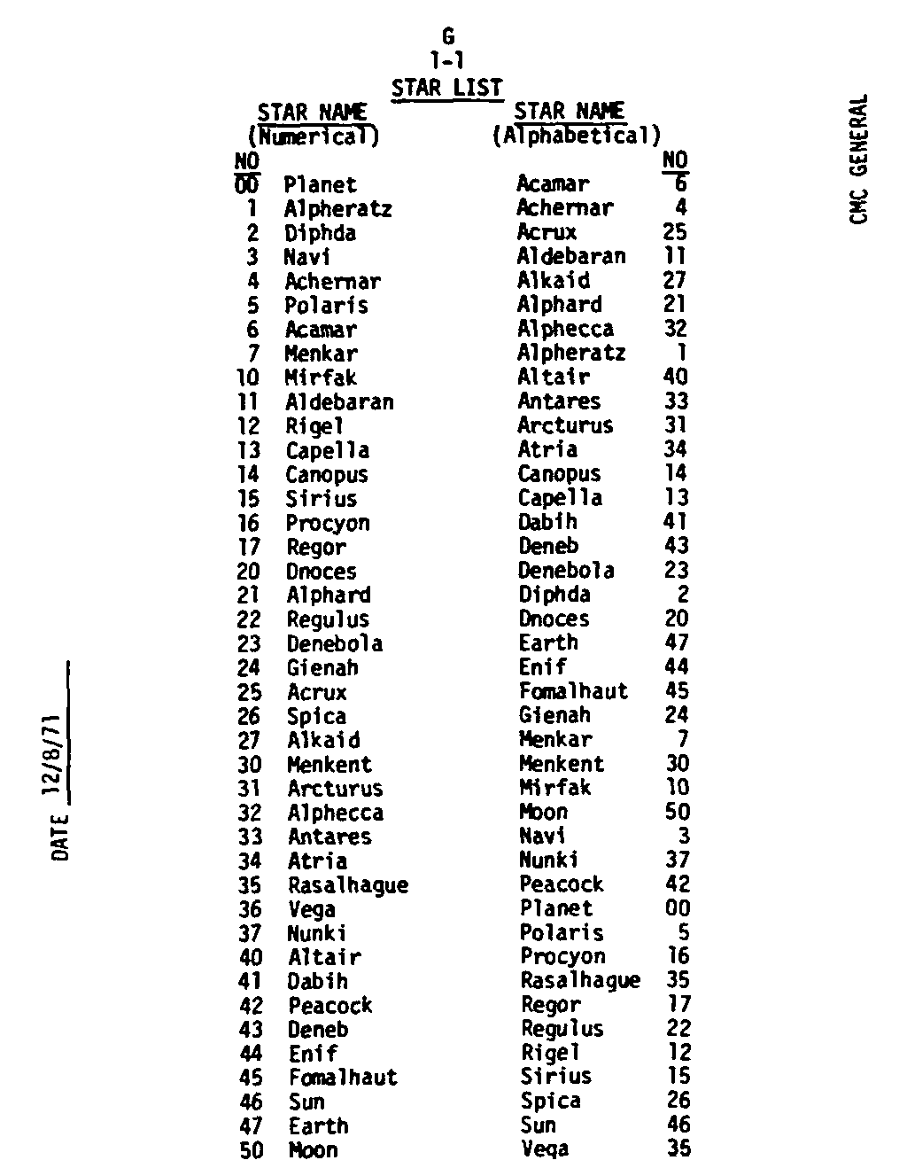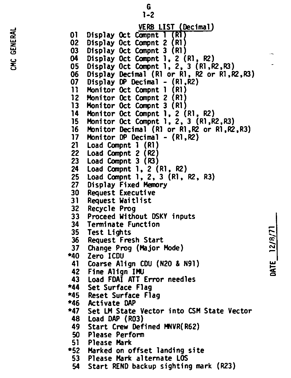 The Guidance and Control (G&C) Checklist provides the crew with a quick reference to the actions needed to operate the Command Module Conputer in its Guidance and Navigation functions. Like similar checklists in aircraft, the Apollo Checklists are intended as memory joggers, and are normally used by one cremember reading out the action, and the other crewmembers carrying out the requisite task.