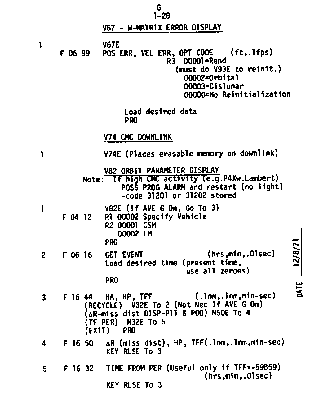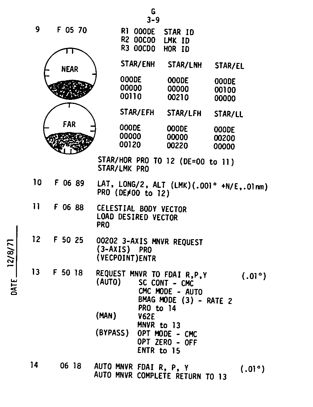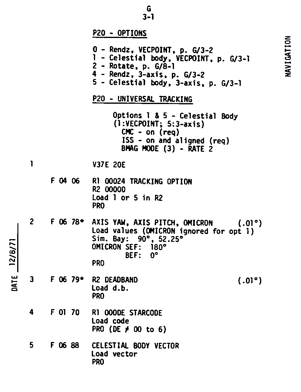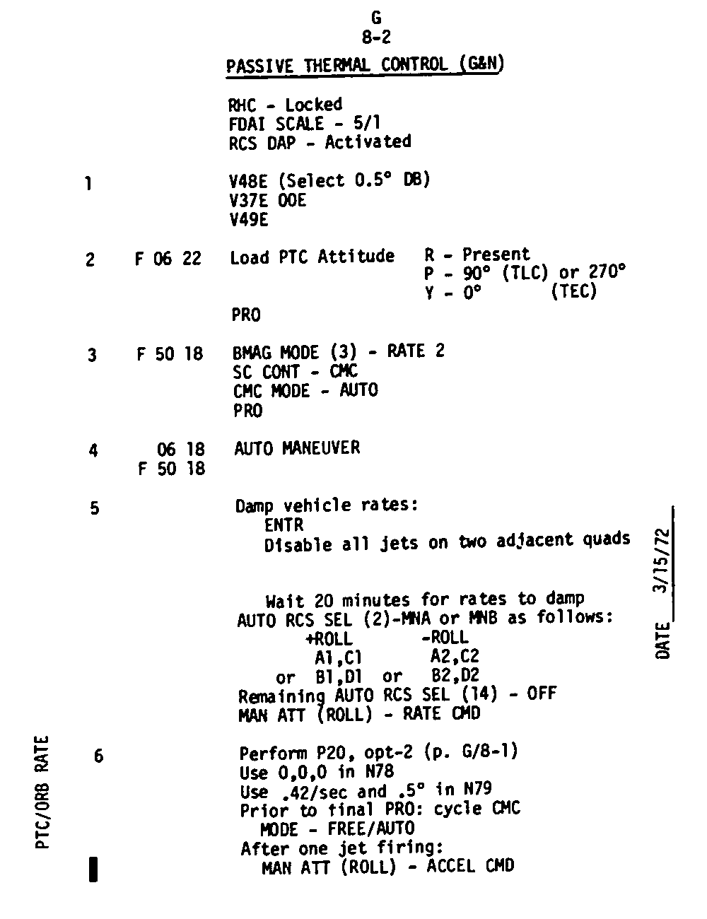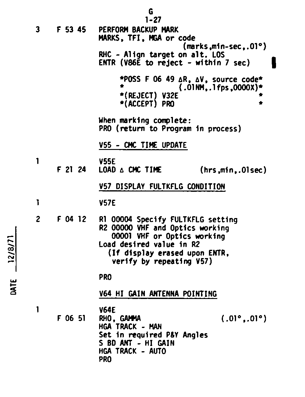 The Guidance and Control (G&C) Checklist provides the crew with a quick reference to the actions needed to operate the Command Module Conputer in its Guidance and Navigation functions. Like similar checklists in aircraft, the Apollo Checklists are intended as memory joggers, and are normally used by one cremember reading out the action, and the other crewmembers carrying out the requisite task.
