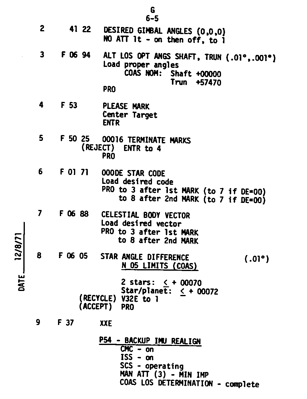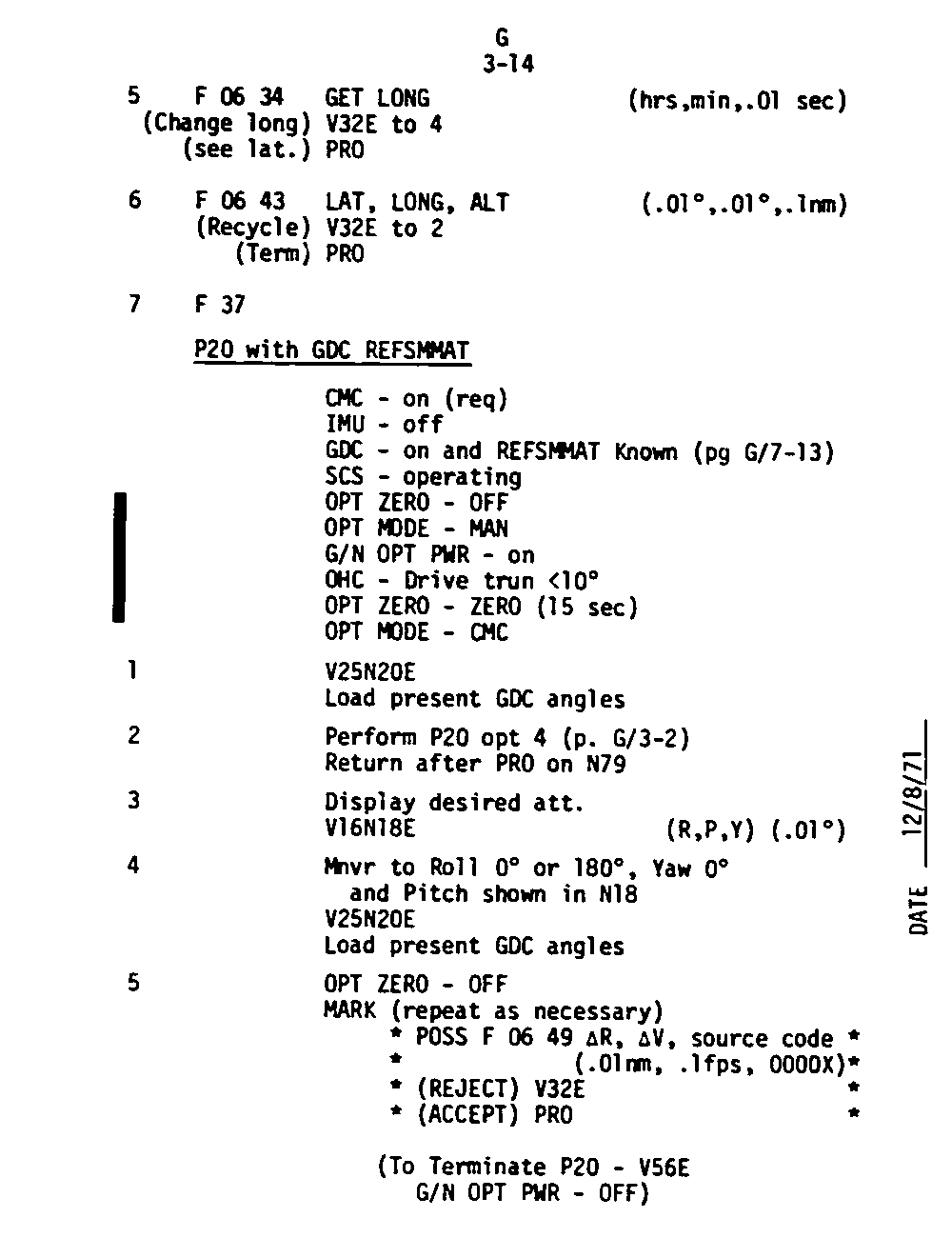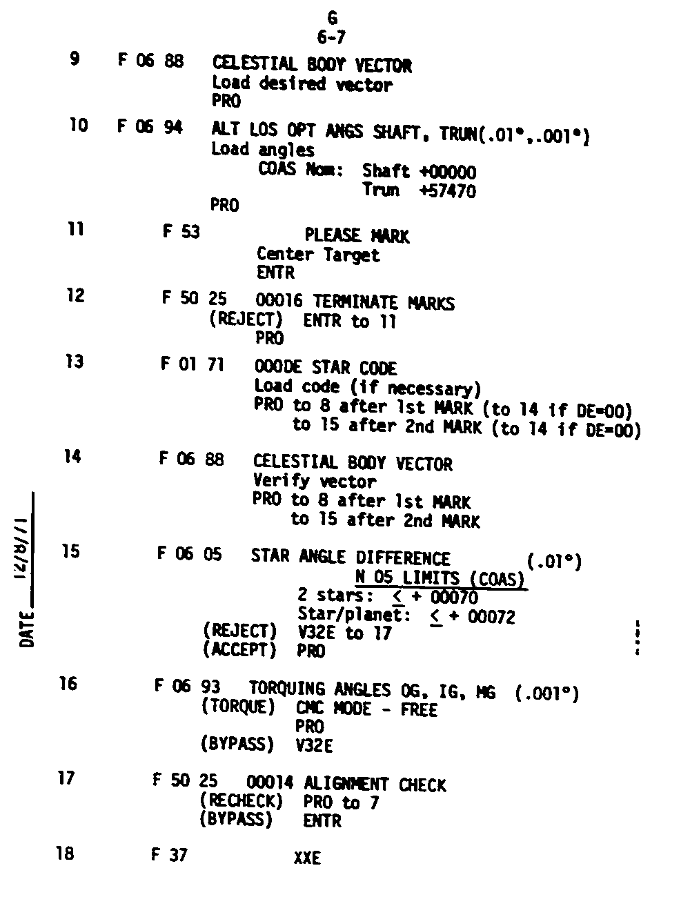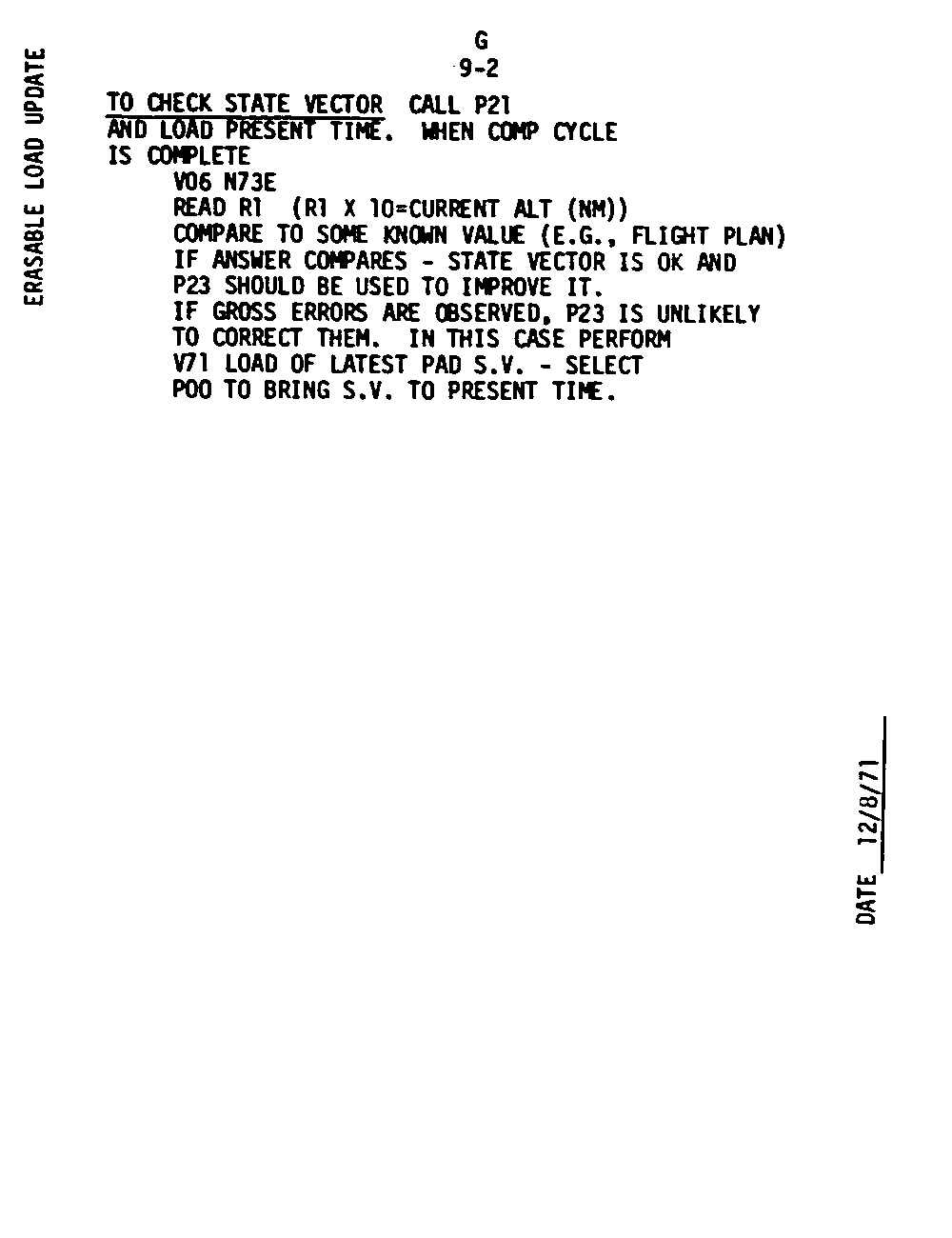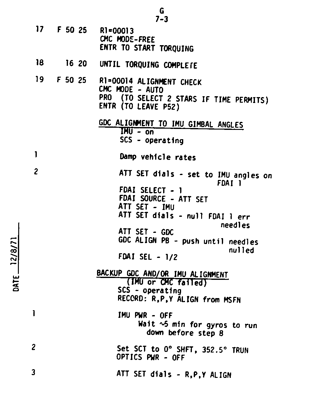 The Guidance and Control (G&C) Checklist provides the crew with a quick reference to the actions needed to operate the Command Module Conputer in its Guidance and Navigation functions. Like similar checklists in aircraft, the Apollo Checklists are intended as memory joggers, and are normally used by one cremember reading out the action, and the other crewmembers carrying out the requisite task.
