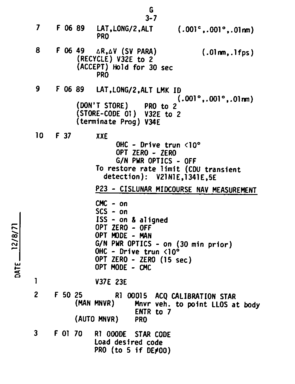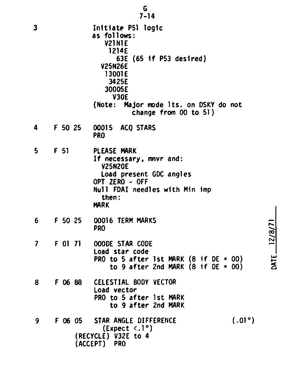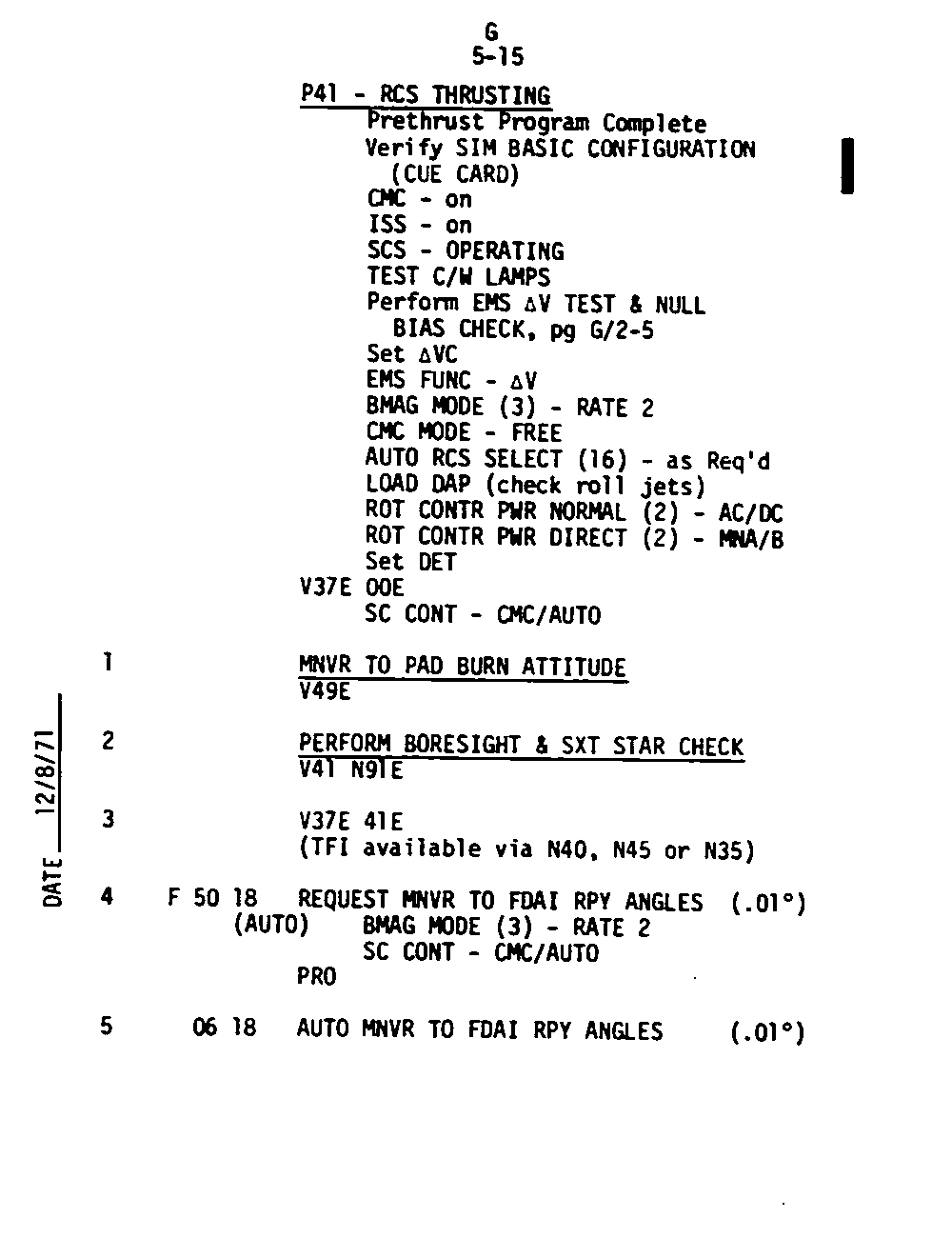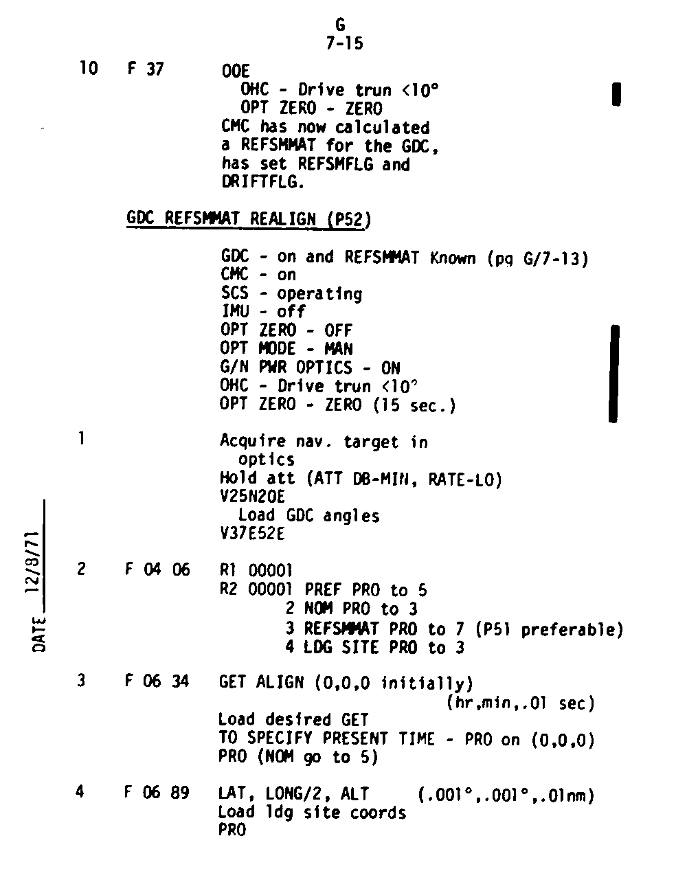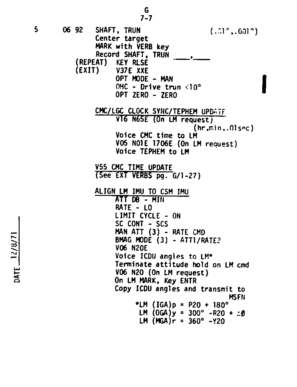 The Guidance and Control (G&C) Checklist provides the crew with a quick reference to the actions needed to operate the Command Module Conputer in its Guidance and Navigation functions. Like similar checklists in aircraft, the Apollo Checklists are intended as memory joggers, and are normally used by one cremember reading out the action, and the other crewmembers carrying out the requisite task.