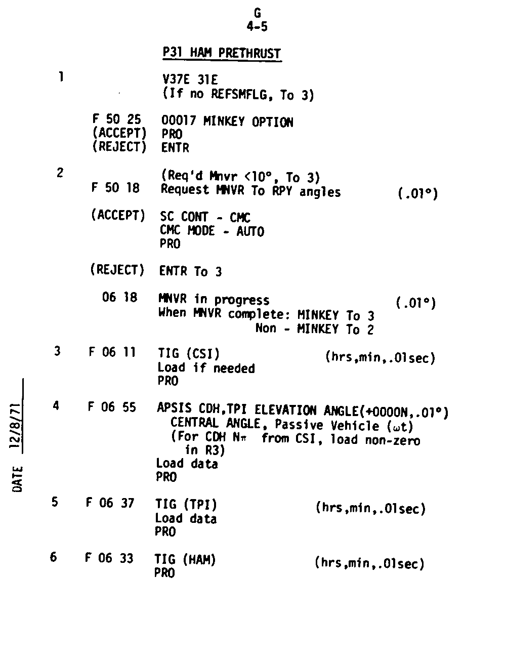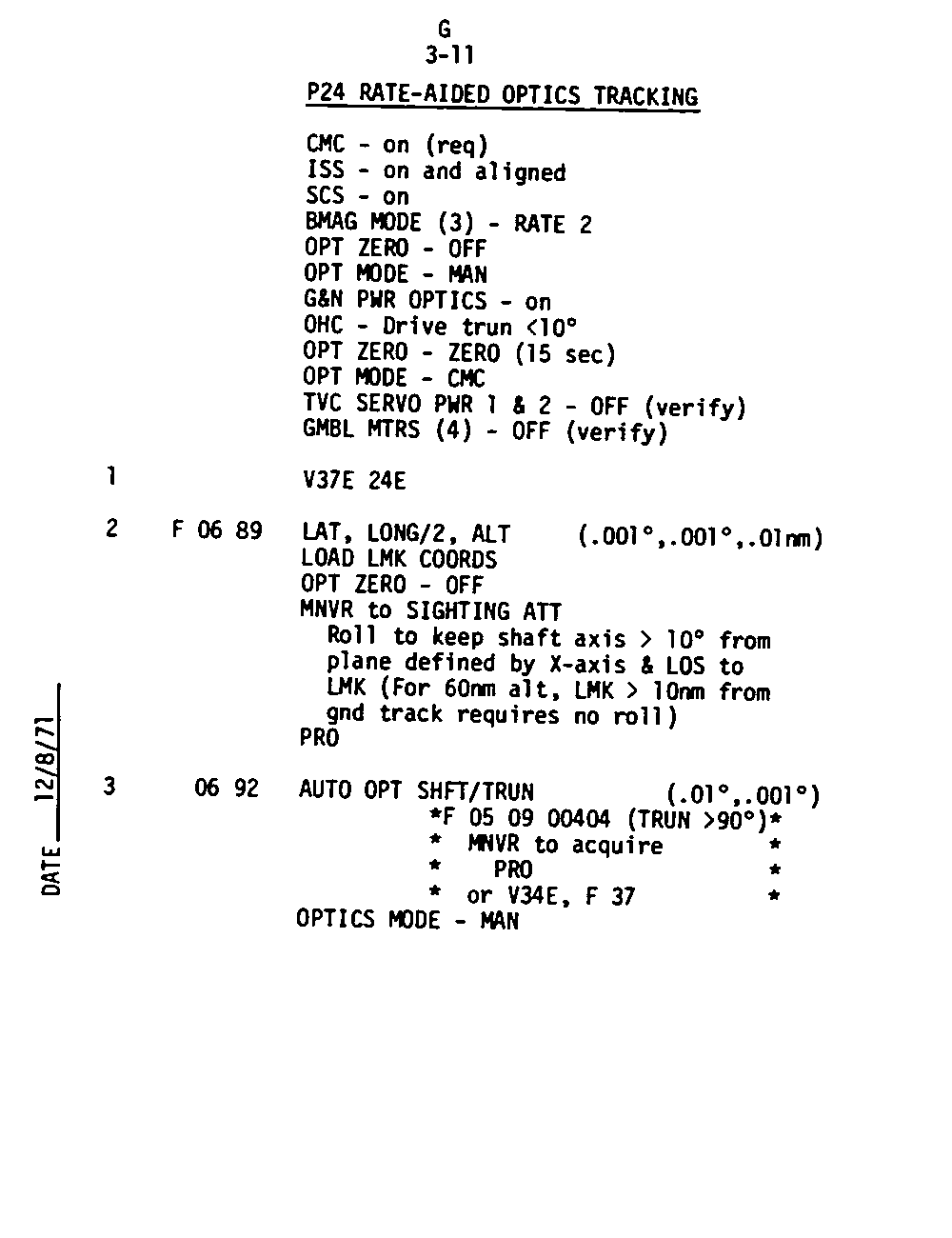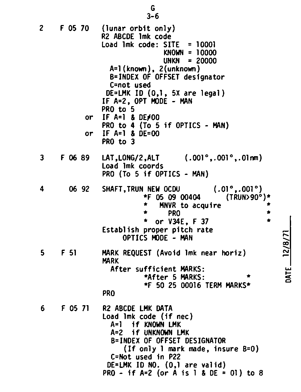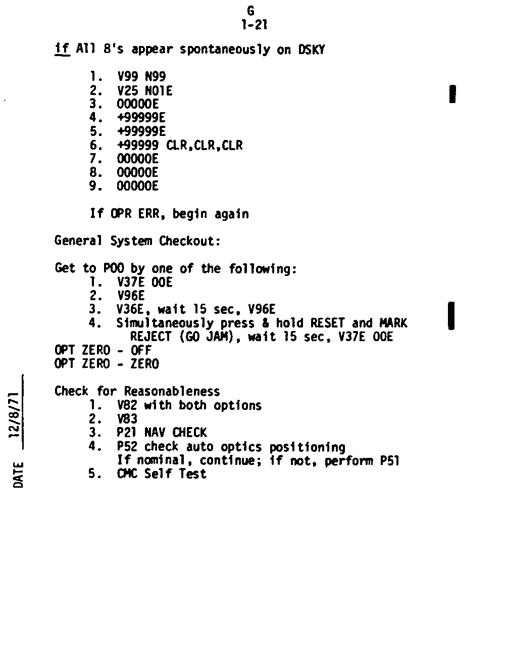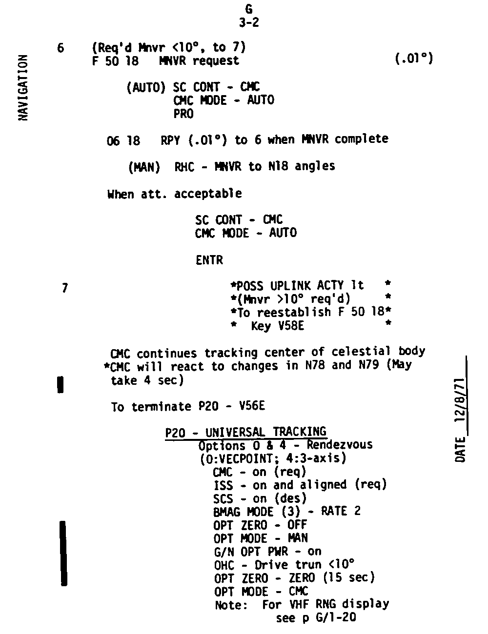 The Guidance and Control (G&C) Checklist provides the crew with a quick reference to the actions needed to operate the Command Module Conputer in its Guidance and Navigation functions. Like similar checklists in aircraft, the Apollo Checklists are intended as memory joggers, and are normally used by one cremember reading out the action, and the other crewmembers carrying out the requisite task.