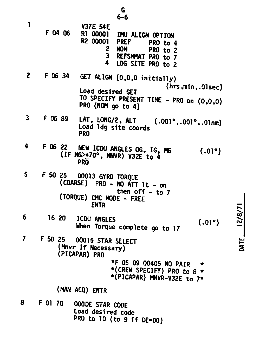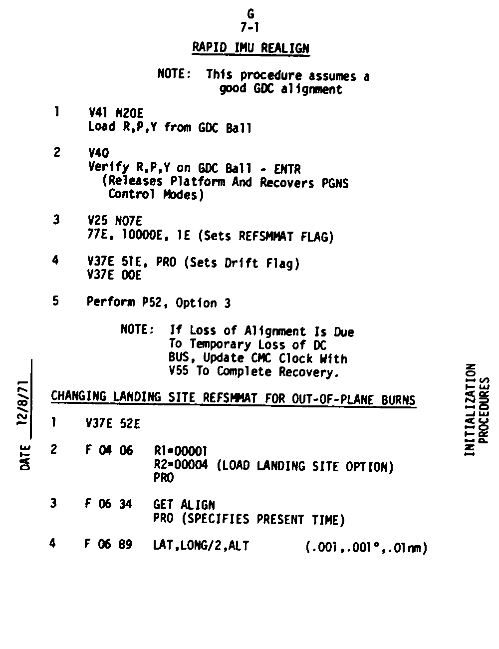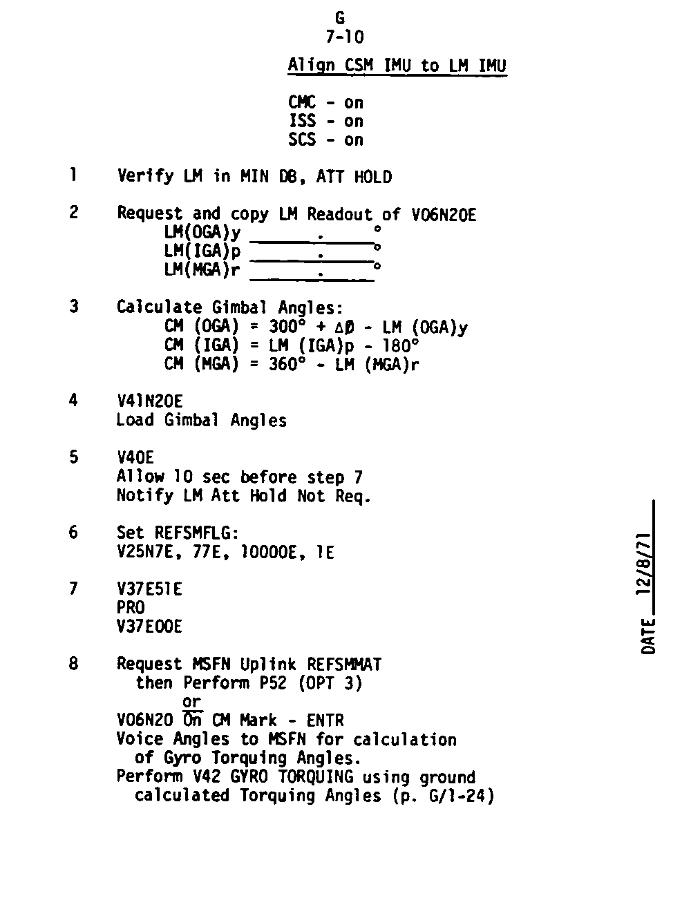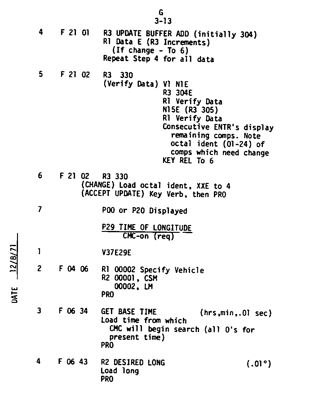 The Guidance and Control (G&C) Checklist provides the crew with a quick reference to the actions needed to operate the Command Module Conputer in its Guidance and Navigation functions. Like similar checklists in aircraft, the Apollo Checklists are intended as memory joggers, and are normally used by one cremember reading out the action, and the other crewmembers carrying out the requisite task.