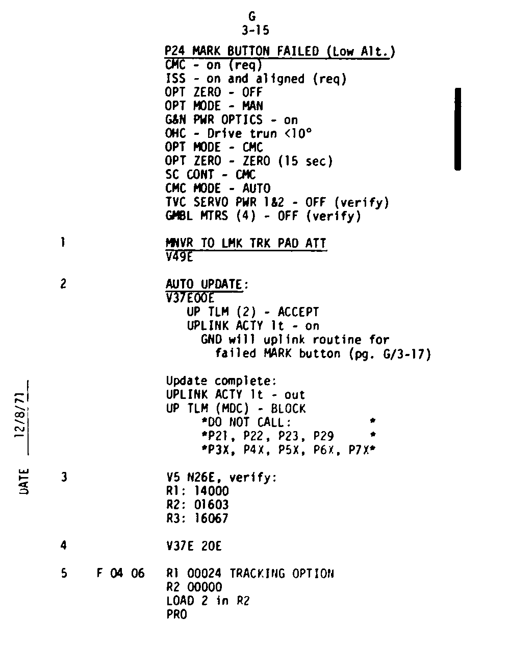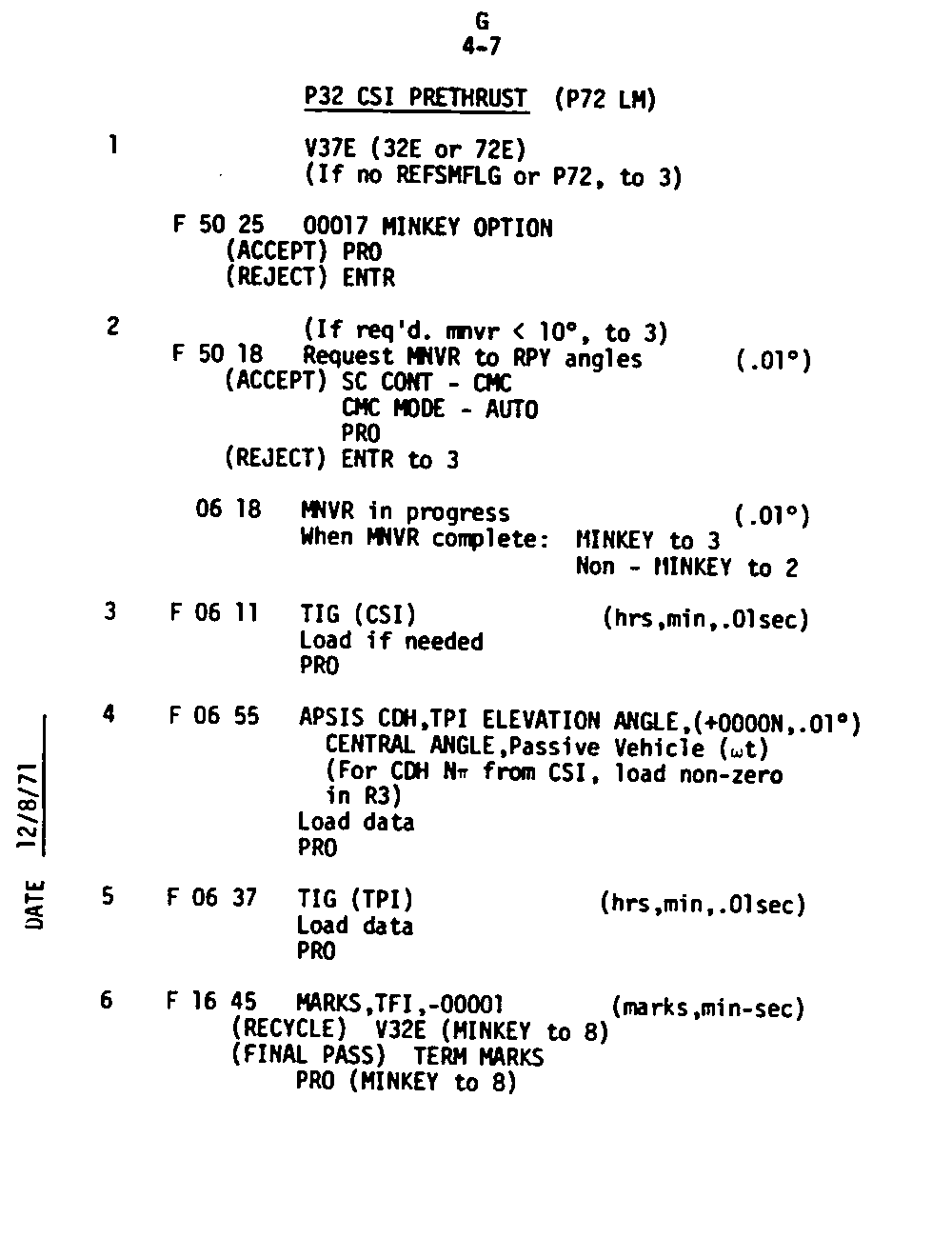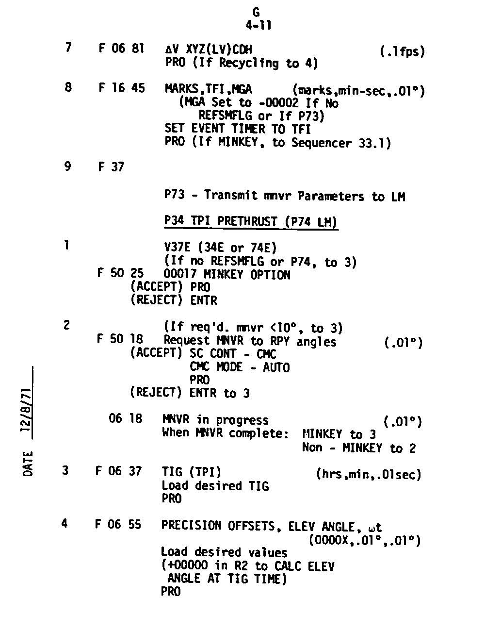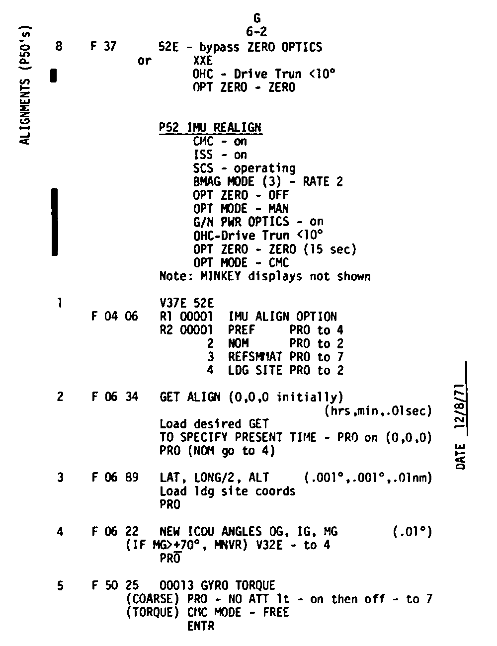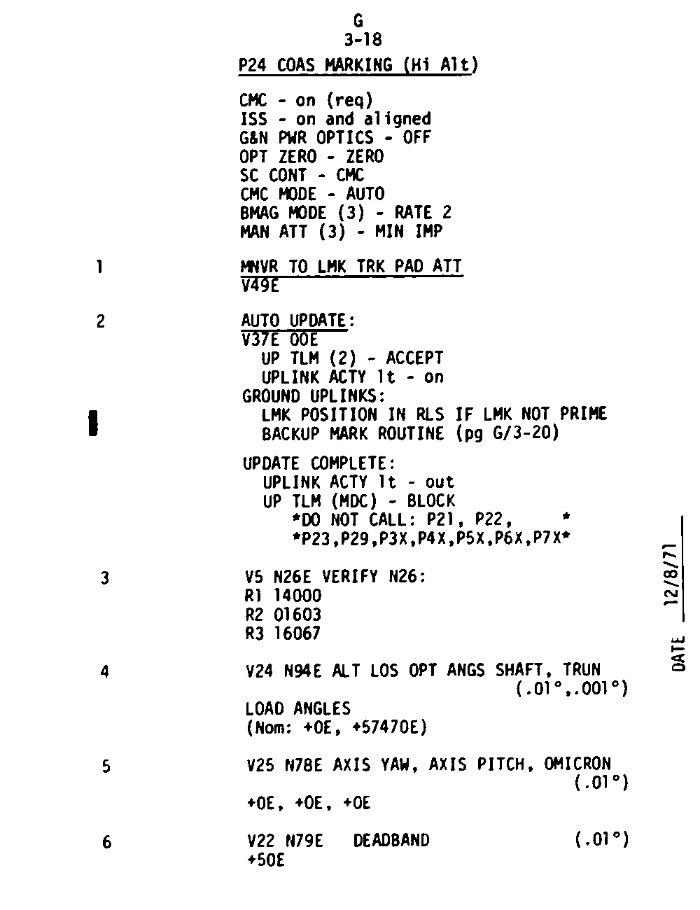 The Guidance and Control (G&C) Checklist provides the crew with a quick reference to the actions needed to operate the Command Module Conputer in its Guidance and Navigation functions. Like similar checklists in aircraft, the Apollo Checklists are intended as memory joggers, and are normally used by one cremember reading out the action, and the other crewmembers carrying out the requisite task.