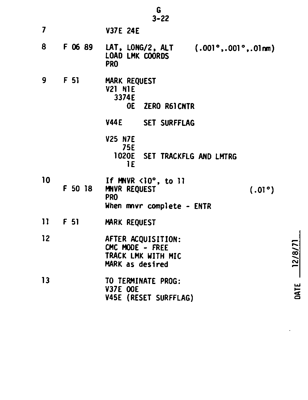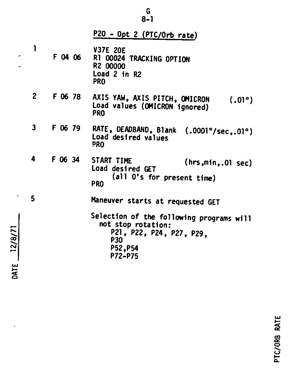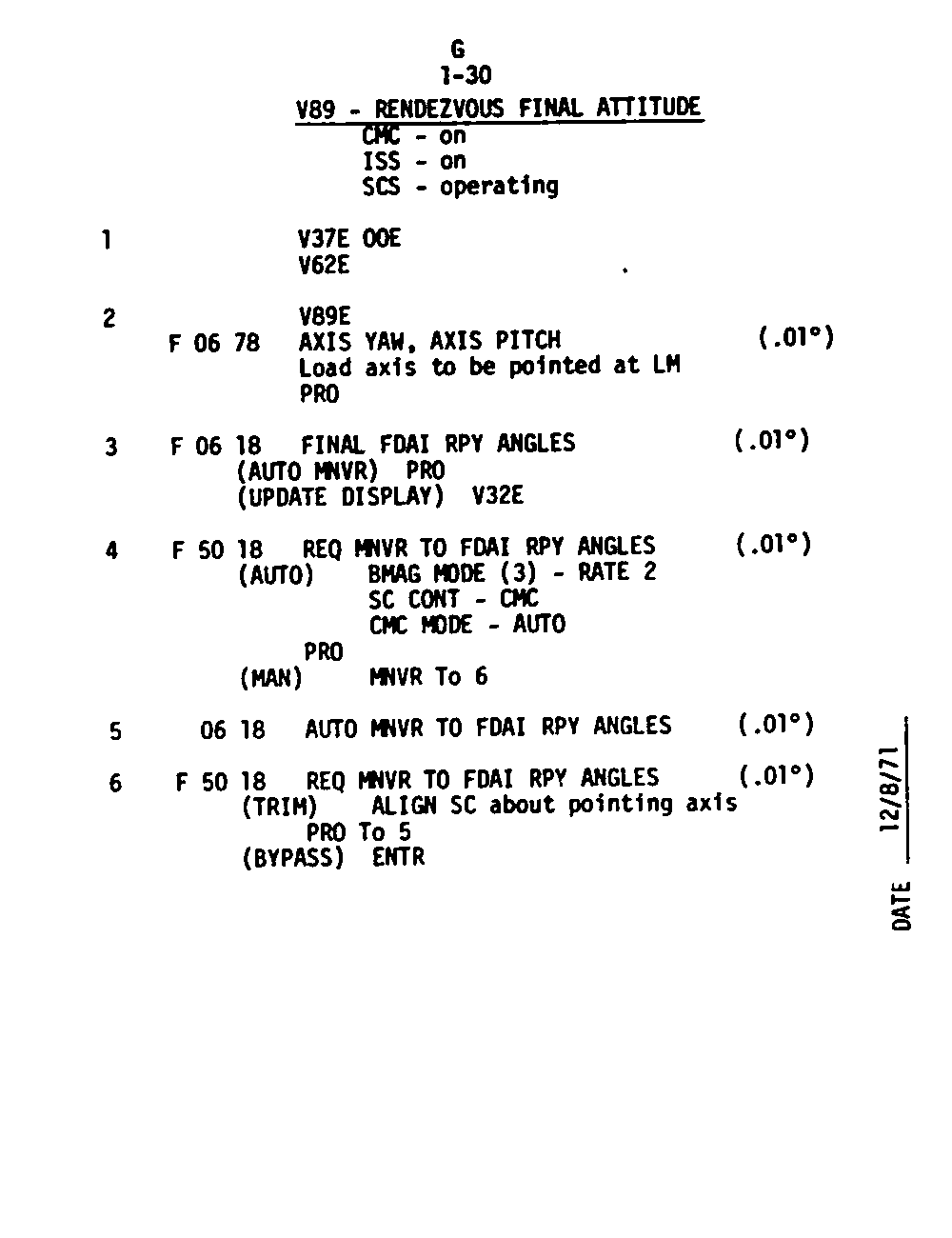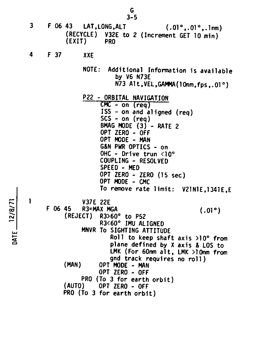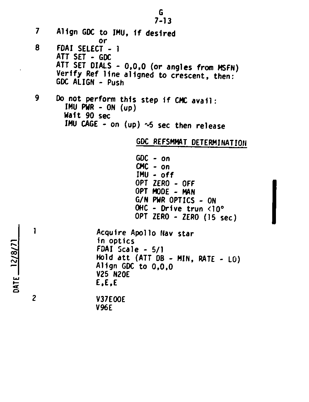 The Guidance and Control (G&C) Checklist provides the crew with a quick reference to the actions needed to operate the Command Module Conputer in its Guidance and Navigation functions. Like similar checklists in aircraft, the Apollo Checklists are intended as memory joggers, and are normally used by one cremember reading out the action, and the other crewmembers carrying out the requisite task.