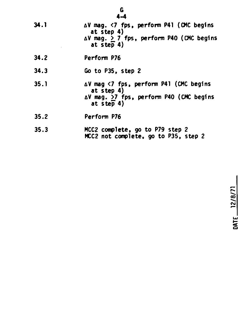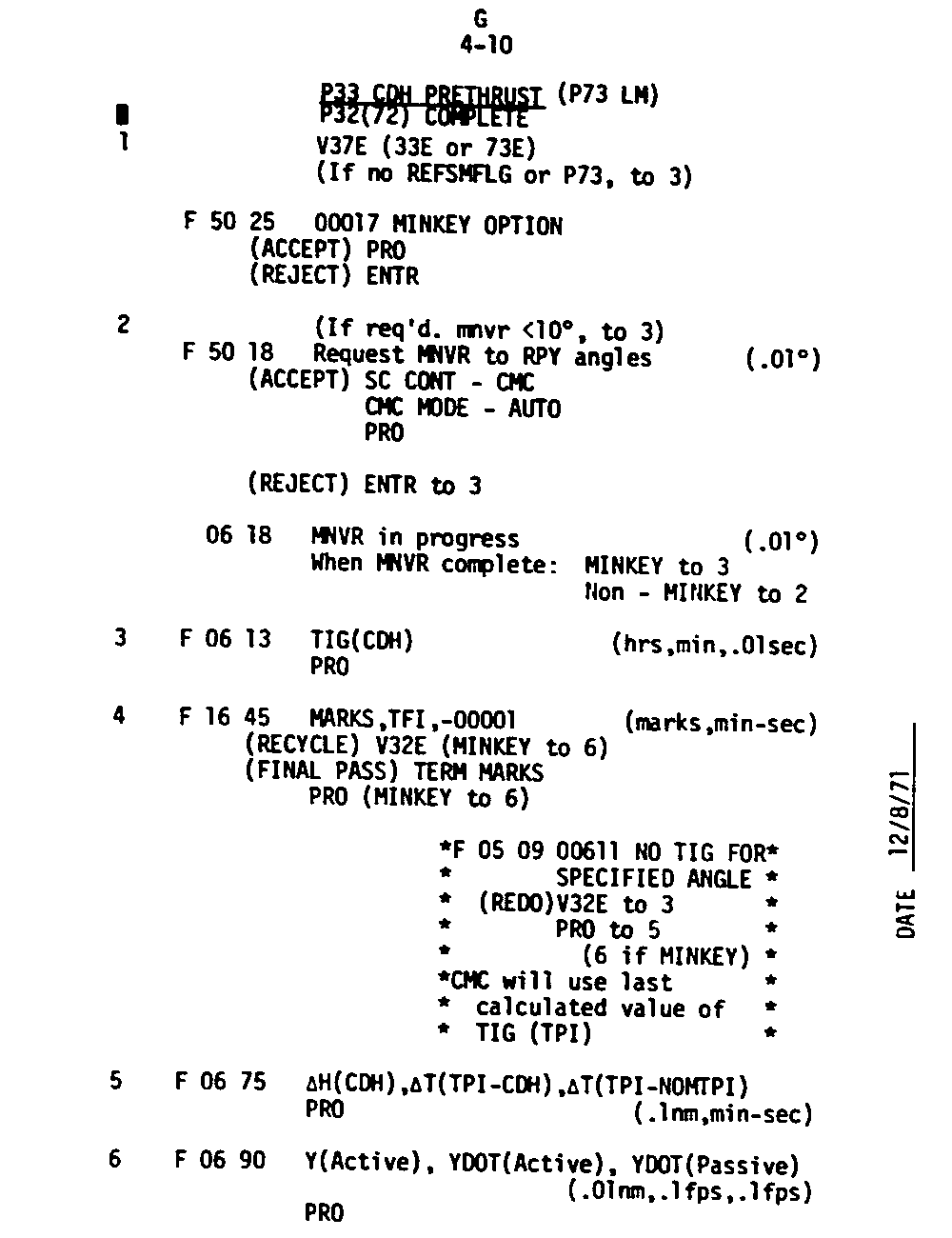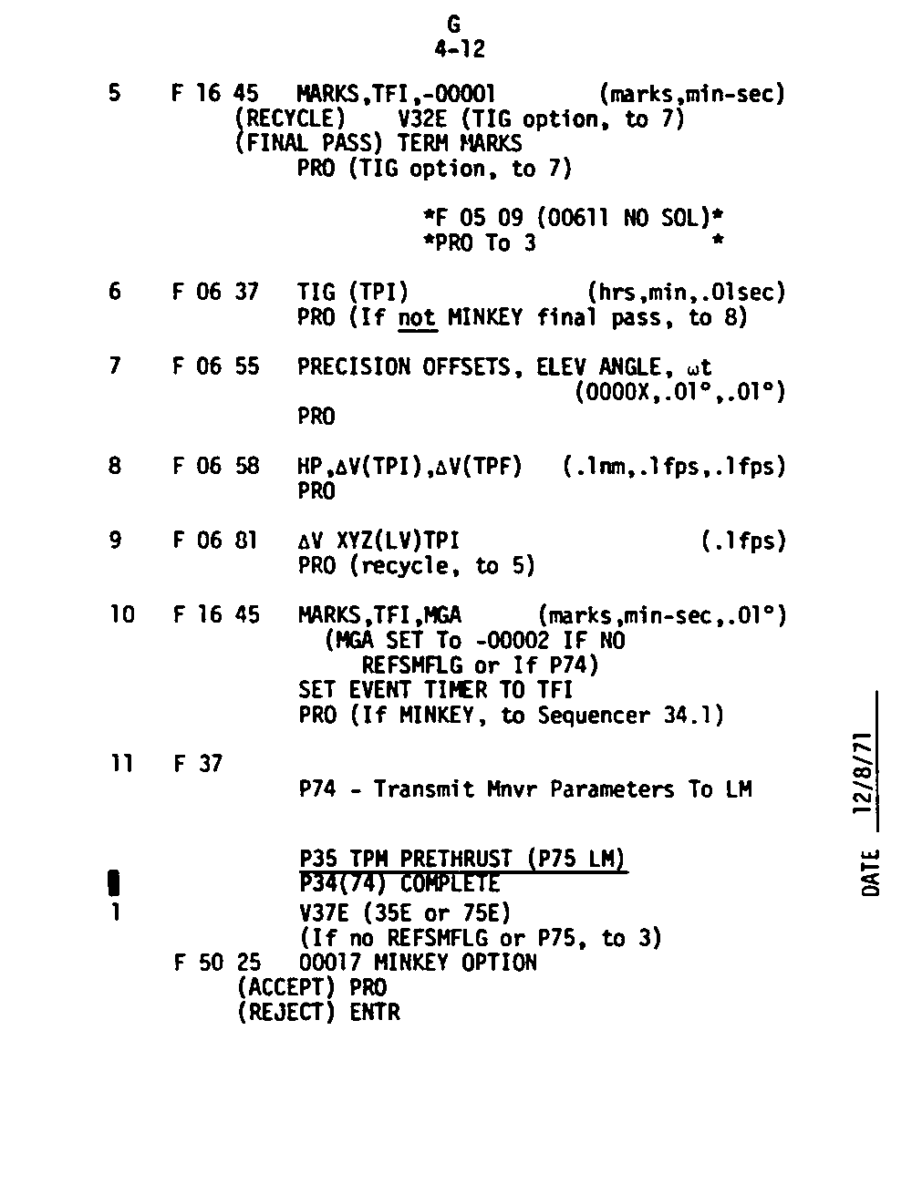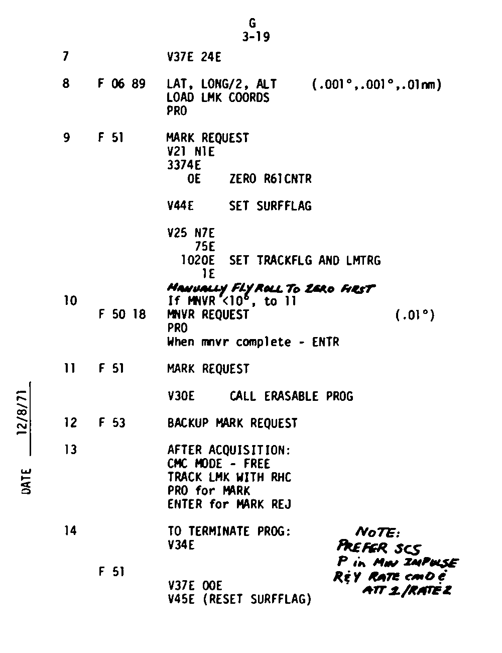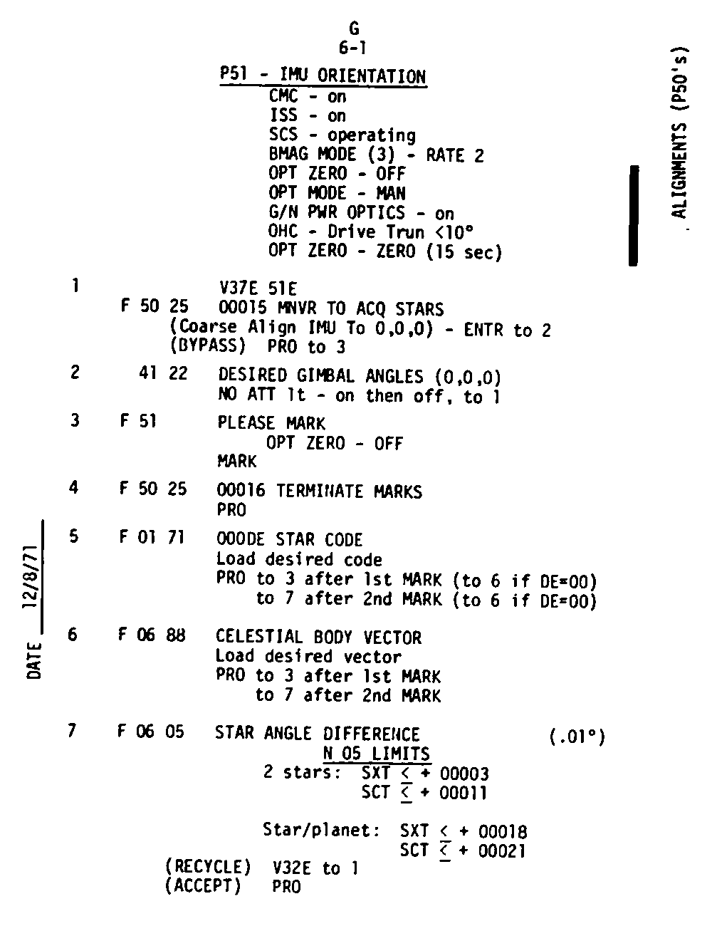 The Guidance and Control (G&C) Checklist provides the crew with a quick reference to the actions needed to operate the Command Module Conputer in its Guidance and Navigation functions. Like similar checklists in aircraft, the Apollo Checklists are intended as memory joggers, and are normally used by one cremember reading out the action, and the other crewmembers carrying out the requisite task.