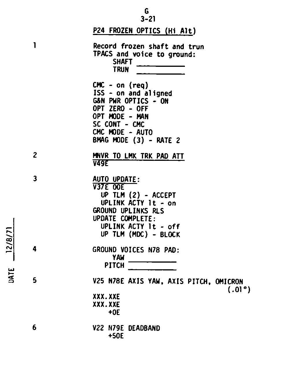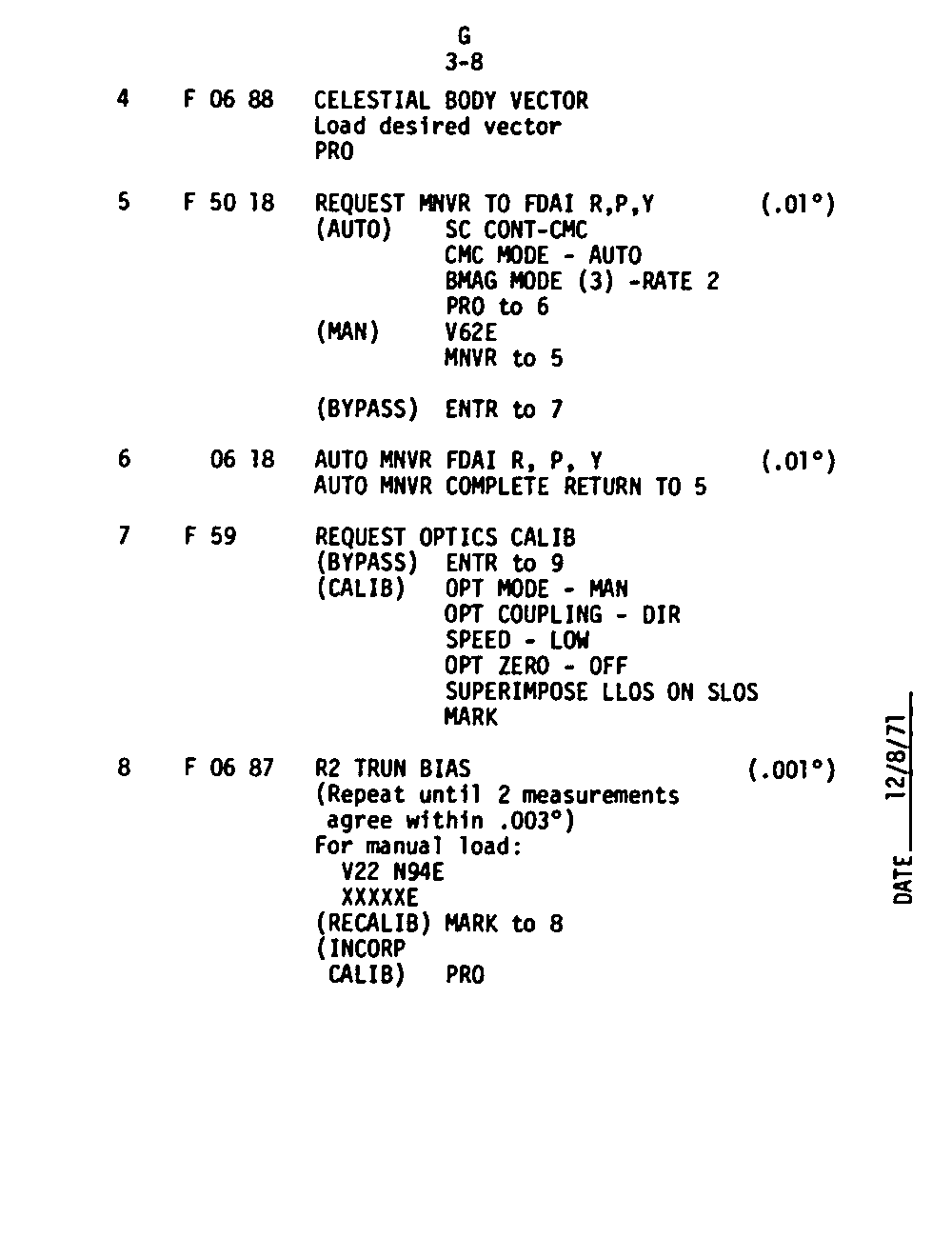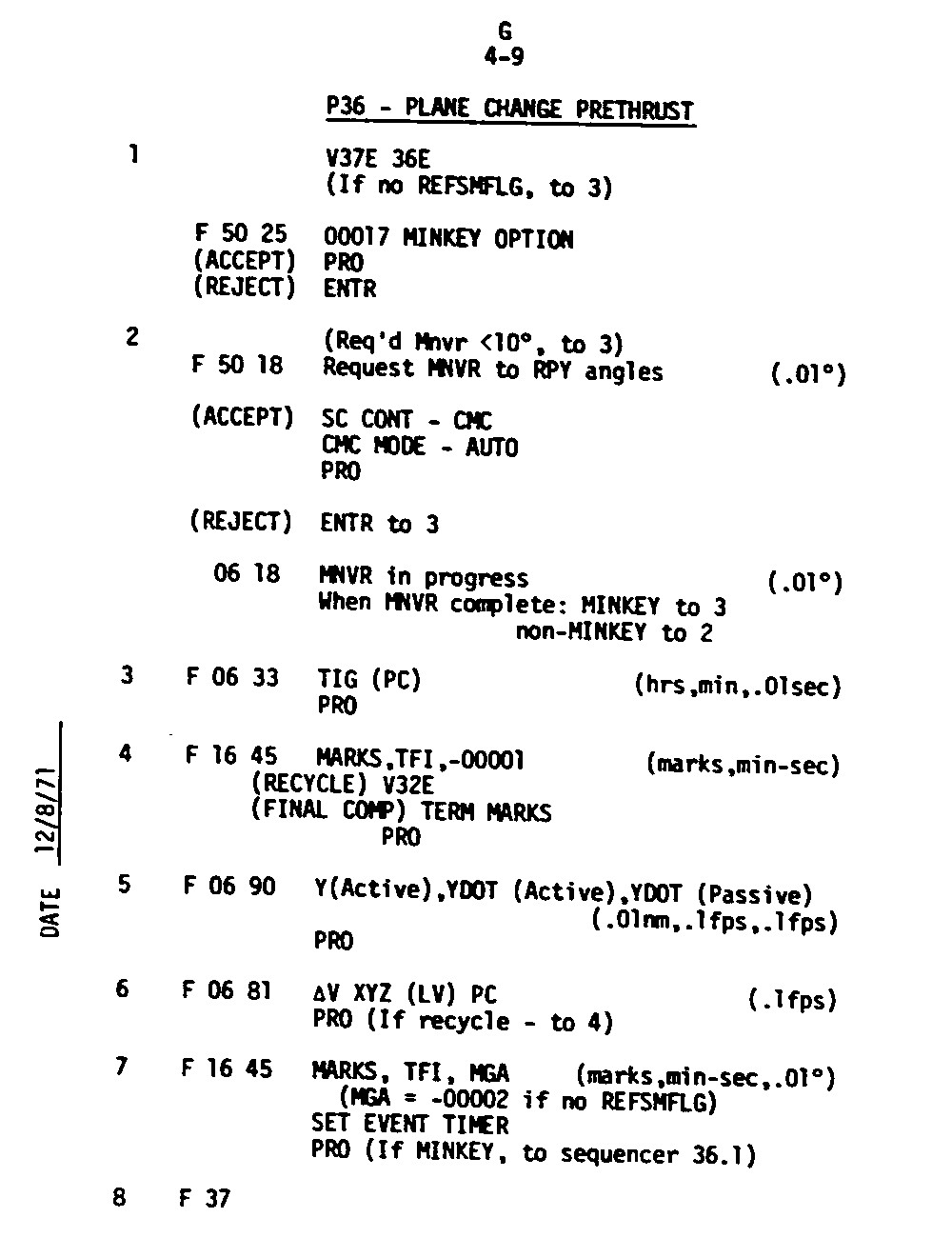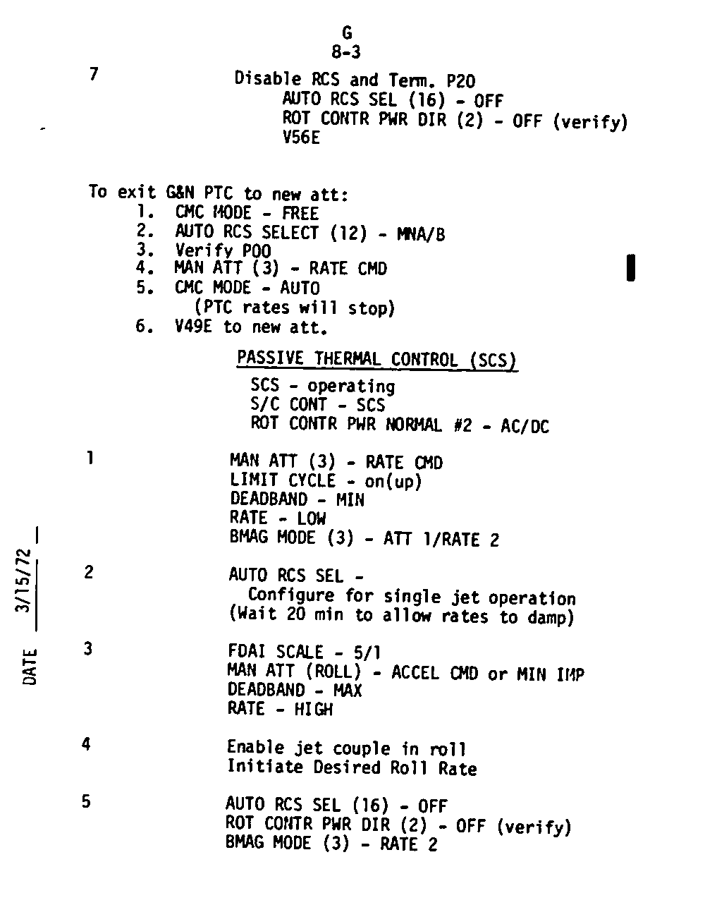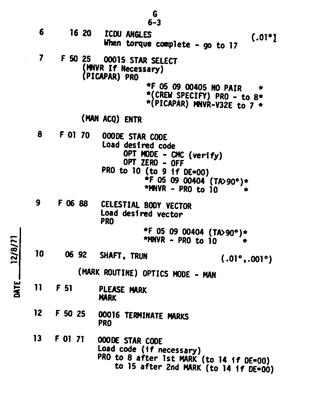 The Guidance and Control (G&C) Checklist provides the crew with a quick reference to the actions needed to operate the Command Module Conputer in its Guidance and Navigation functions. Like similar checklists in aircraft, the Apollo Checklists are intended as memory joggers, and are normally used by one cremember reading out the action, and the other crewmembers carrying out the requisite task.