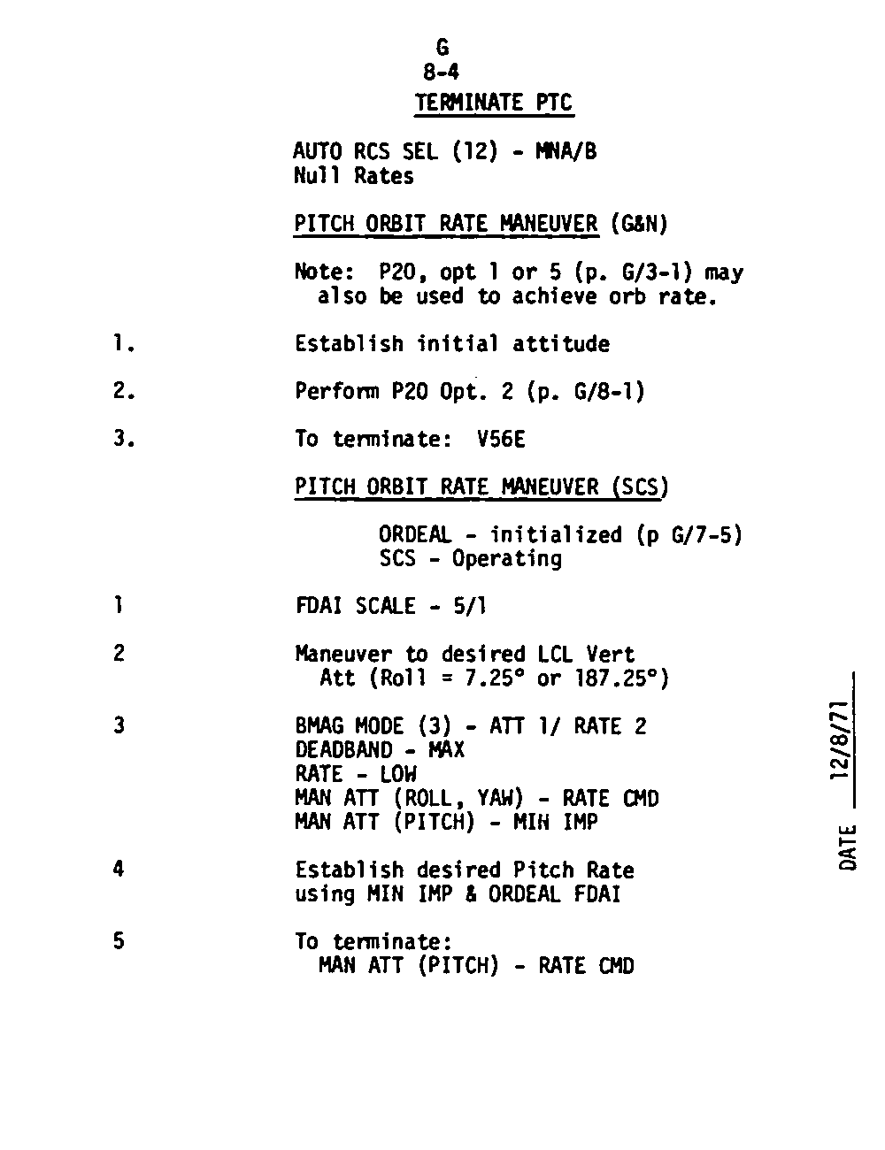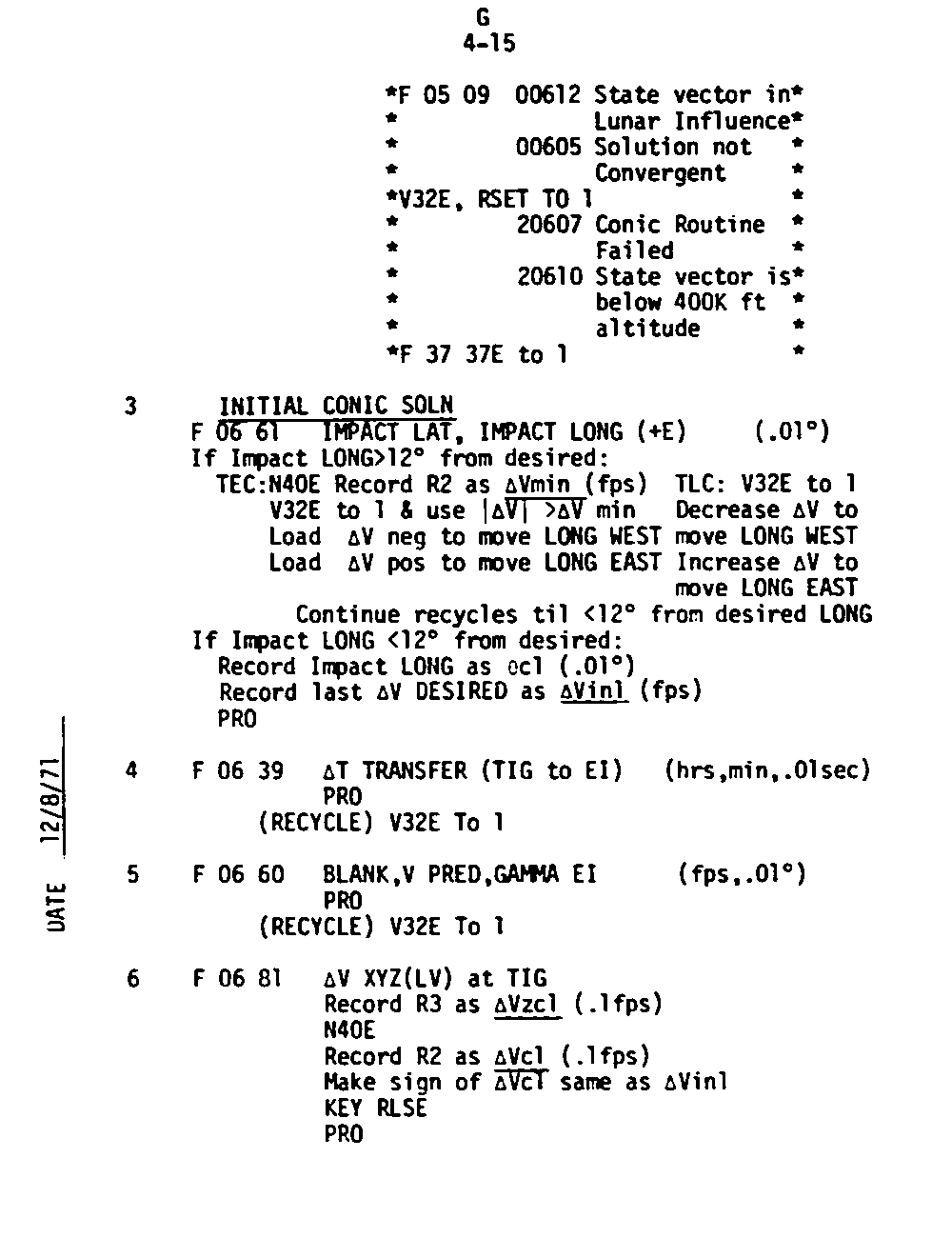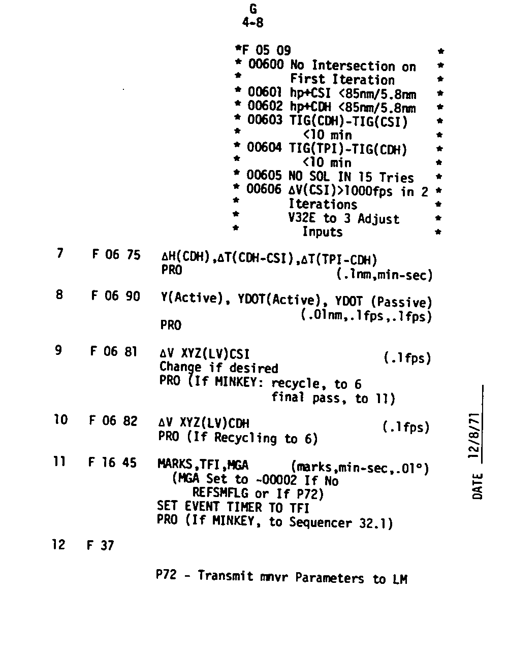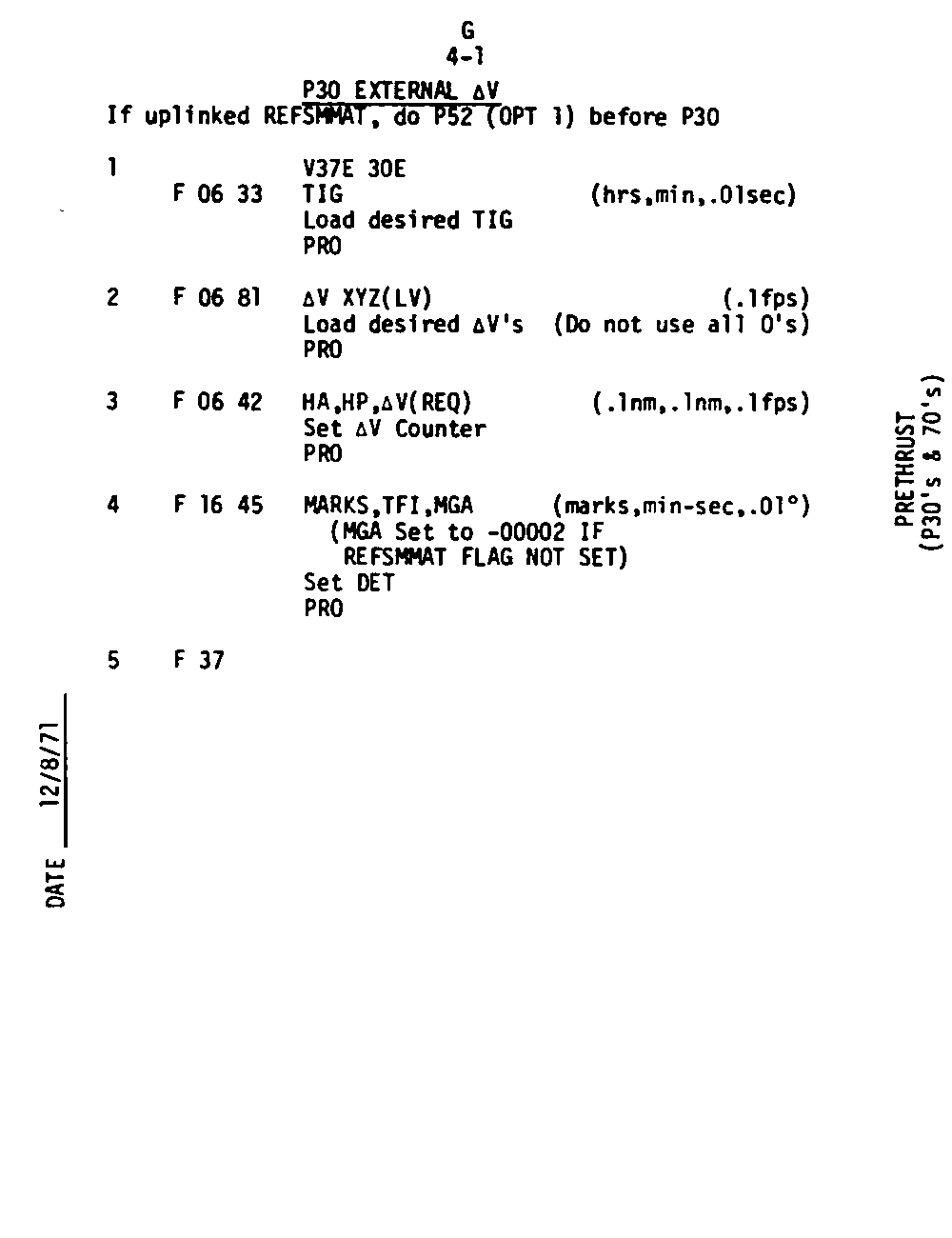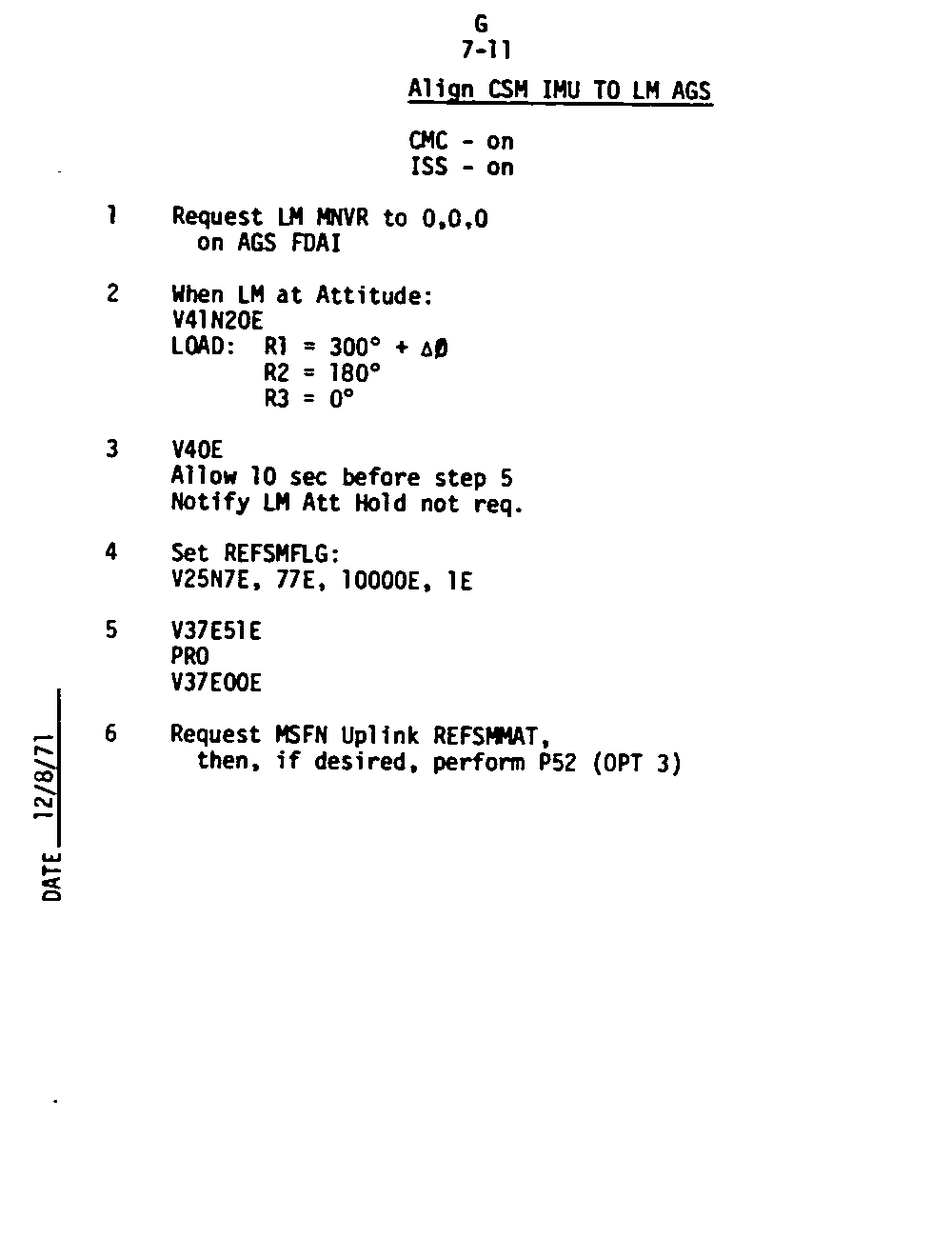 The Guidance and Control (G&C) Checklist provides the crew with a quick reference to the actions needed to operate the Command Module Conputer in its Guidance and Navigation functions. Like similar checklists in aircraft, the Apollo Checklists are intended as memory joggers, and are normally used by one cremember reading out the action, and the other crewmembers carrying out the requisite task.