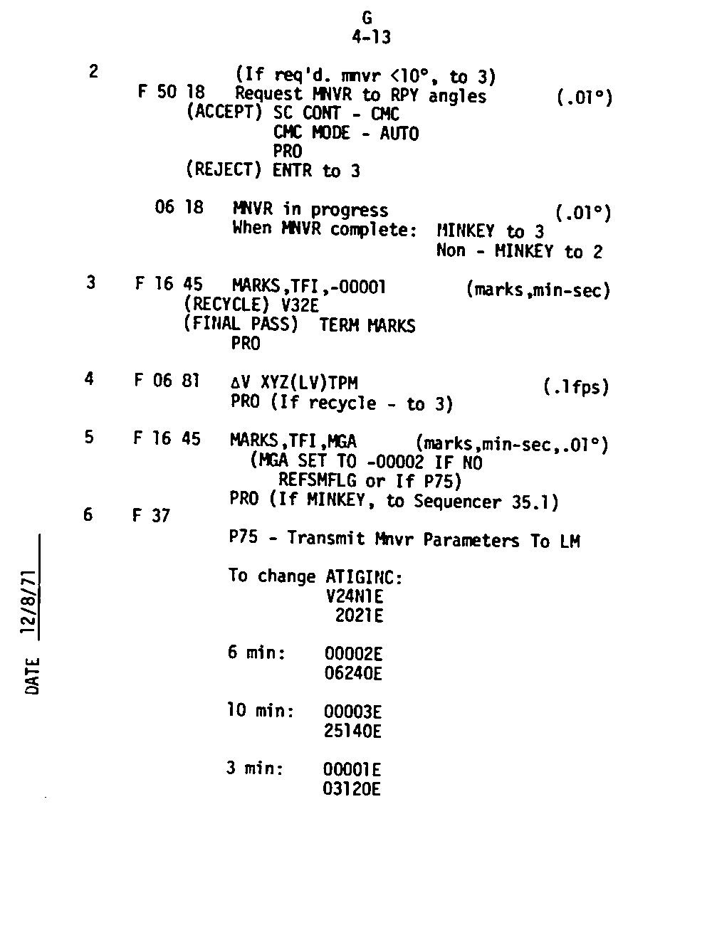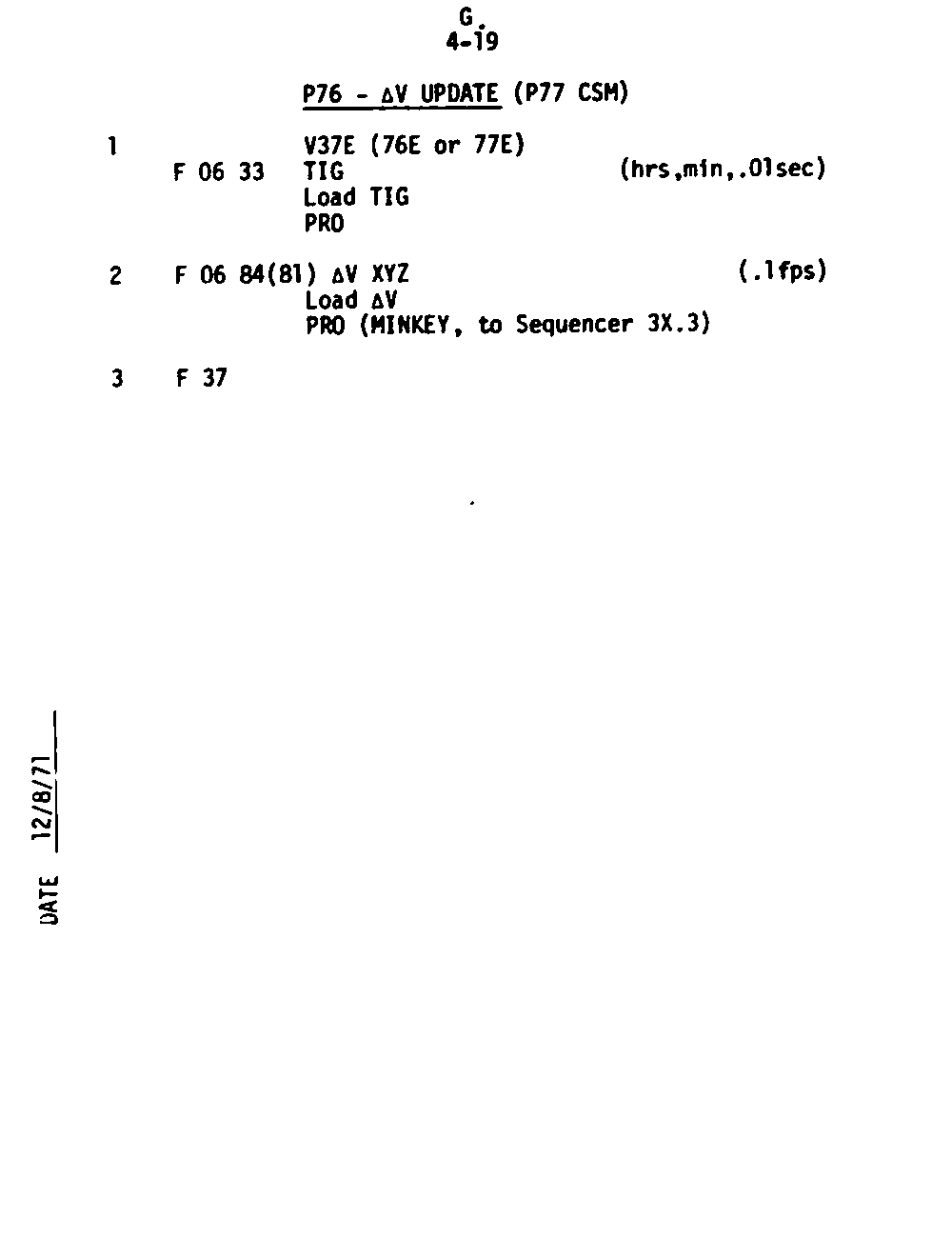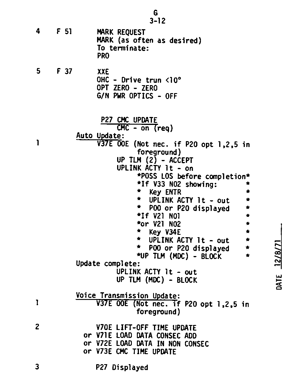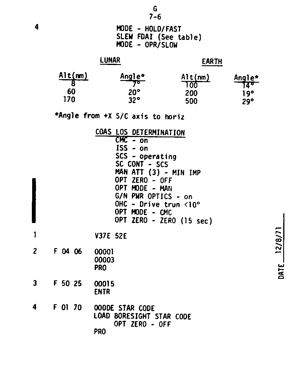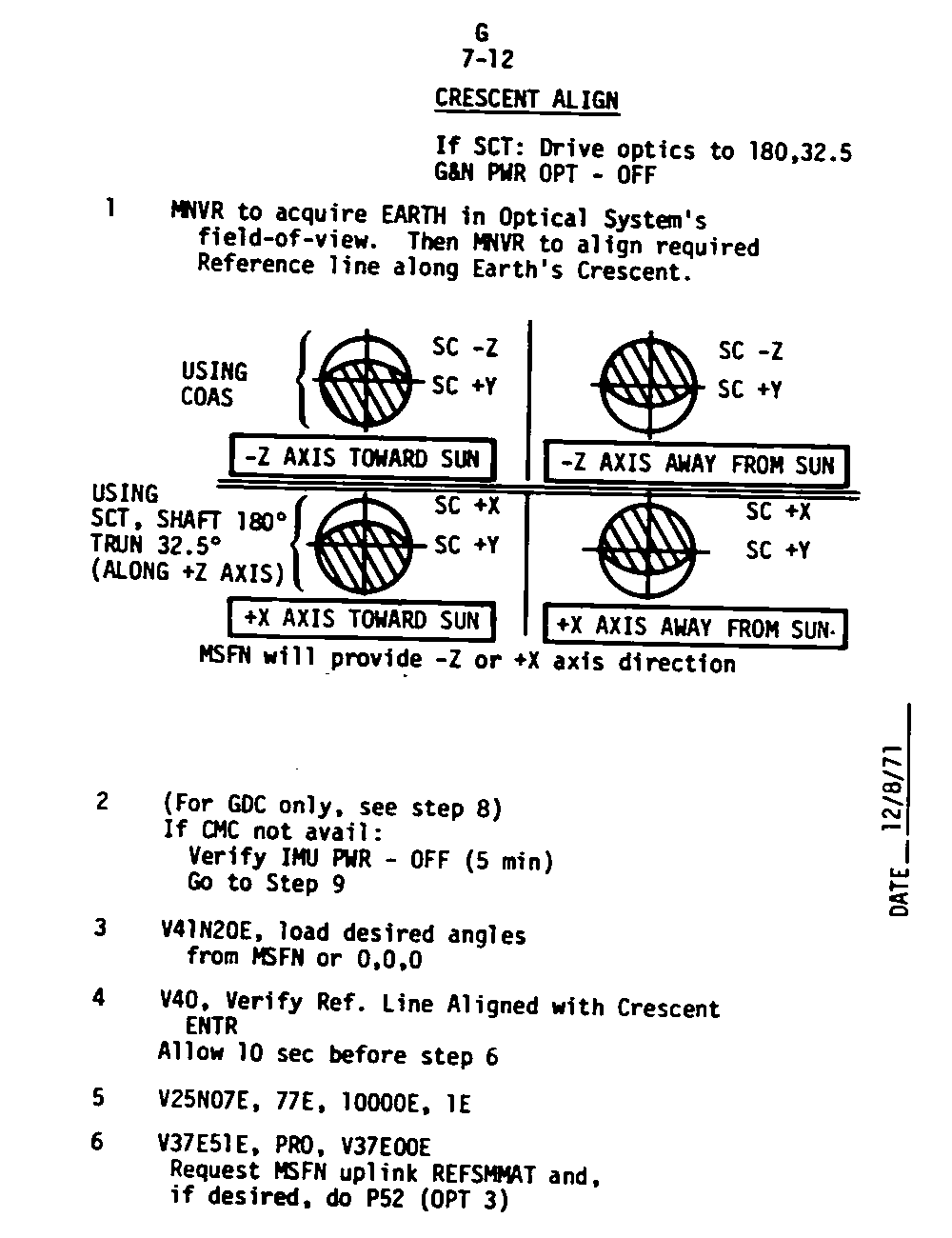 The Guidance and Control (G&C) Checklist provides the crew with a quick reference to the actions needed to operate the Command Module Conputer in its Guidance and Navigation functions. Like similar checklists in aircraft, the Apollo Checklists are intended as memory joggers, and are normally used by one cremember reading out the action, and the other crewmembers carrying out the requisite task.