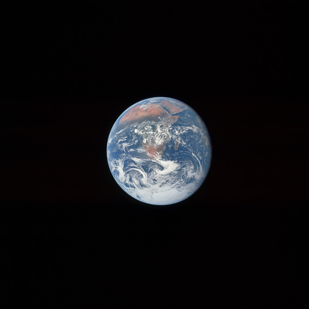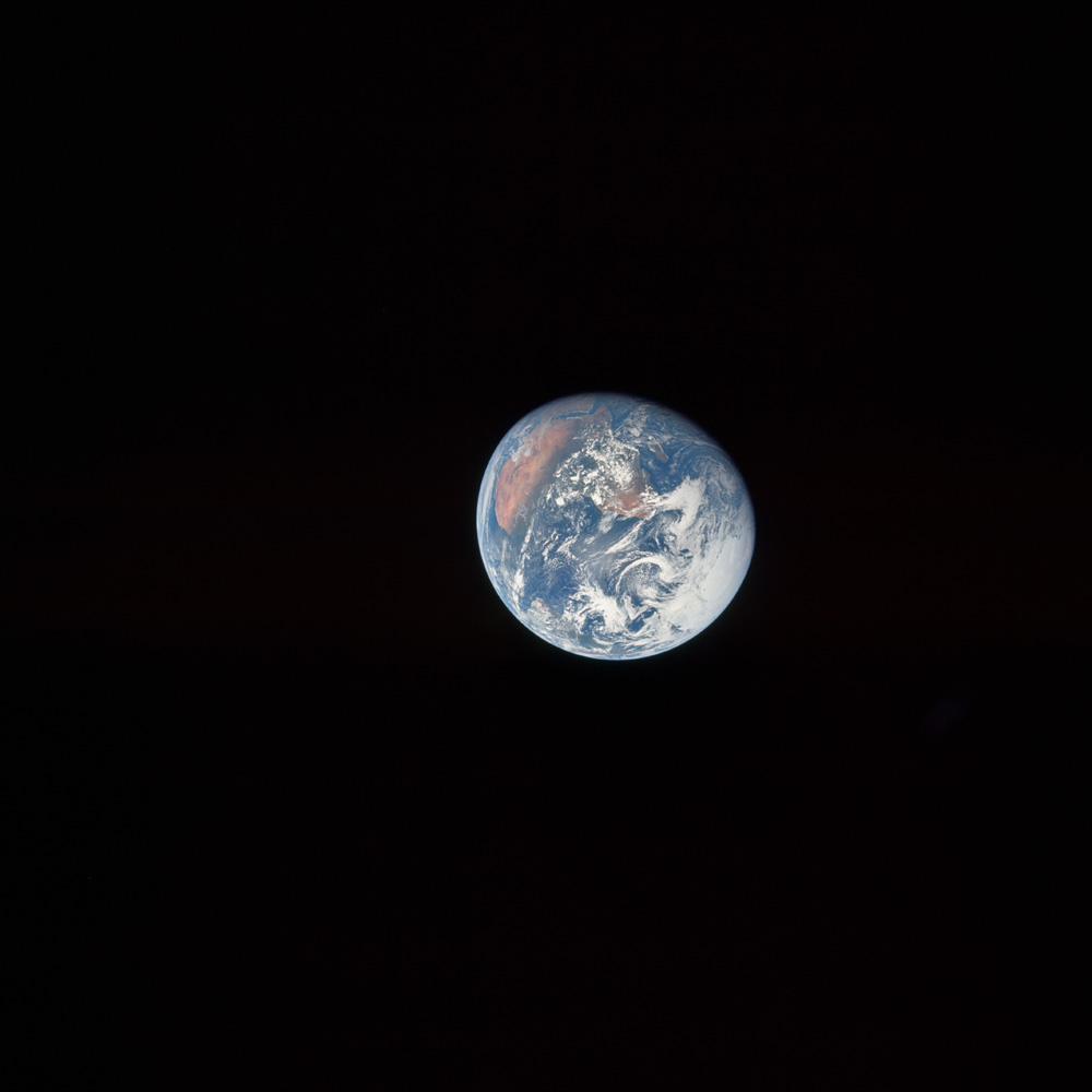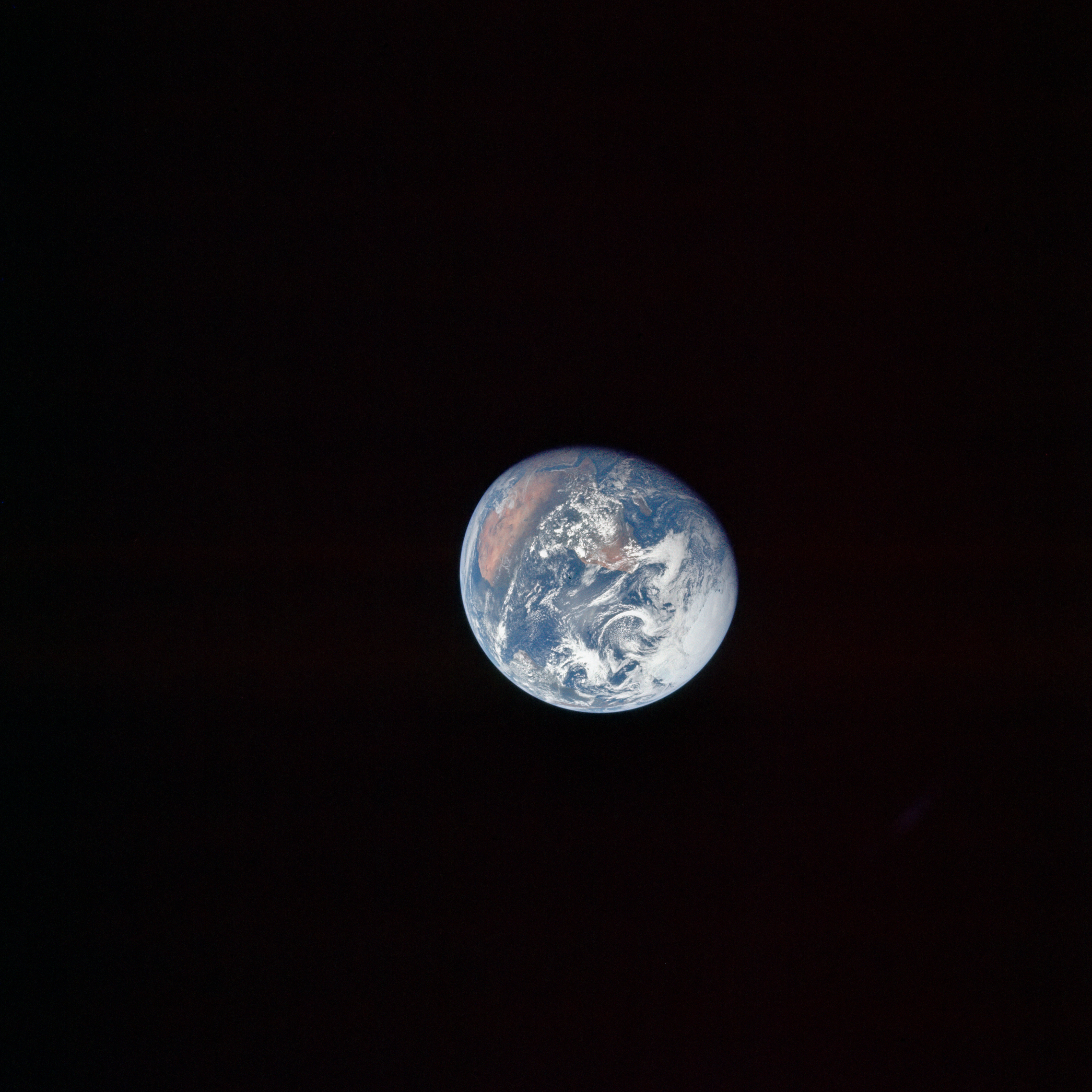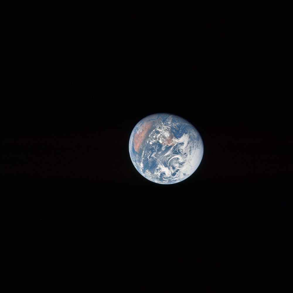 005:49:50 Schmitt: Oh, yes. We got some pictures earlier. I'm going to get another one here in a minute. I'll tell you, if there ever was a fragile-appearing piece of blue in space, it's the Earth right now.