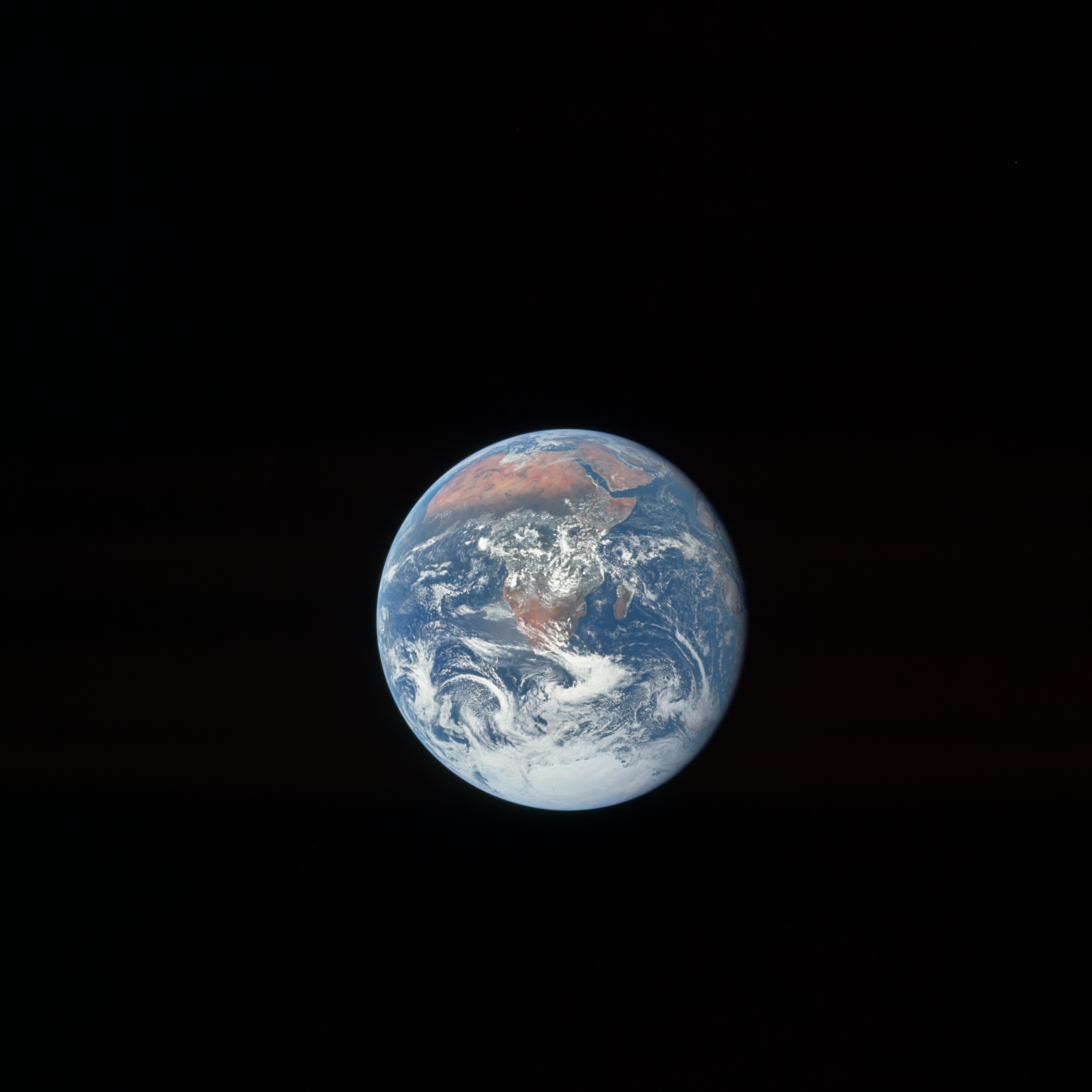 This frame count means that images 22734 to 22736 have just been taken. In these images, Earth appears distinctly less 'full' than it was when the Blue Marble images were taken less than three hours ago. Despite the spacecraft's west to east trajectory, which is taking them away from the Earth-Sun line, Earth's rotation has caught up with them and Africa has turned more into view now as it approaches the sunset terminator. They are still shooting with the 80-mm lens on the Hasselblad but when they return to photographing Earth after their rest period, they will switch to the 250-mm lens.