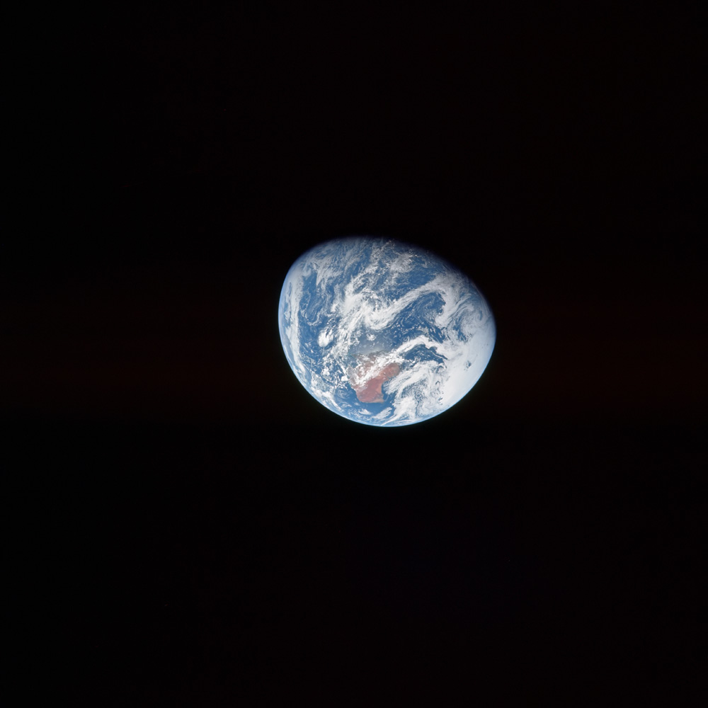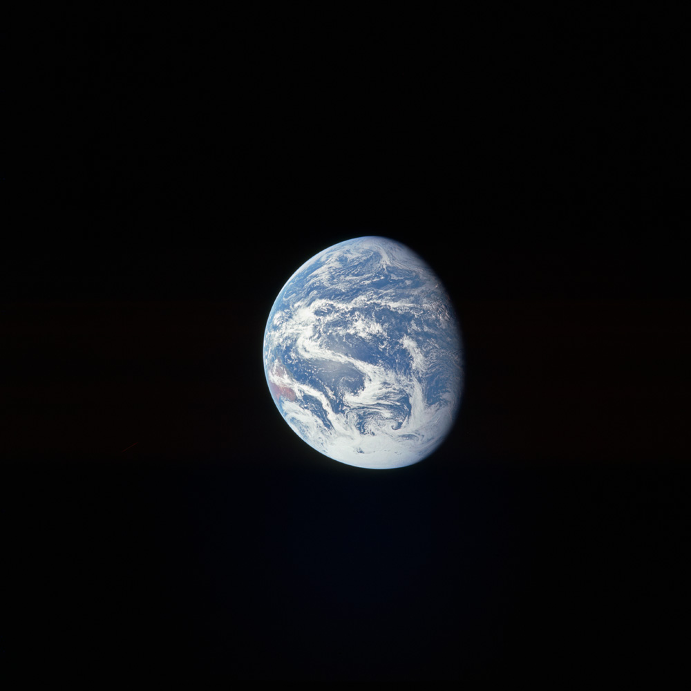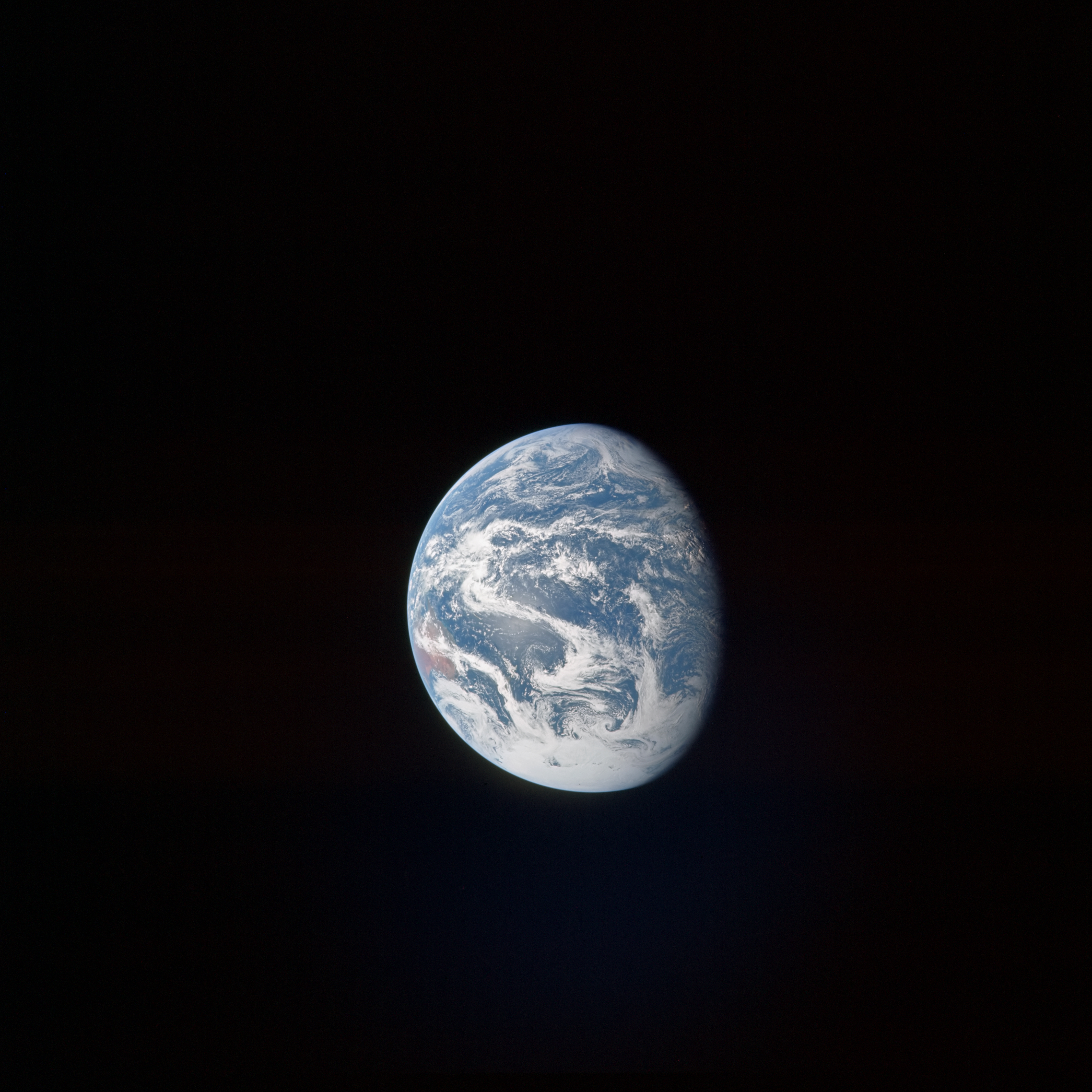 020:02:39 - That was Jack Schmitt giving us the description of the weather patterns developing off the northwest coast of Antarctica and extending up towards New Zealand and Australia. Apollo 17 at the present time is about 85,500 nautical miles [158,350 km] from Earth and situated over the south Pacific. The spacecraft now essentially fixed with the respect to the Earth and Moon, but the Earth rotating beneath it as the Earth rotates...
