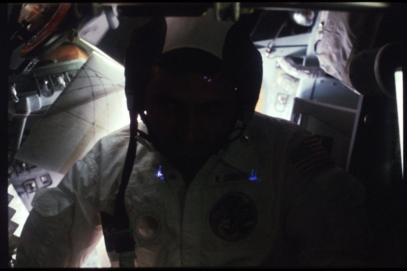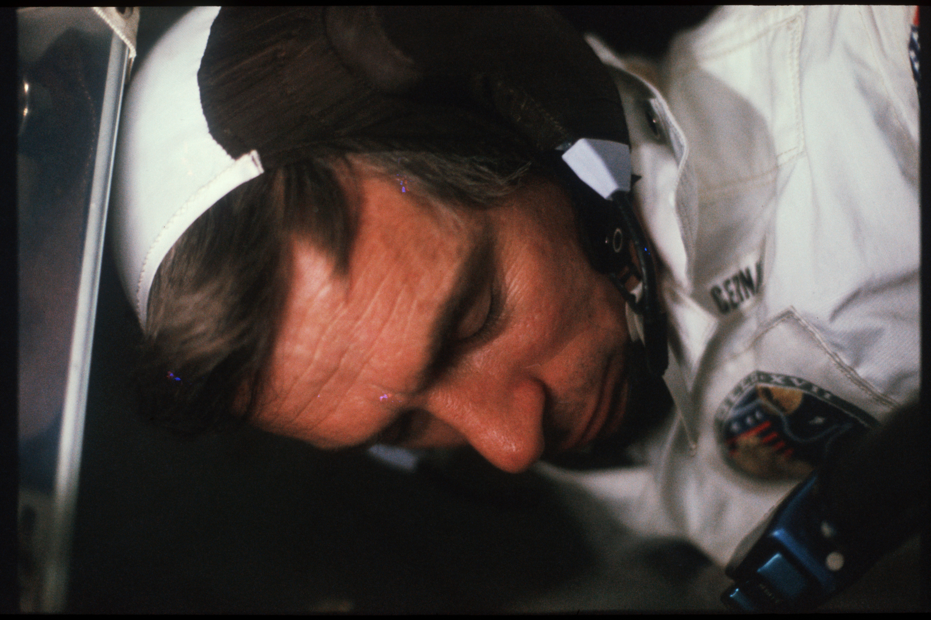 024:35:55 - This is Apollo Control at 24 hours, 36 minutes. As Gene Cernan says goodnight, Apollo 17 is 99,714 nautical miles [184,670 km] from Earth; velocity, 5,114 feet per second [1,559 m/s]. The Lunar Module Pilot, Jack Schmitt, will be wearing the communications headset and the biomedical harness for the sleep period tonight.