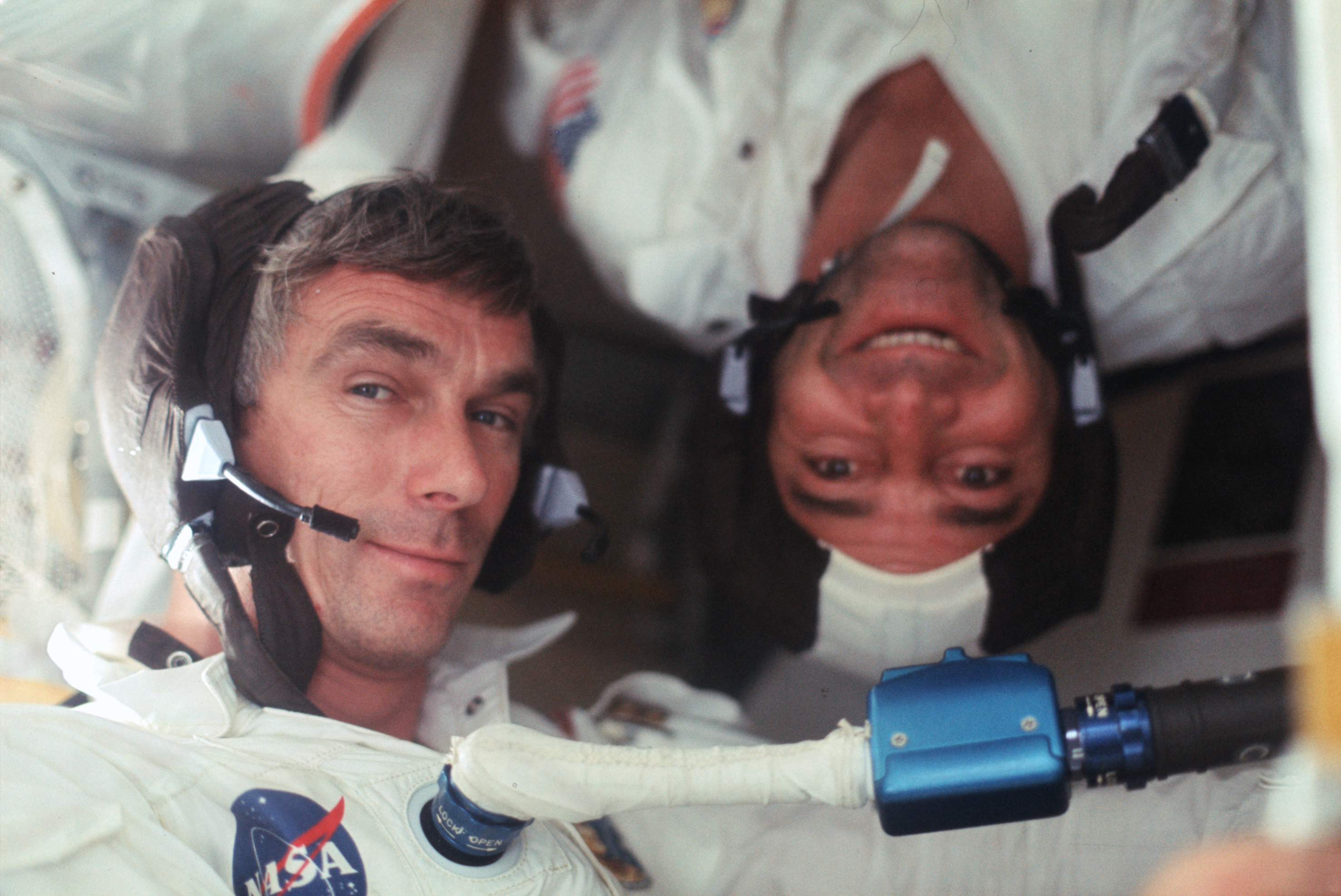 Gene Cernan (left) and Ron Evans in the Command Module during trans-Earth coast - research: Eric Jones