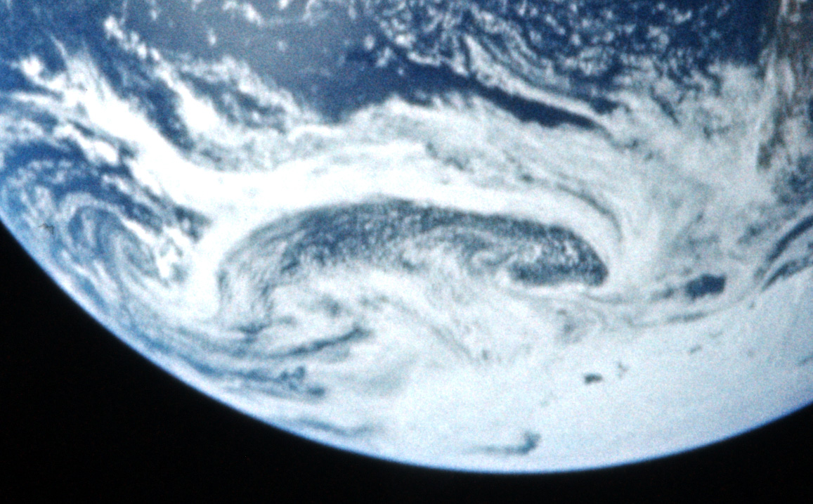 064:25:15 Cernan: There is some tremendous - on the western side of that curve front is a tremendous clockwise rotational airmass. It must cover hundreds of square miles. The one down near - near the continent of Antarctica, down there, near the tip of South America, seemed to be squashed slightly as if there is possibly some - some squashing or effect coming off - off the South Pole area near Antarctica. I think, if I turn around and look at it the way Jack was looking at it, it's a cap of a mushroom. Only instead of simply curving in underneath the cap, it has clockwise rotations on both sides as it curves under.