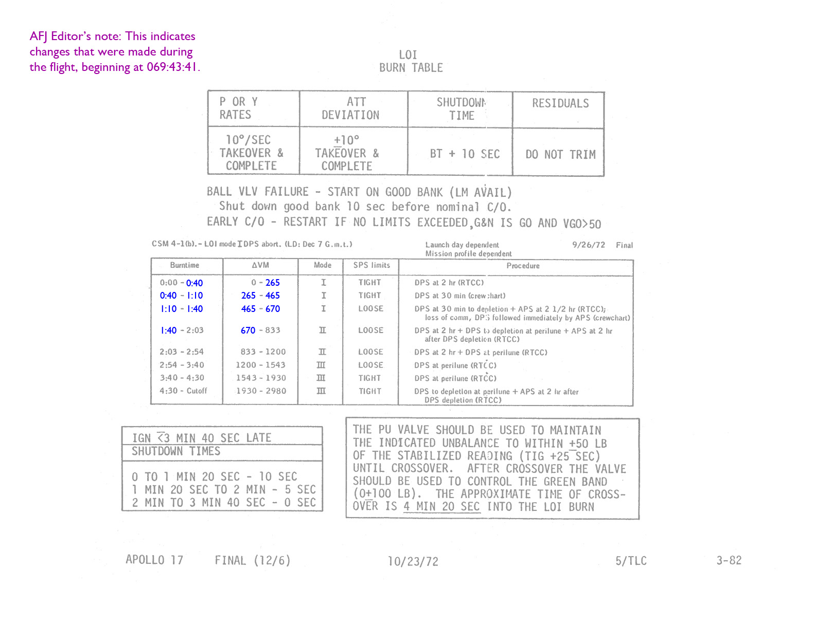 068:07:20 Cernan: Okay, Bob. For the ALFMED, CDR will be in the left seat. CMP will be in the center seat with the ALFMED. For our reporting, when we get to VOX, we'll just call out our first names to shorten it and the comments following. And Jack will be recording.
