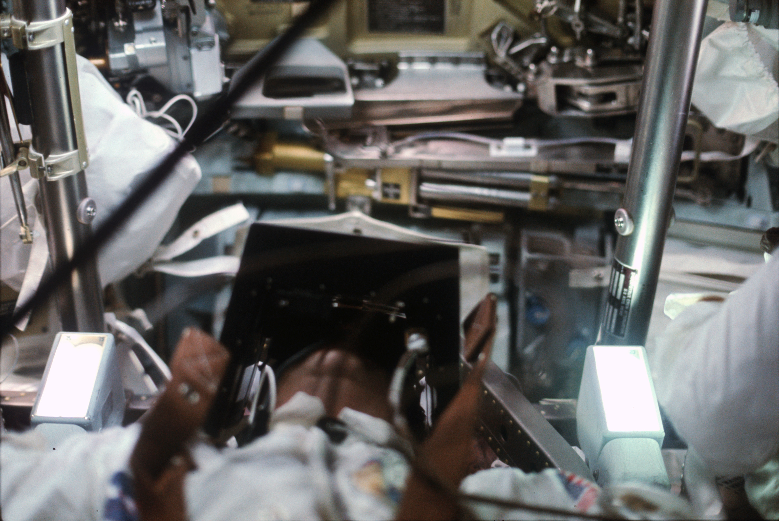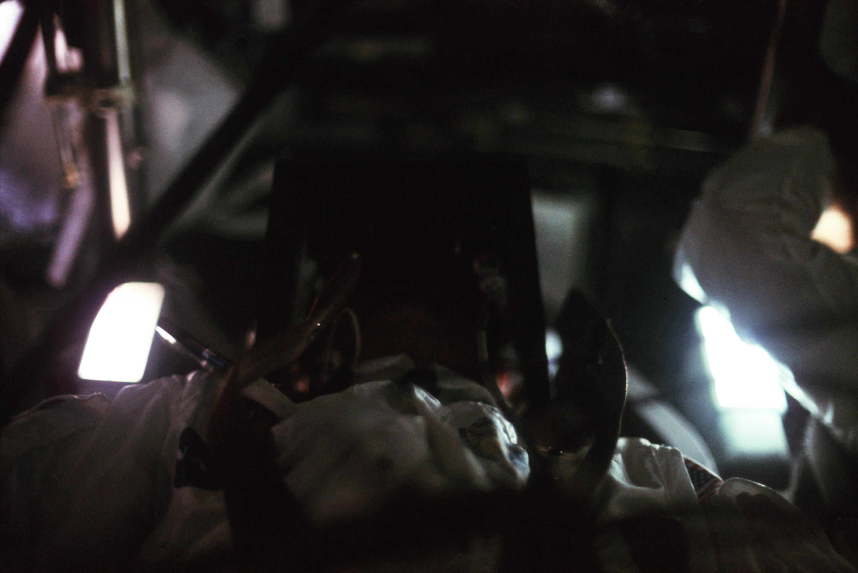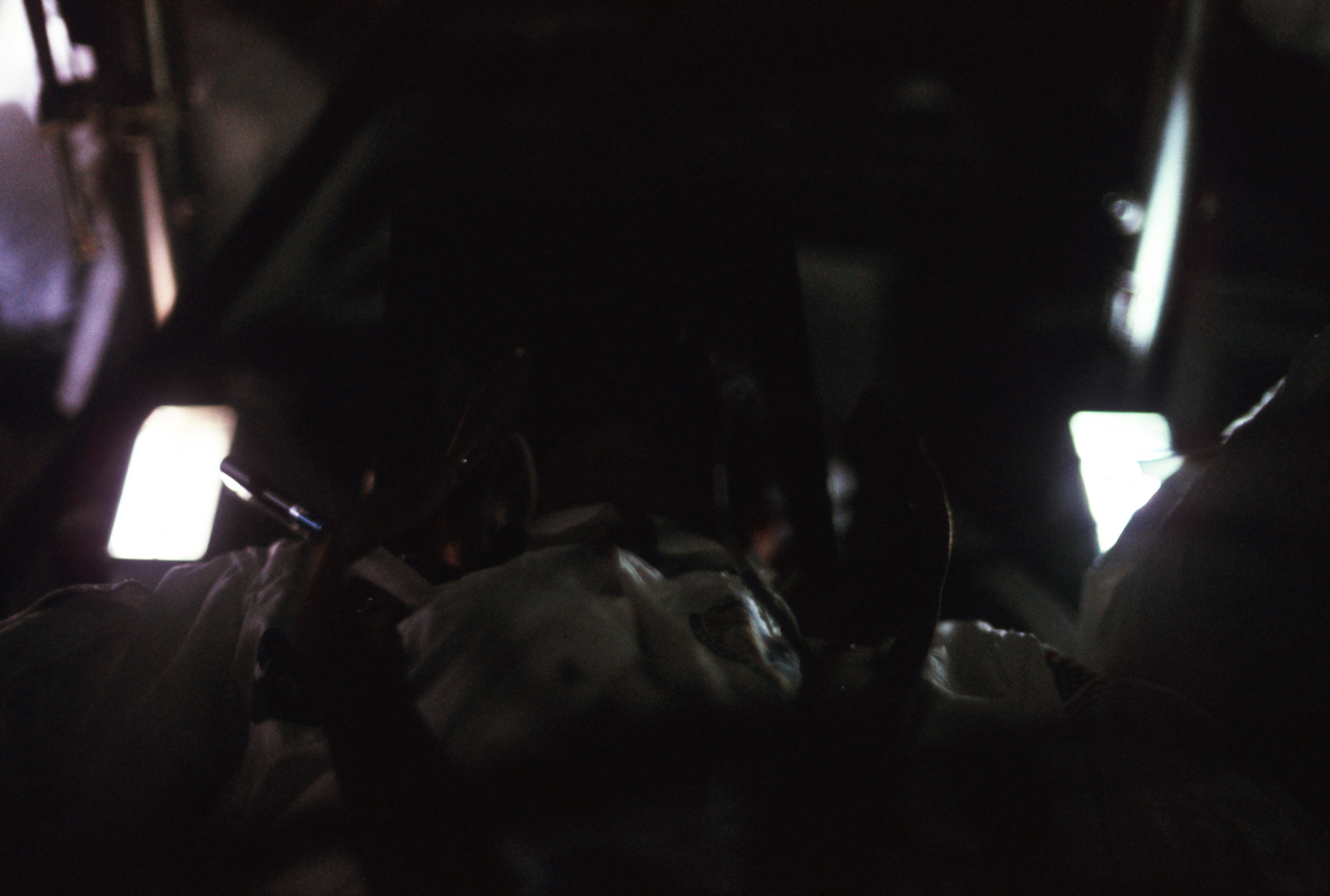 Cernan (onboard): Okay, Ron. Can you let me get down here? And put your legs down, and I'll get a bottom shot.