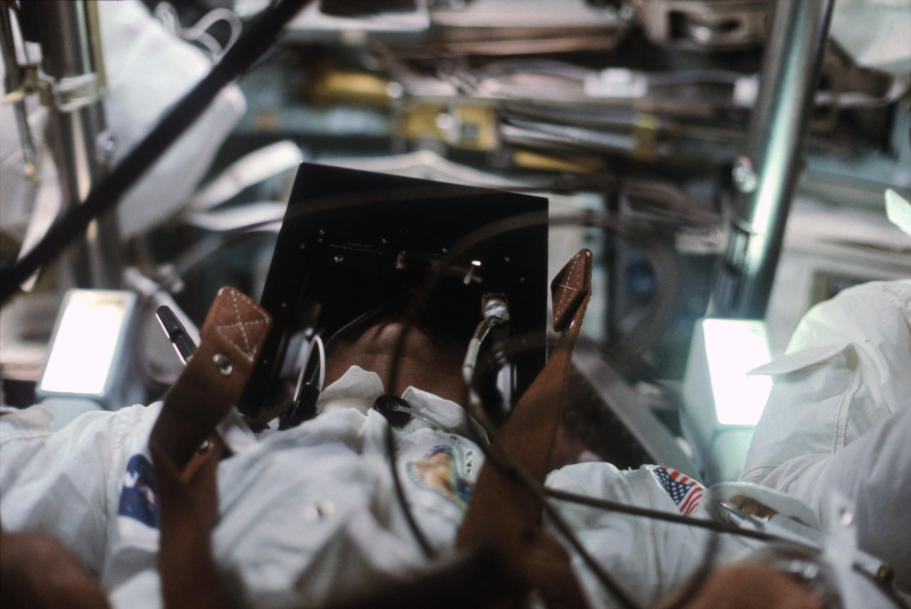 068:18:45 Cernan: Hello, Houston. CDR put his blindfold on at 68:18.