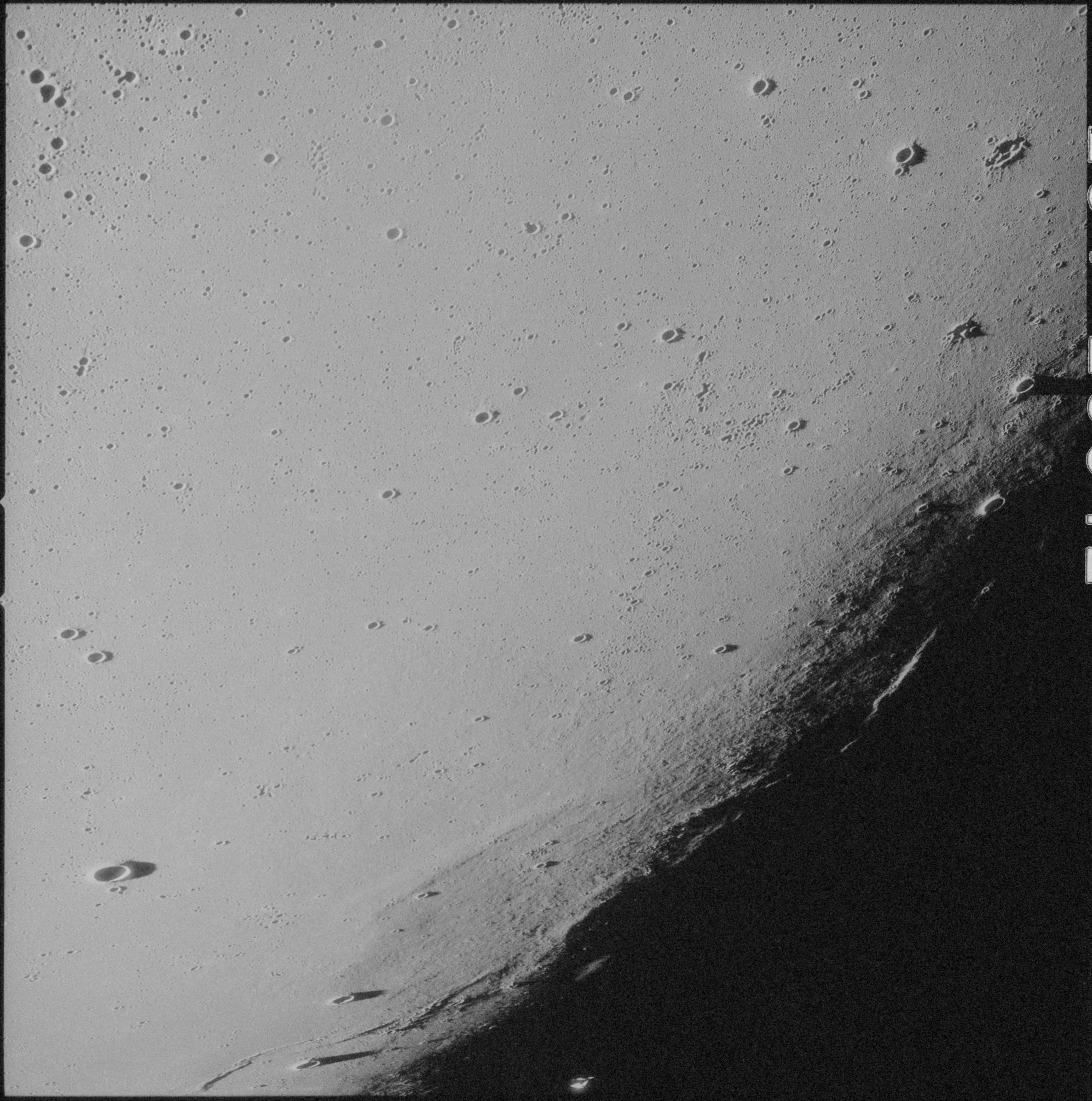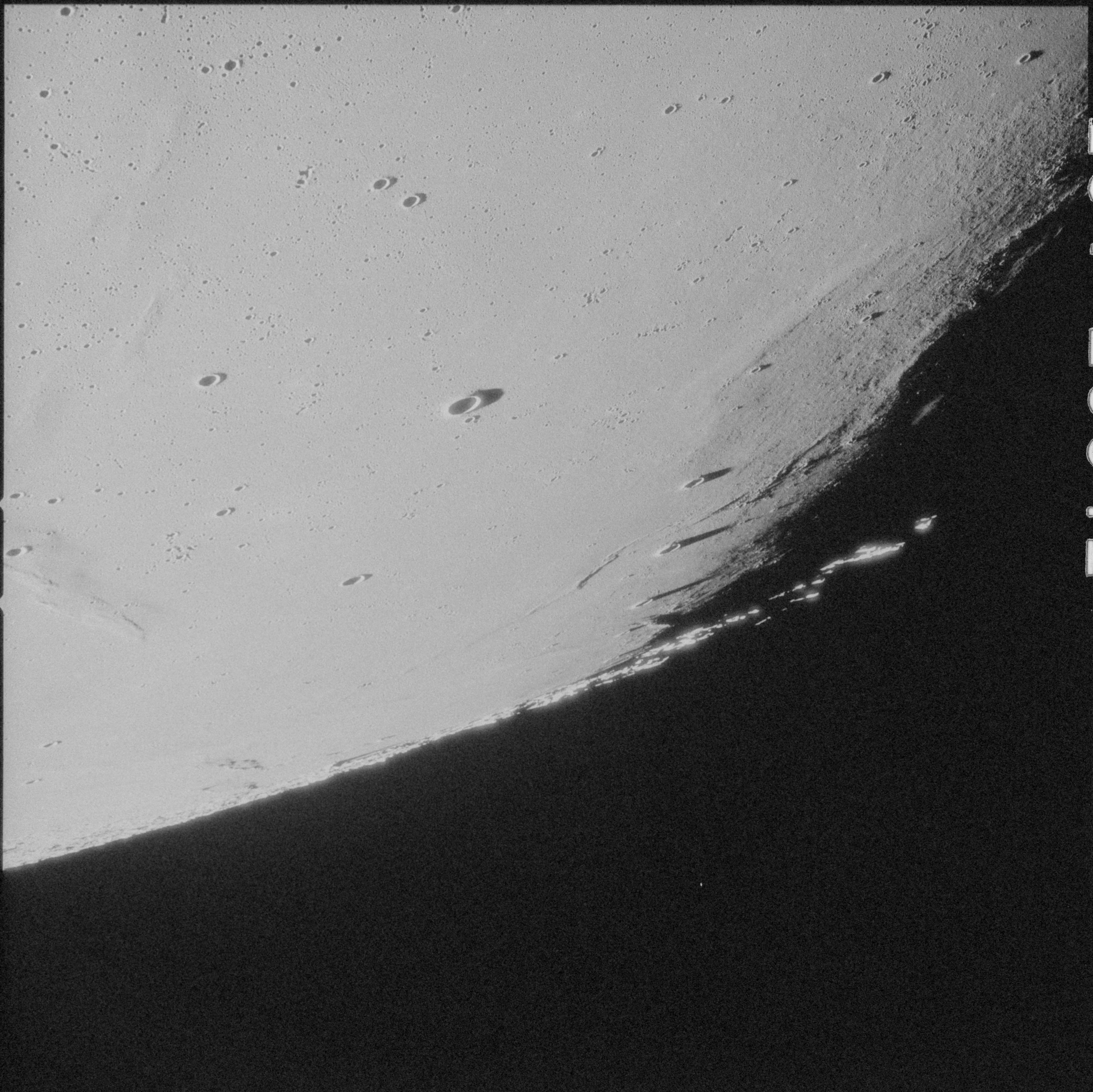093:46:36 Evans: There it is. T-horizon will be good. Yeah. Okay, I've got the edge of Crisium now. [Garble.] Getting hills on the side of Crisium, there. [Pause.] Sure a lot smoother-looking material than I thought it would be.