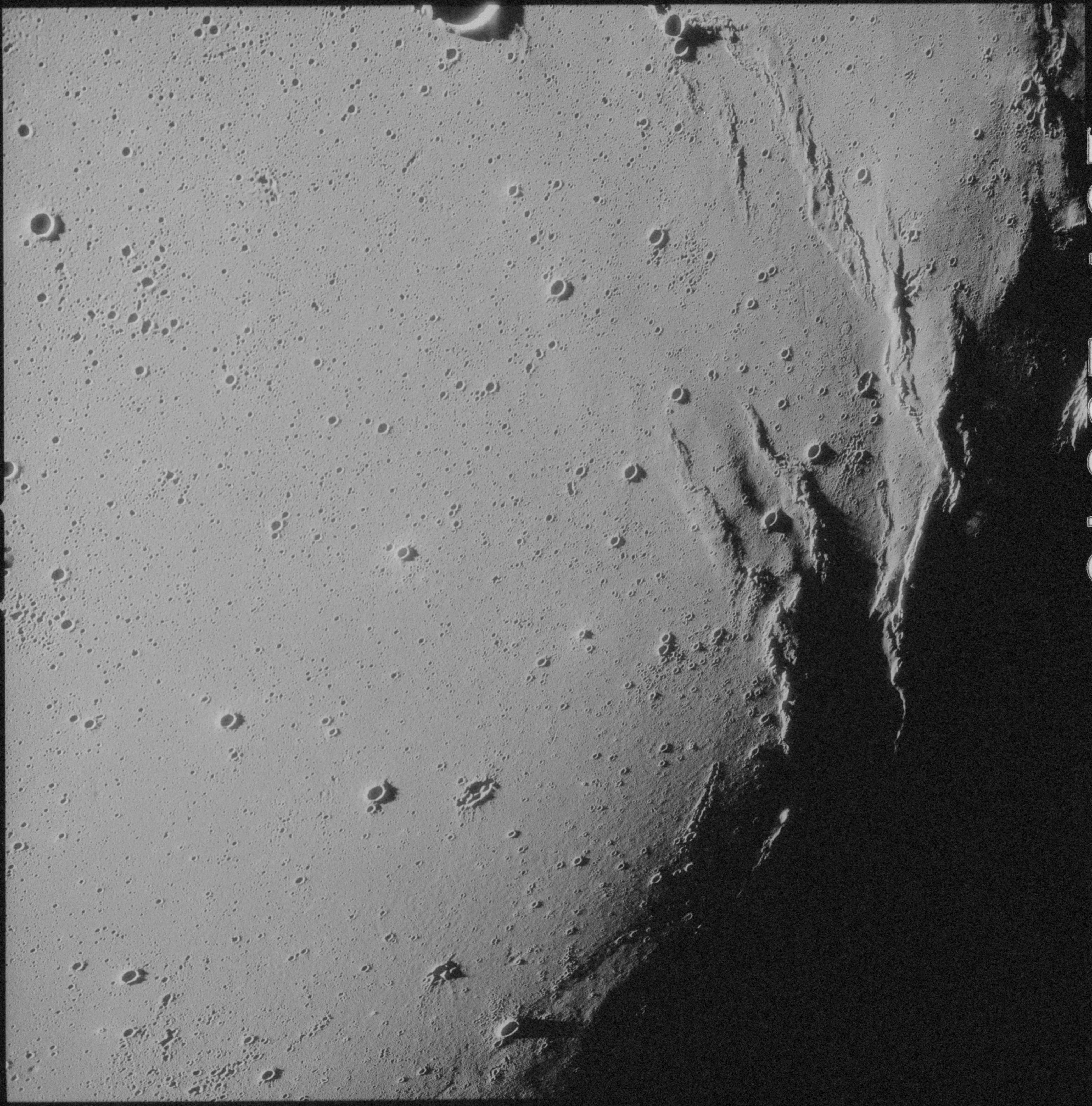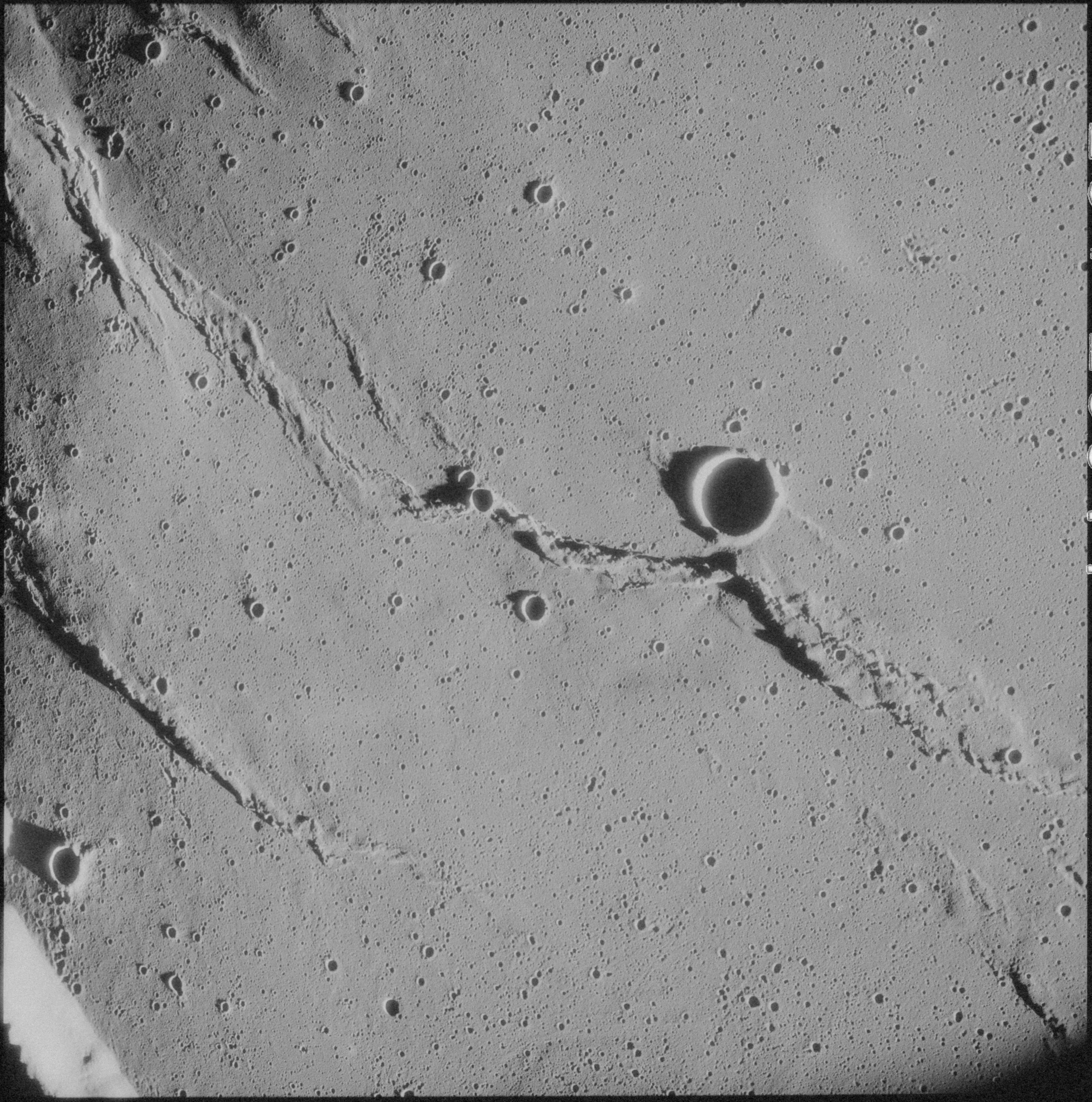 093:45:51 Schmitt: Some of the boys might be interested to know that in a place where the Sun is just grazing the slope - it's a steep slope on the north rim of Crisium, I can see the horizontal lineaments that were such a controversy on 15.