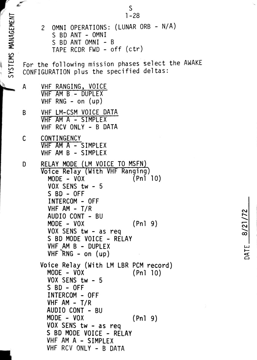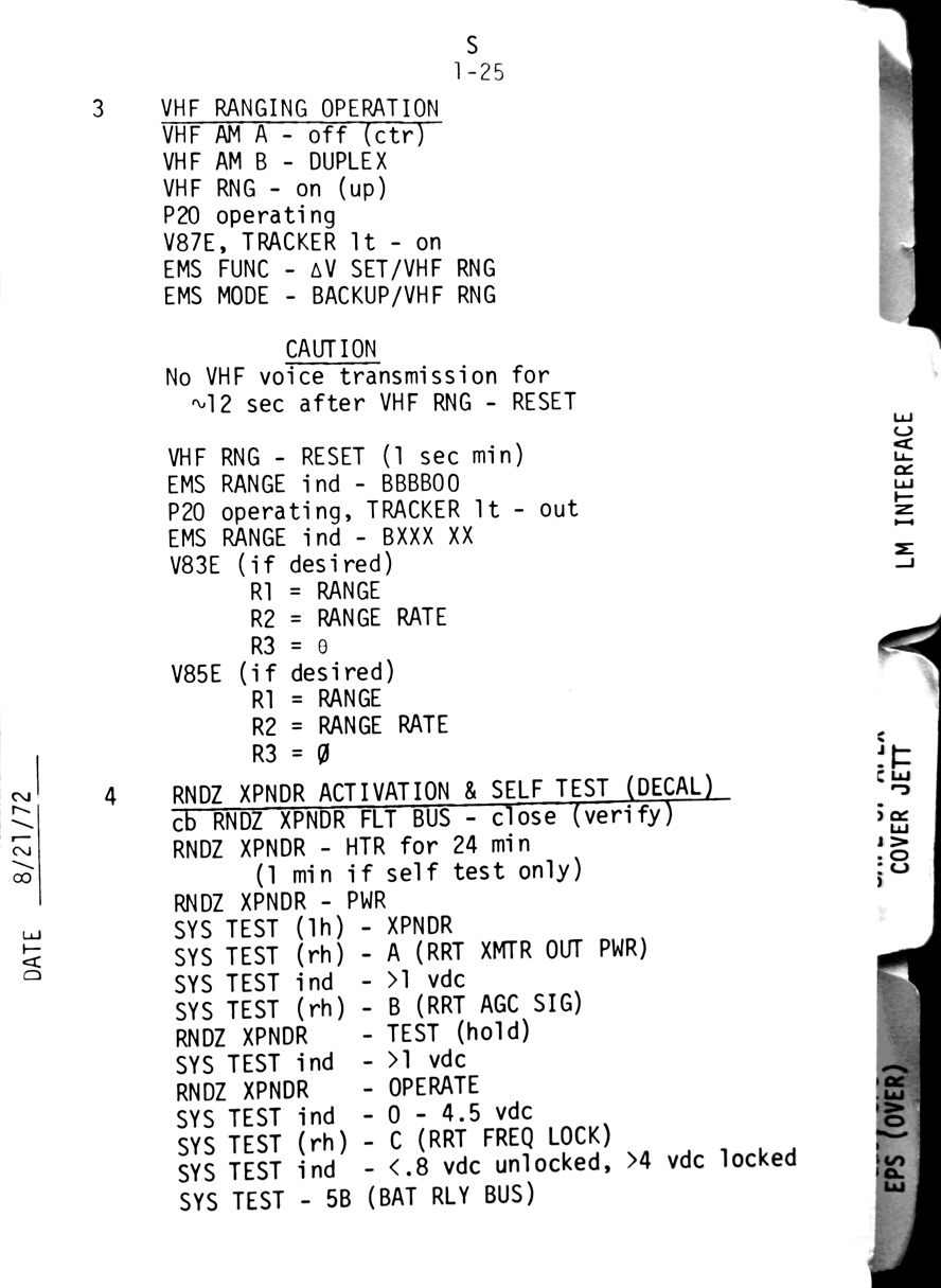 - 1-25 Telecomm - VHF ranging operation, Rendezvous transponder activation & self test